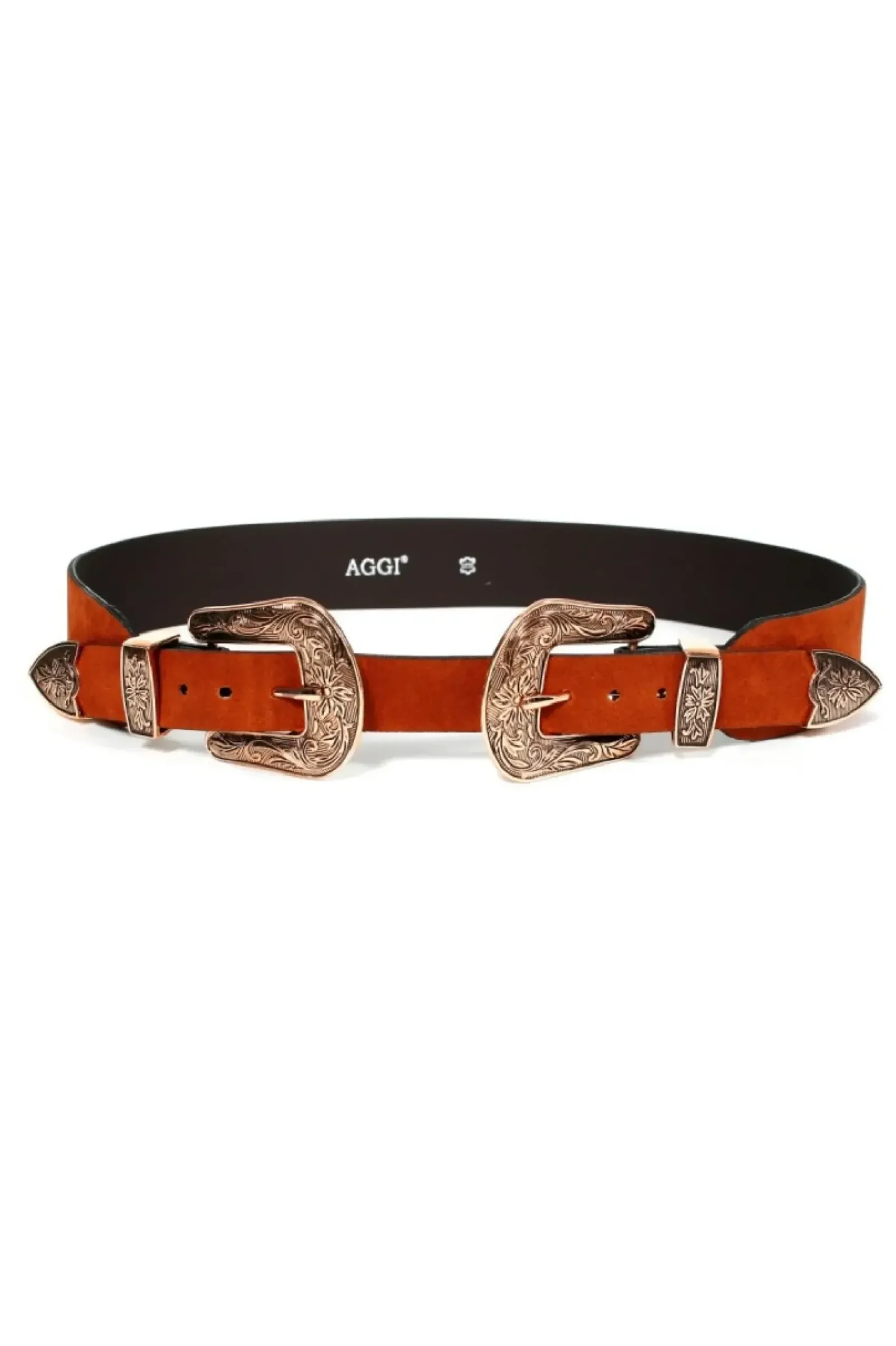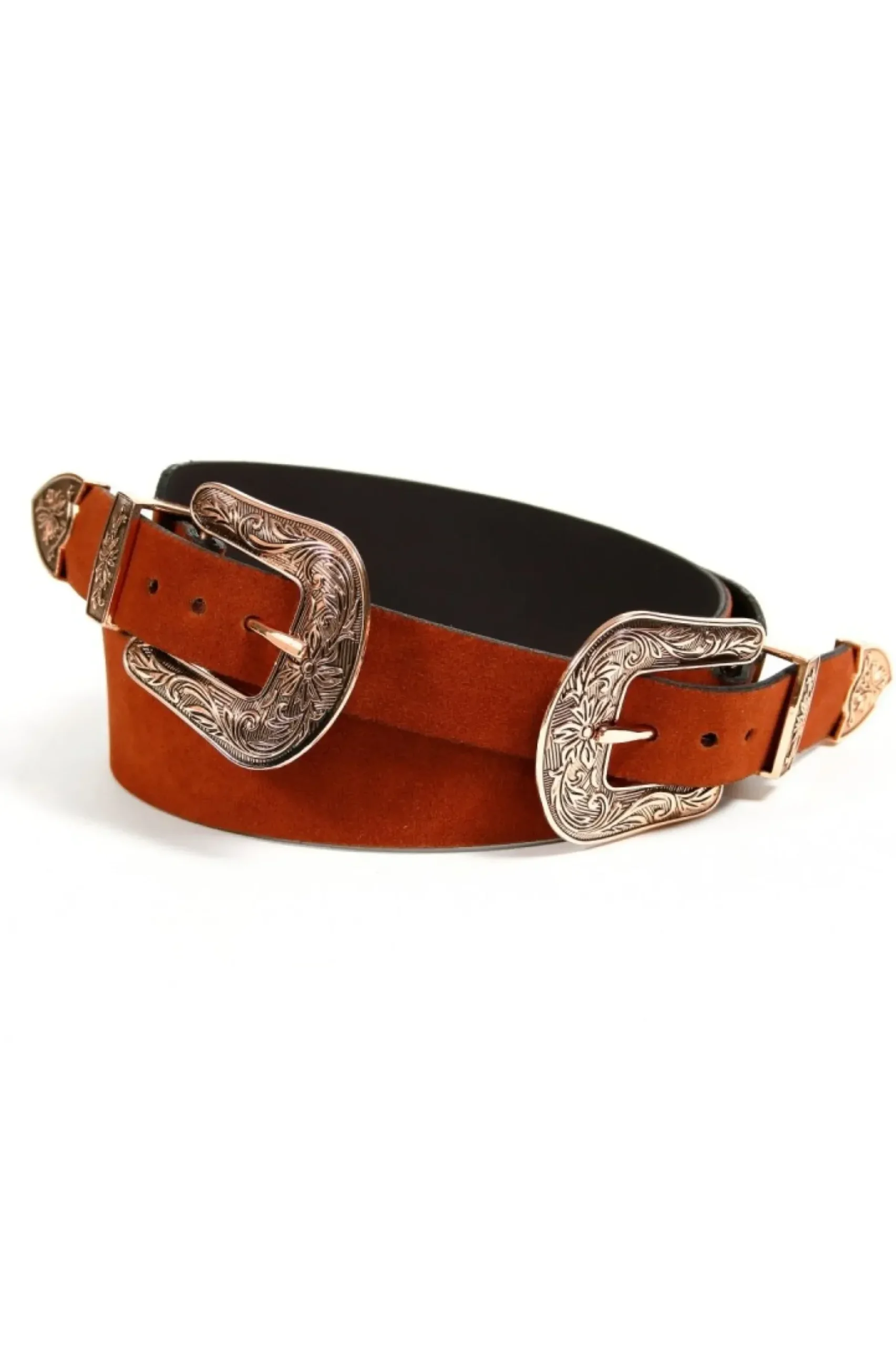 Kobieta AGGI Akcesoria Paski>Pasek Skorzany Dwie Klamerki Ornament Cynamonowy Zamszowy