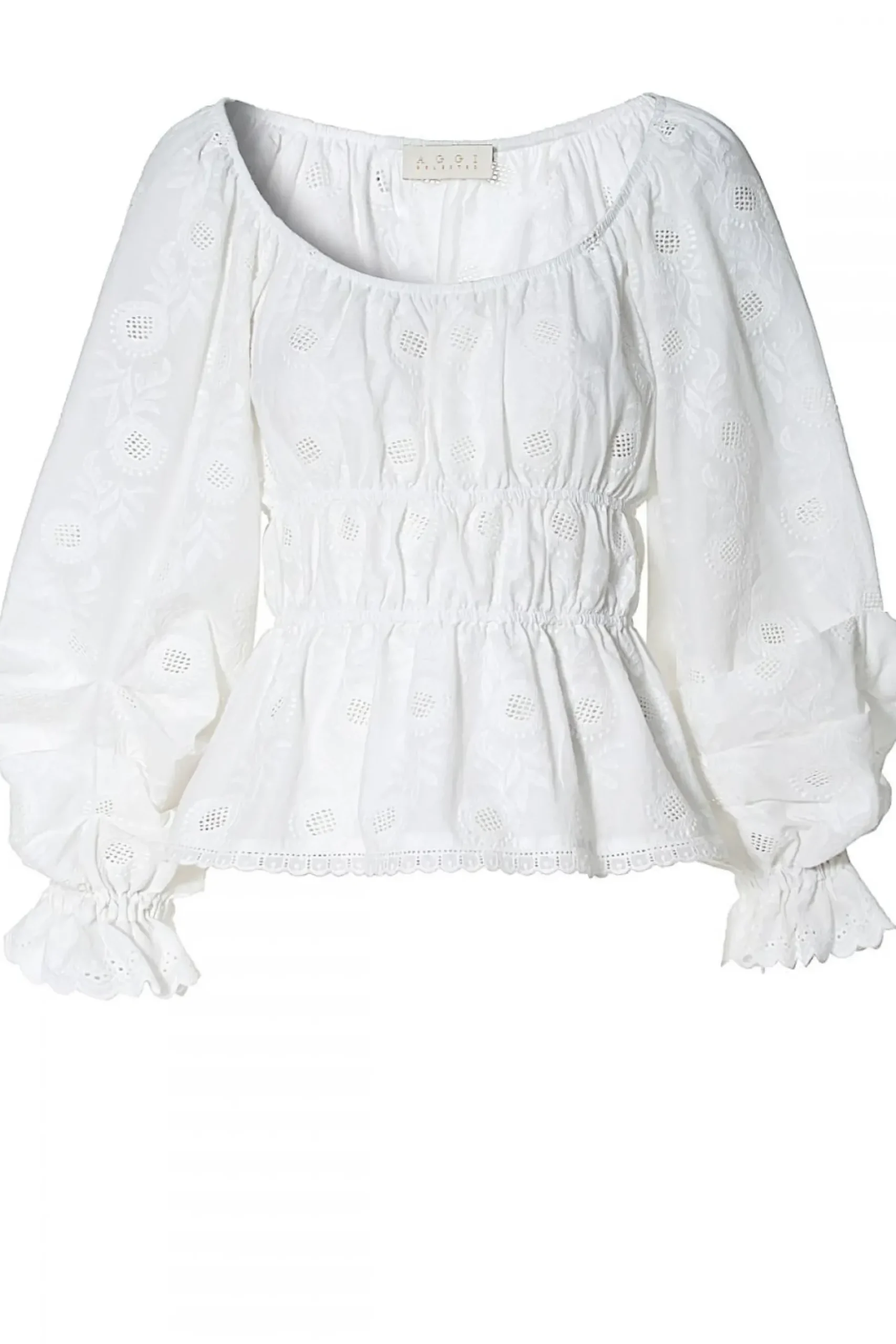 Bluzka W Romantycznym Klimacie Boho Uszyta Ze 100% Bawelny. Szlachetny Bawelniany Batyst Pokryty Misternym Haftem. Marszczona Linia Dekoltu Pozwala Na Odkrycie Ramion. Przestrzenne, Bogate Drapowane, Balonowe Rekawy Zebrane Gumka. Piekne, Drobiazgowe Haftowane Wykonczenia U Dolu Rekawow I Dolnej Linii Bluzki.