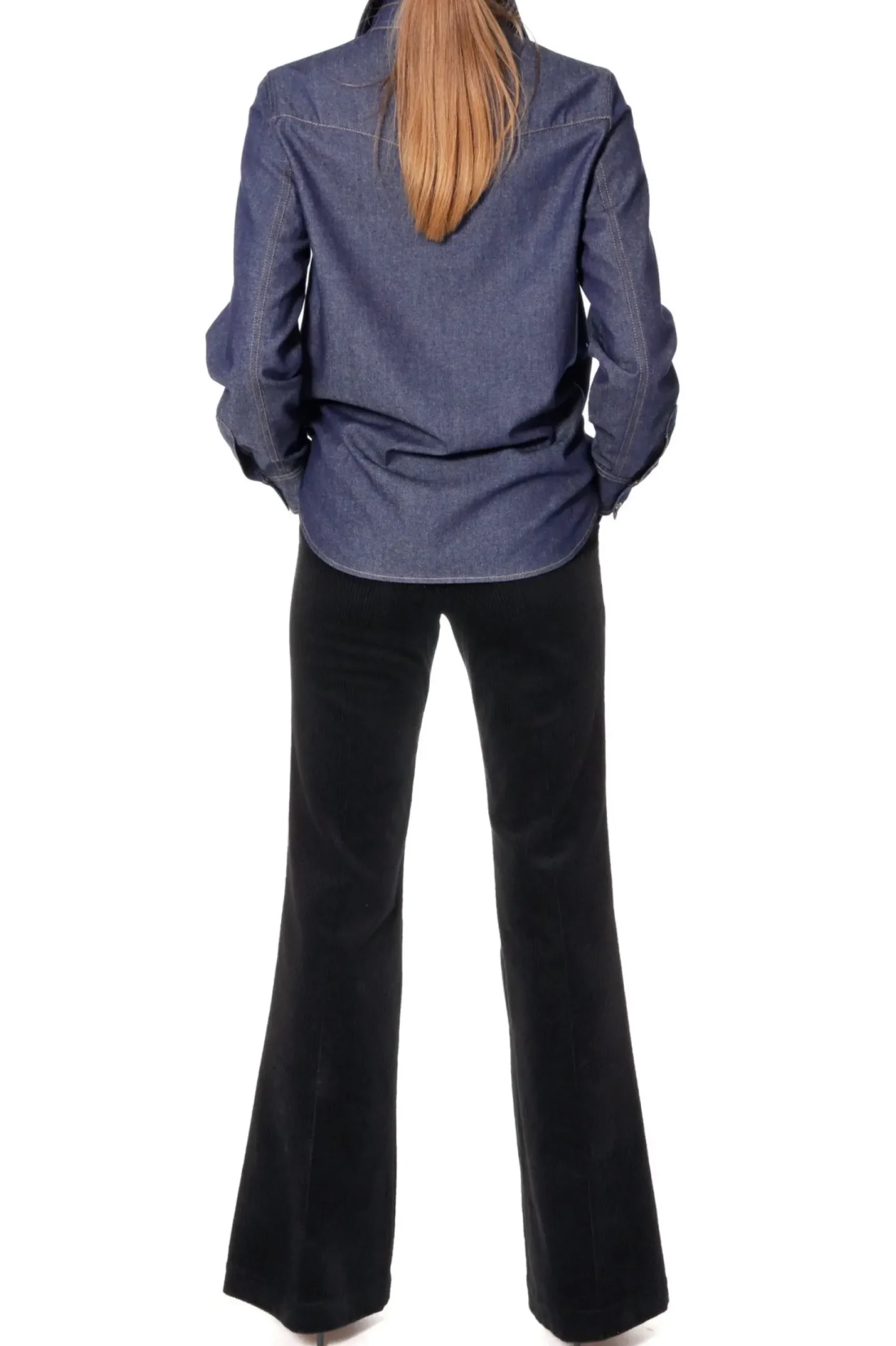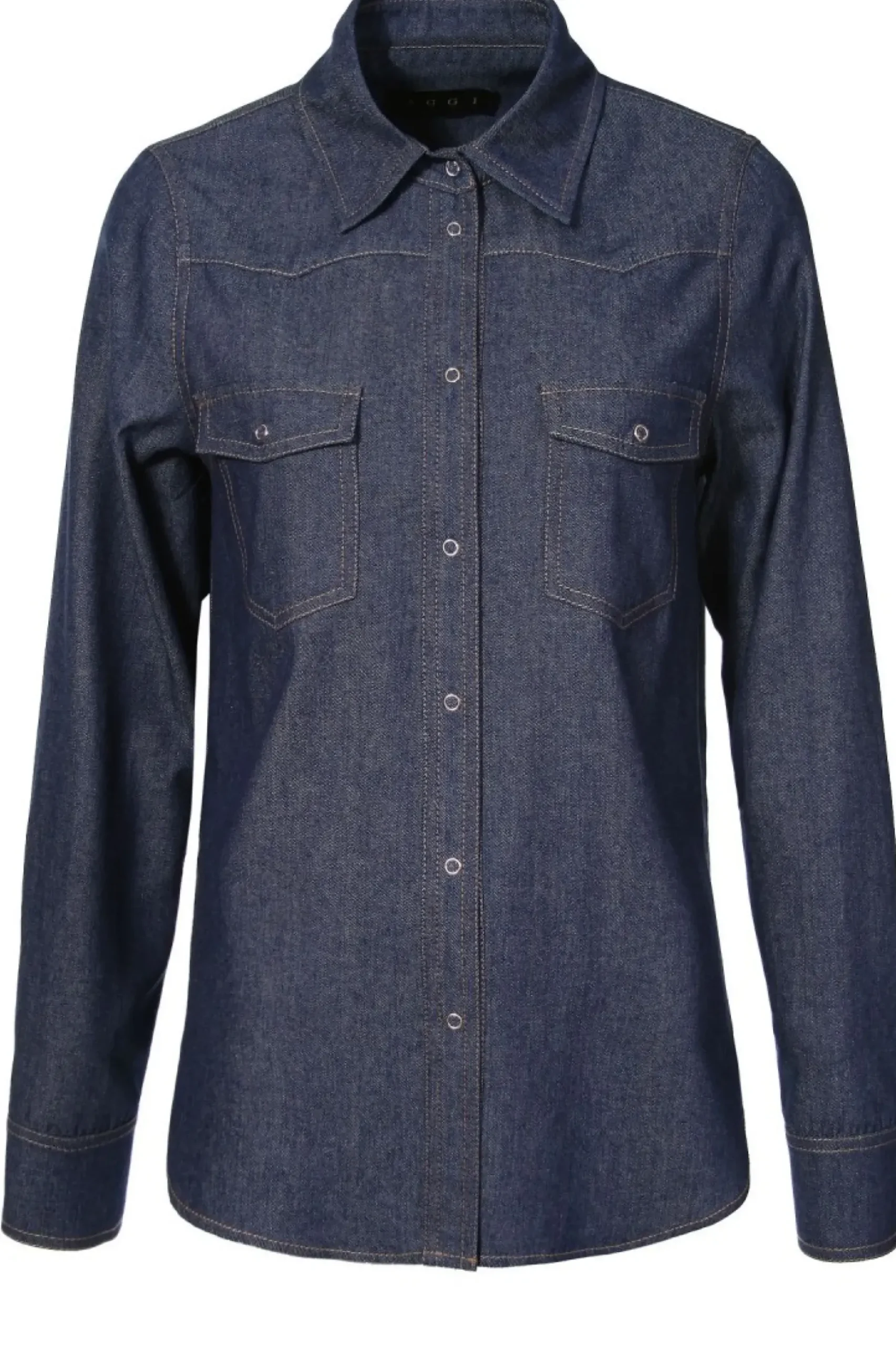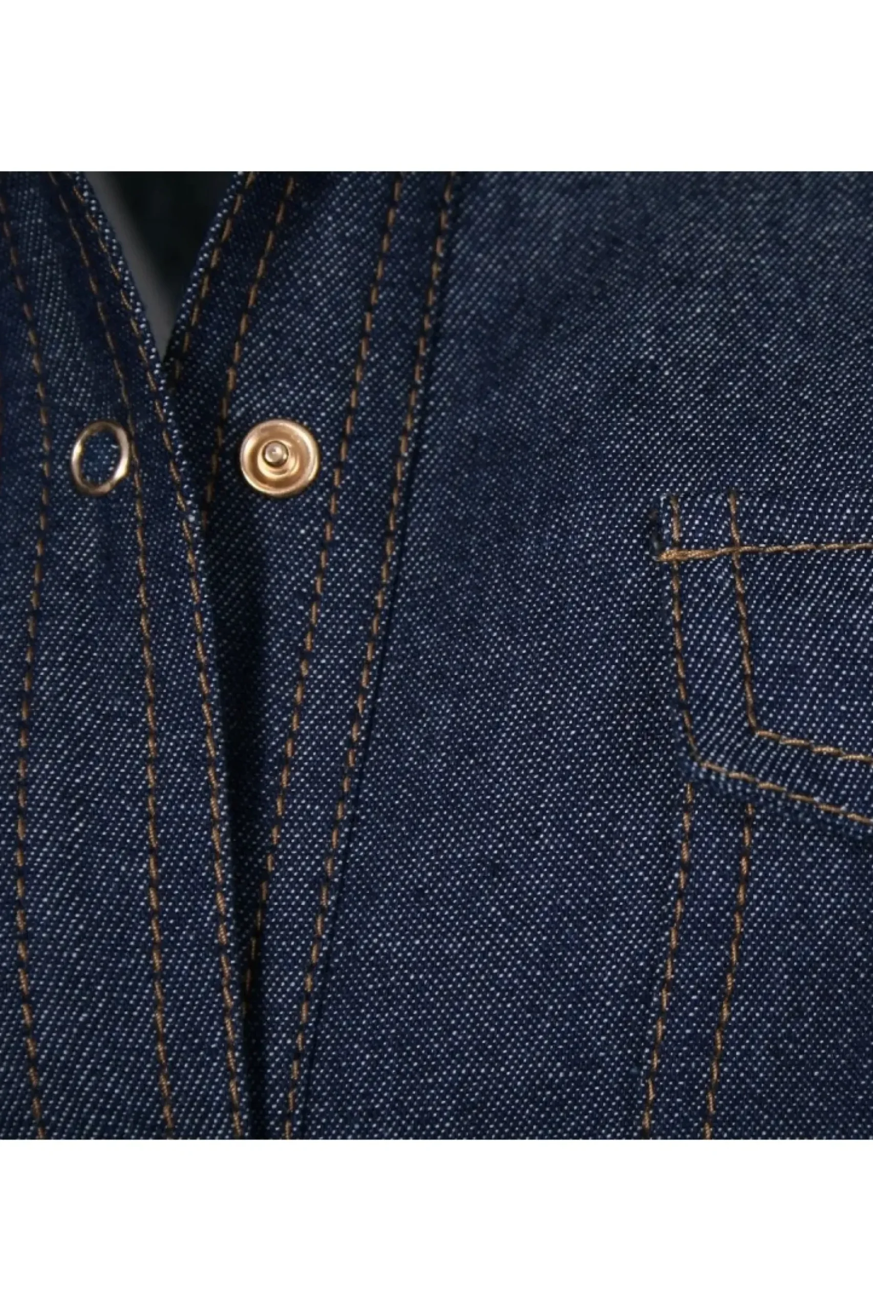 Bawelniana Koszula Jeansowa W Klasycznym, Eleganckim Odcieniu Granatu. Dekoracyjne Szwy Kontrastujace Z Ciemna Tkanina I Drobne Metalowe Napy W Kolorze Zlotym Nadaja Surowej Dzinsowej Koszuli Efektowny Wyglad. Koszula Wykonana Z Miekkiego Dzinsu O Sredniej Grubosci.