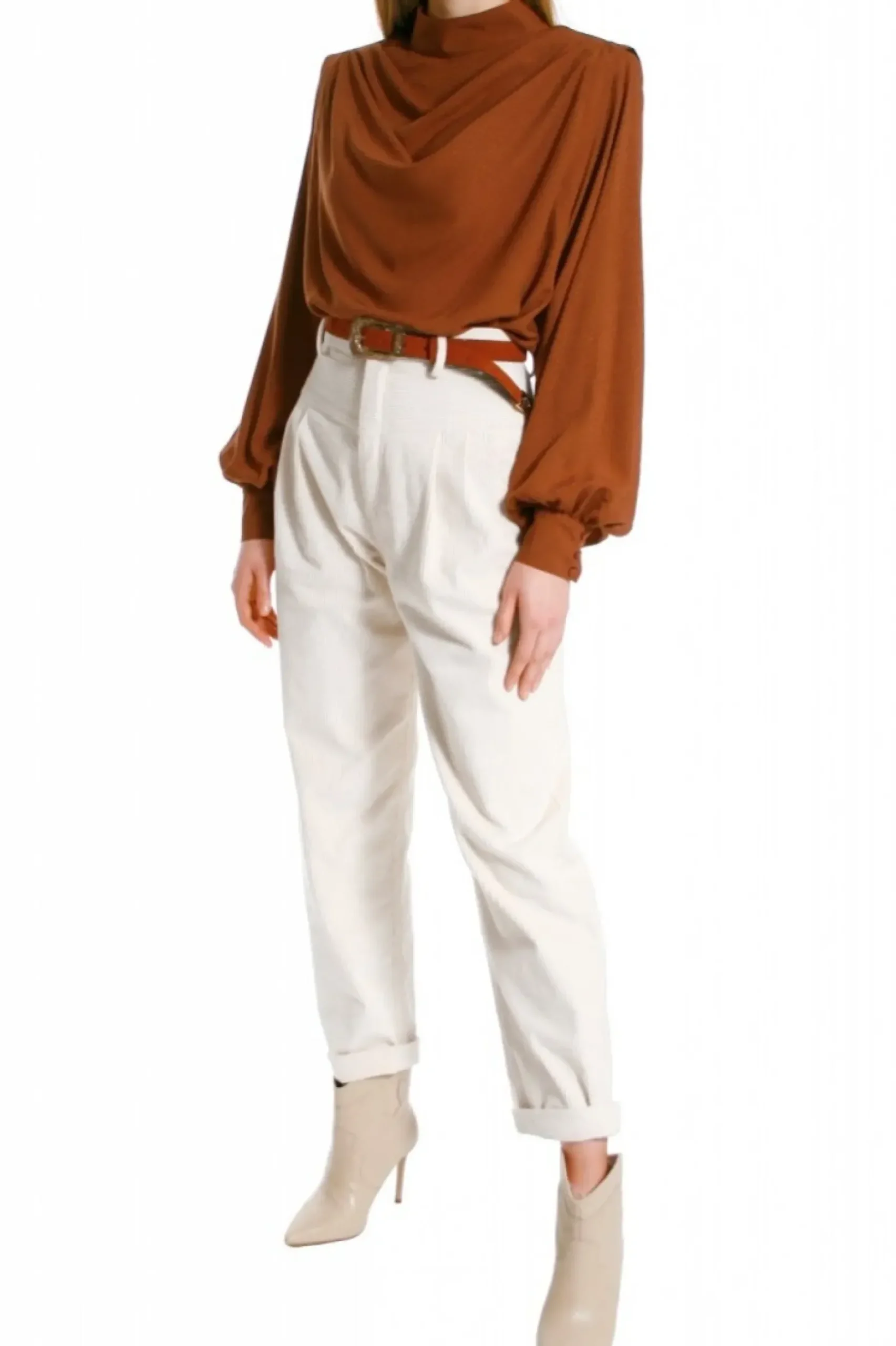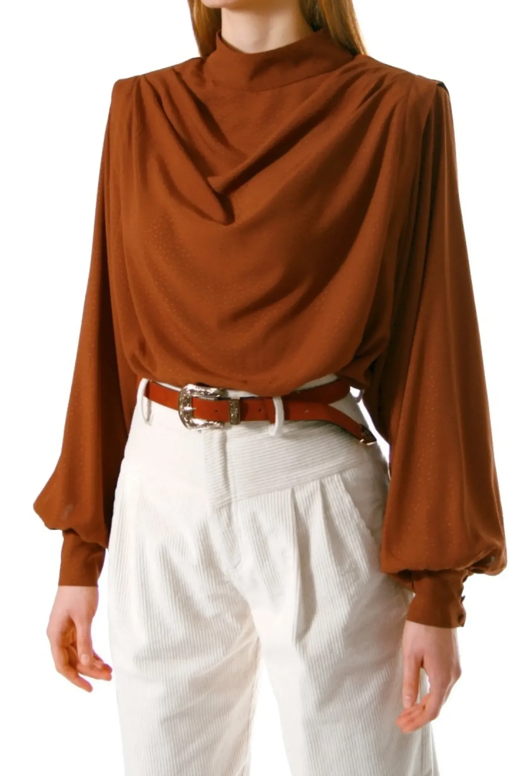 Bluzka Uszyta Z Lejacej Sie Tkaniny Cupro O Zakardowym Splocie. Dekolt-Stojka Zapinany Na Oblekane Guziki Z Petelka. Wyrazista Linia Ramion Podkreslona Poduszkami Dopinanymi Na Rzepy. Na Ramionach Zakladki Tworzace Przestrzenne Drapowania Z Przodu Bluzki. Luzne, Obfite Rekawy Zakonczone Mankietami Zapinanymi Na Male Oblekane Guziki. Projekt Nos Ze Spodnica Lub Spodniami Wlozony Do Srodka.