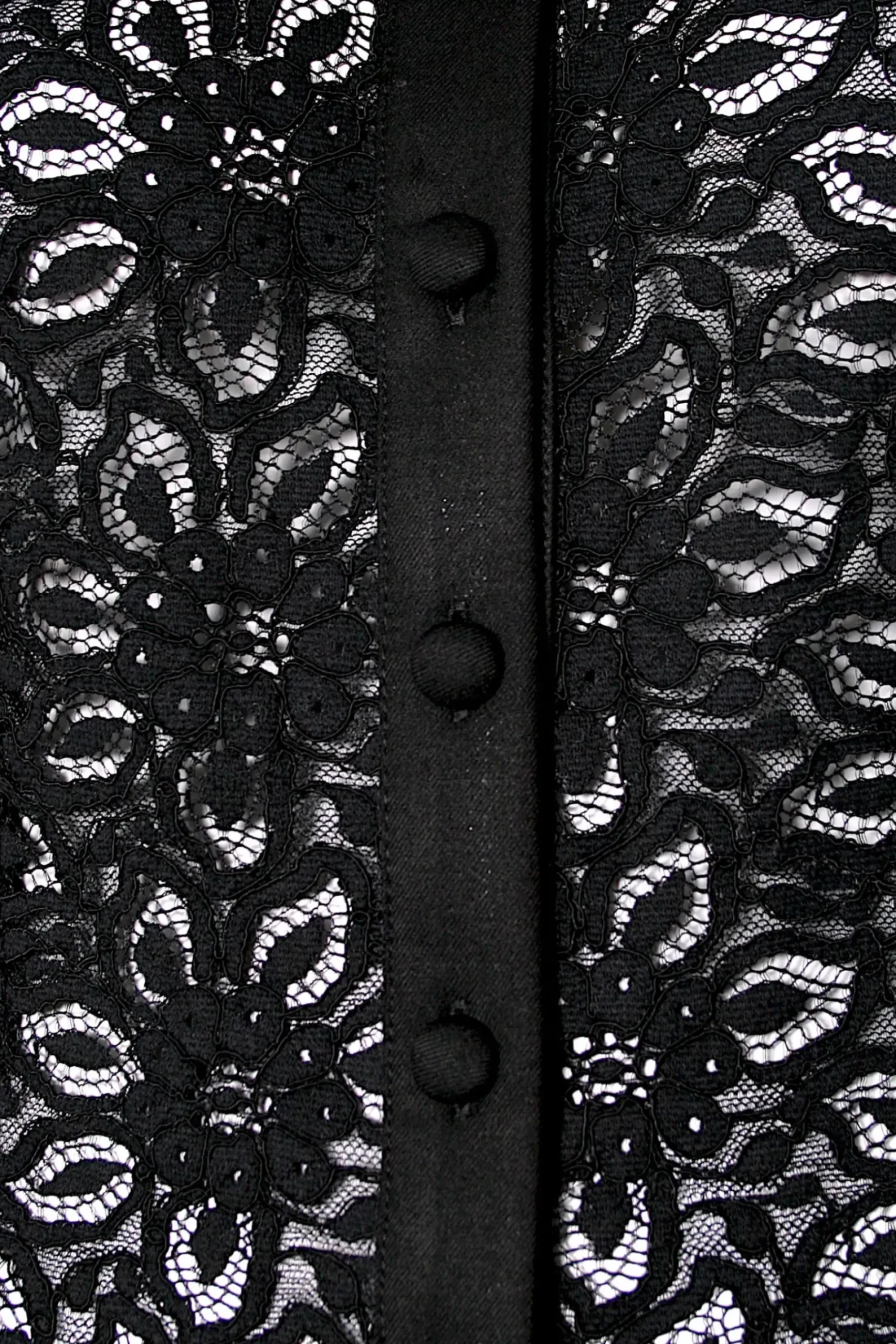 Bluzka Z Dlugimi Rekawami Wykonana Z Czarnej Koronki W Kwiaty. Kanciaste Ramiona, Szpiczasty Kolnierzyk Na Stojce I Detale Wykonane Z Gladkiej Tkaniny Wraz Z Oblekanymi Guzikami Tworza Calosc Projektu.