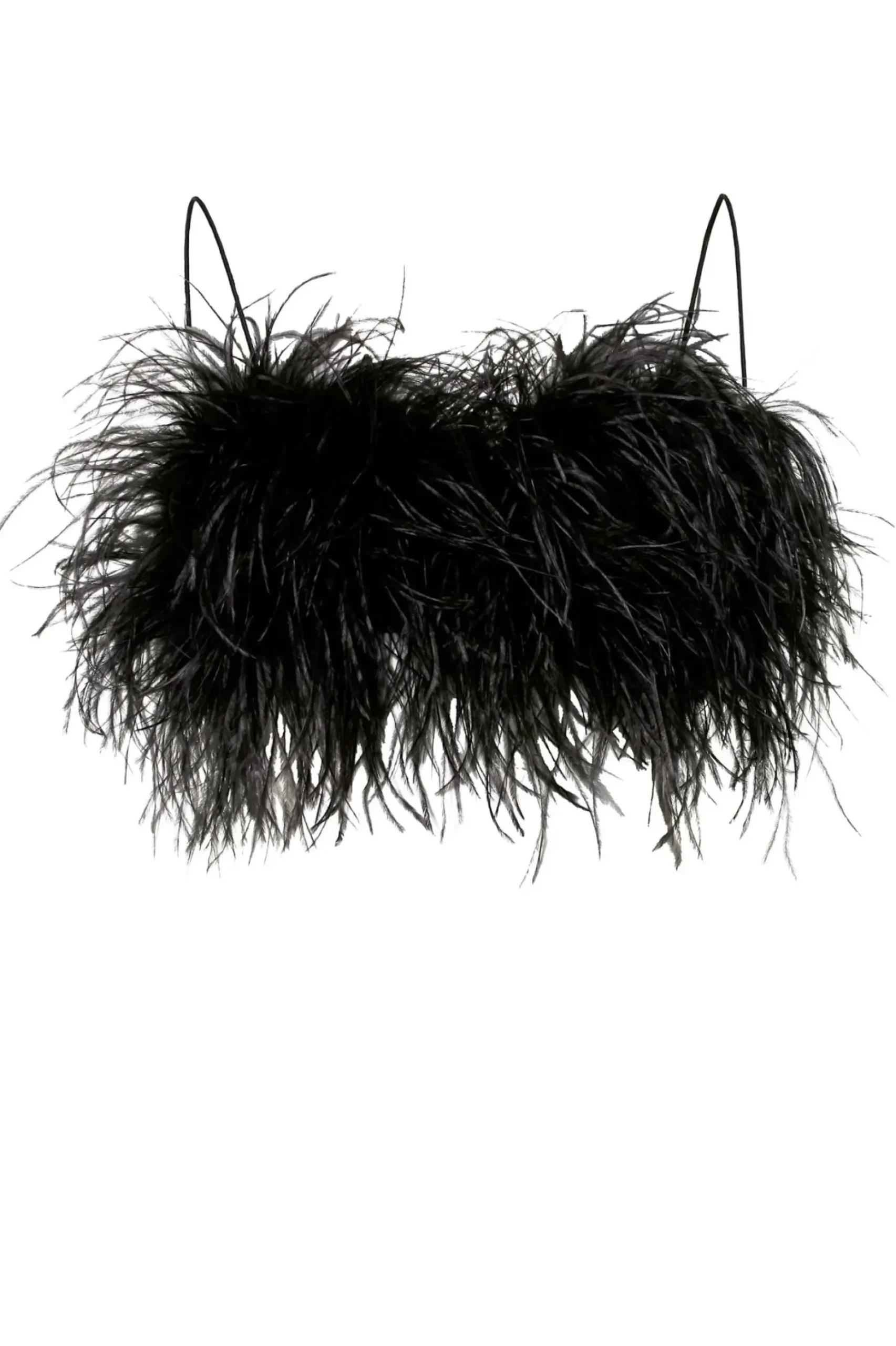 Zmyslowy Wieczorowy Top Uszyty Ze Strusich Pior Na Subtelnych Ramiaczkach Typu Makaroniki.