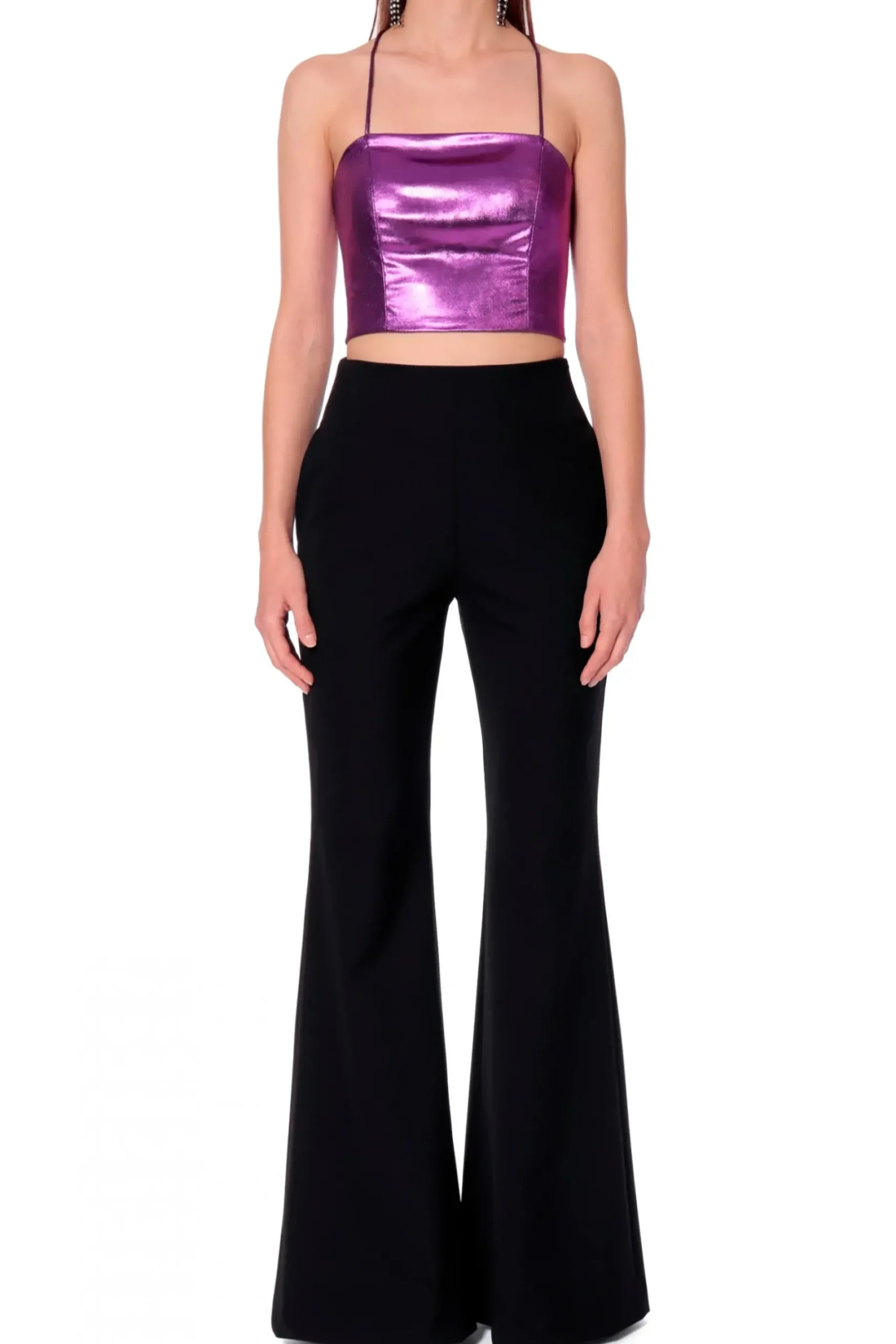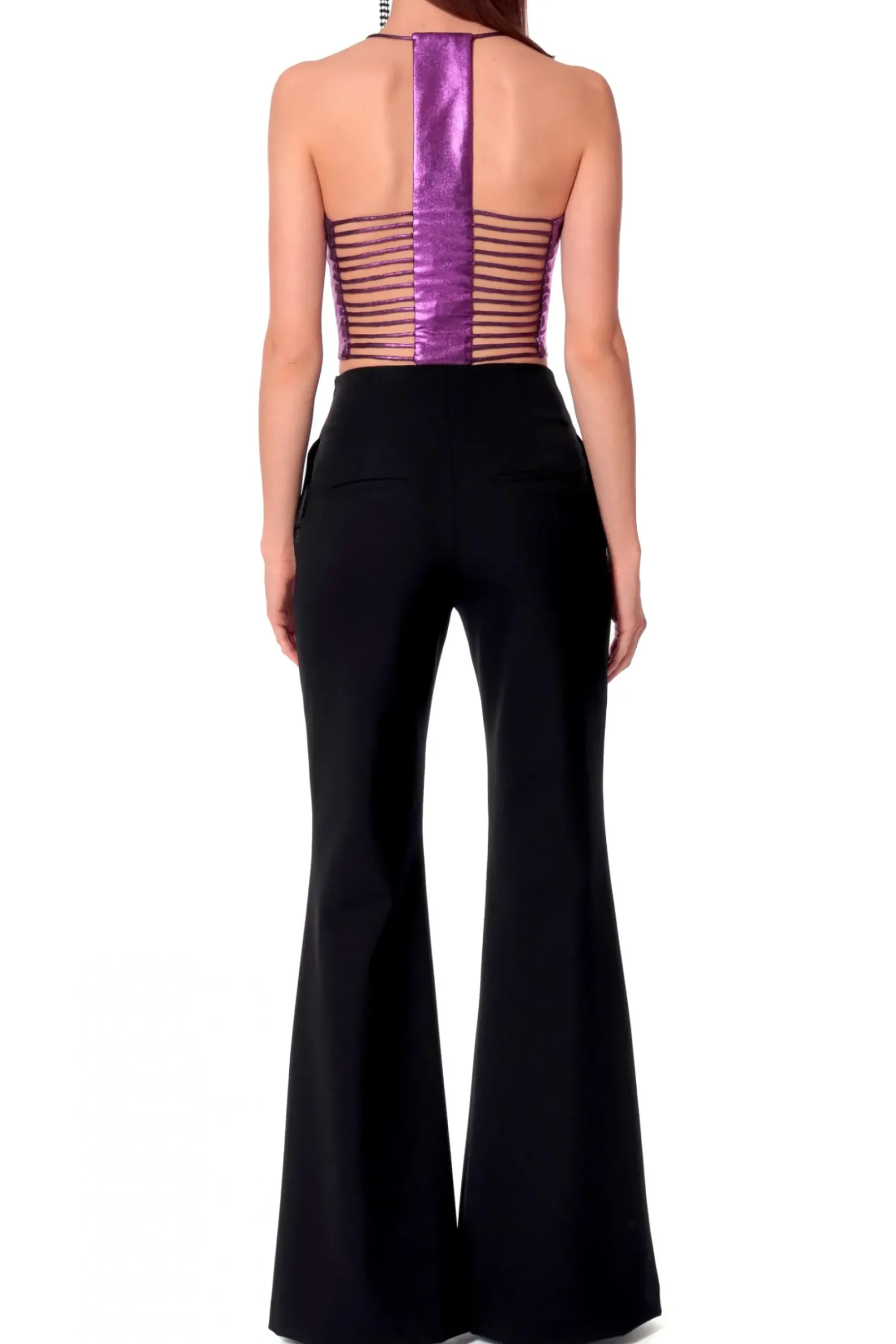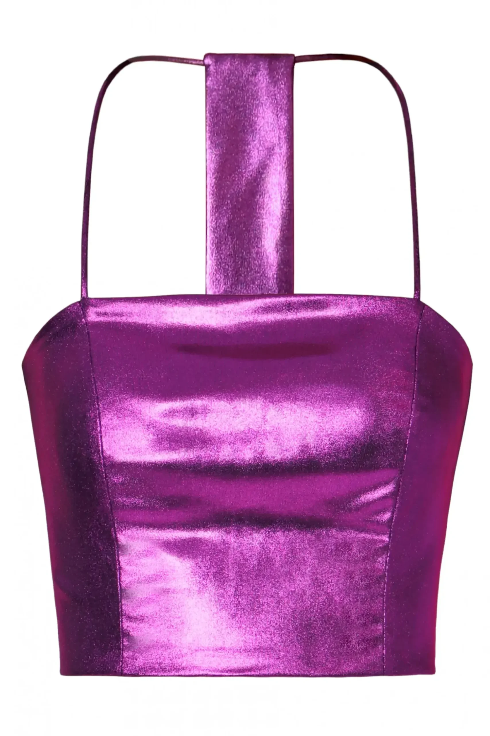 Top Wykonany Z Wyjatkowego Materialu Pokrytego Blyszczaca Apretura, O Lejacym Efekcie. Lekko Elastyczne Wlasciwosci Materialu, Zapewniaja Idealne Dopasowanie Do Sylwetki. Cienkie Ramiaczka Lacza Sie Z Tylu Prostokatnym Kawalkiem Materialu Oraz Poprzecznymi Paseczkami Tworzac Ciekawy, Przyciagajacy Wzrok Element Dekoracyjny.