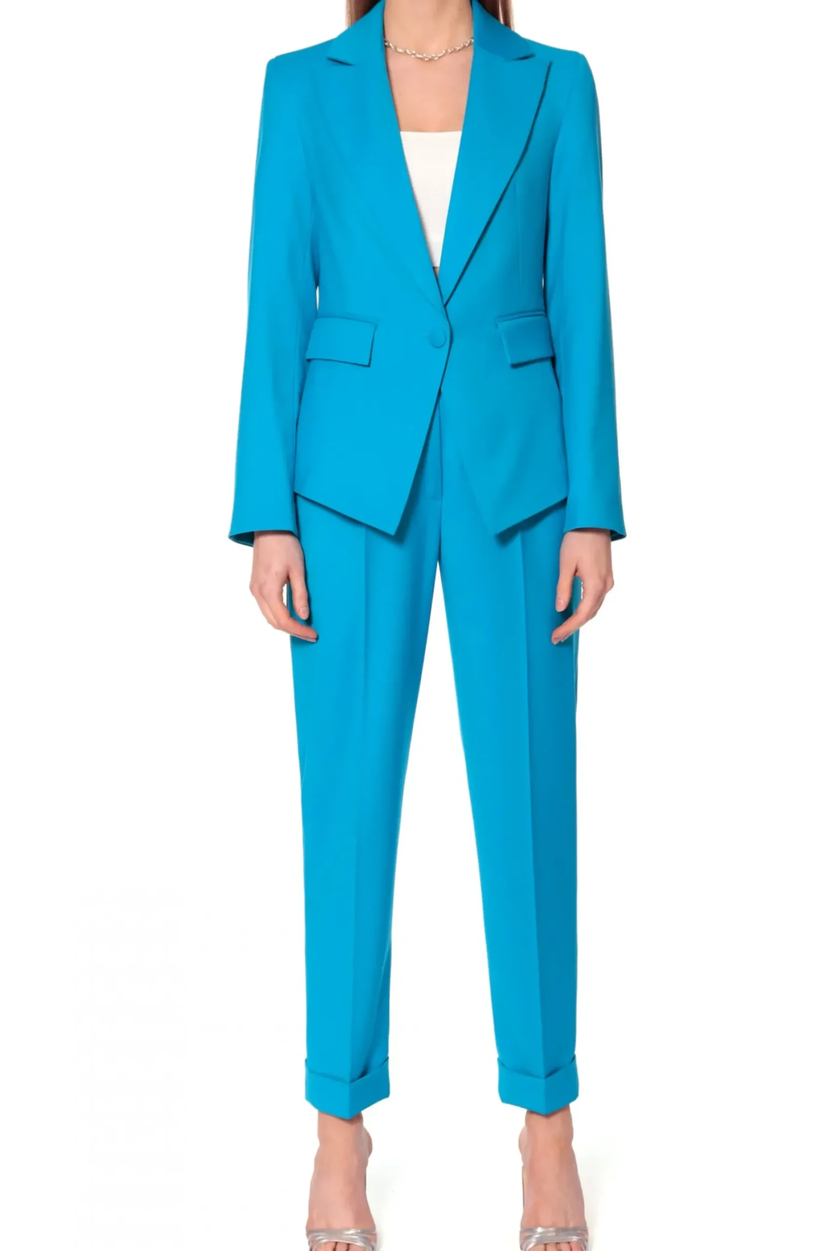 Kobieca Marynarka O Wysmuklajacym, Modelujacym Kroju Zapinana Na Guzik Obleczony Tkanina. Dolne Poly Marynarki O Geometrycznym Kroju Z Wysoko Umieszczonymi Przednimi Kieszeniami Podkreslaja Talie. Skompletuj Ja Ze Spodniami Kelly Blue Jewel.
