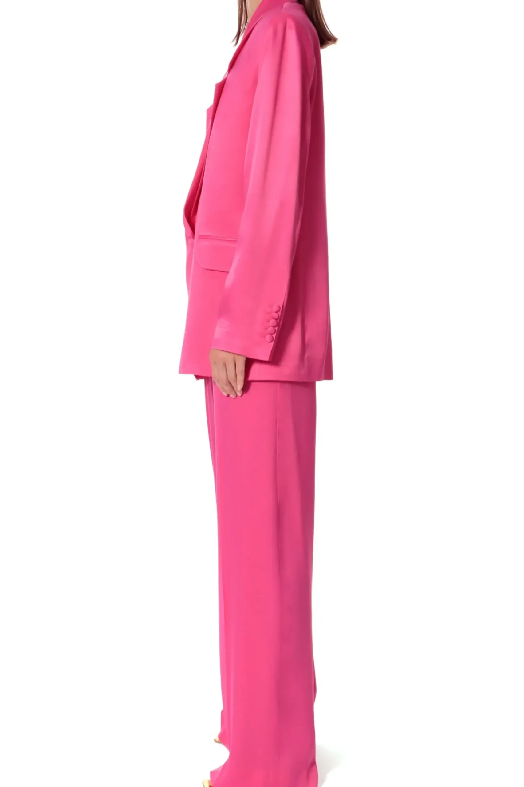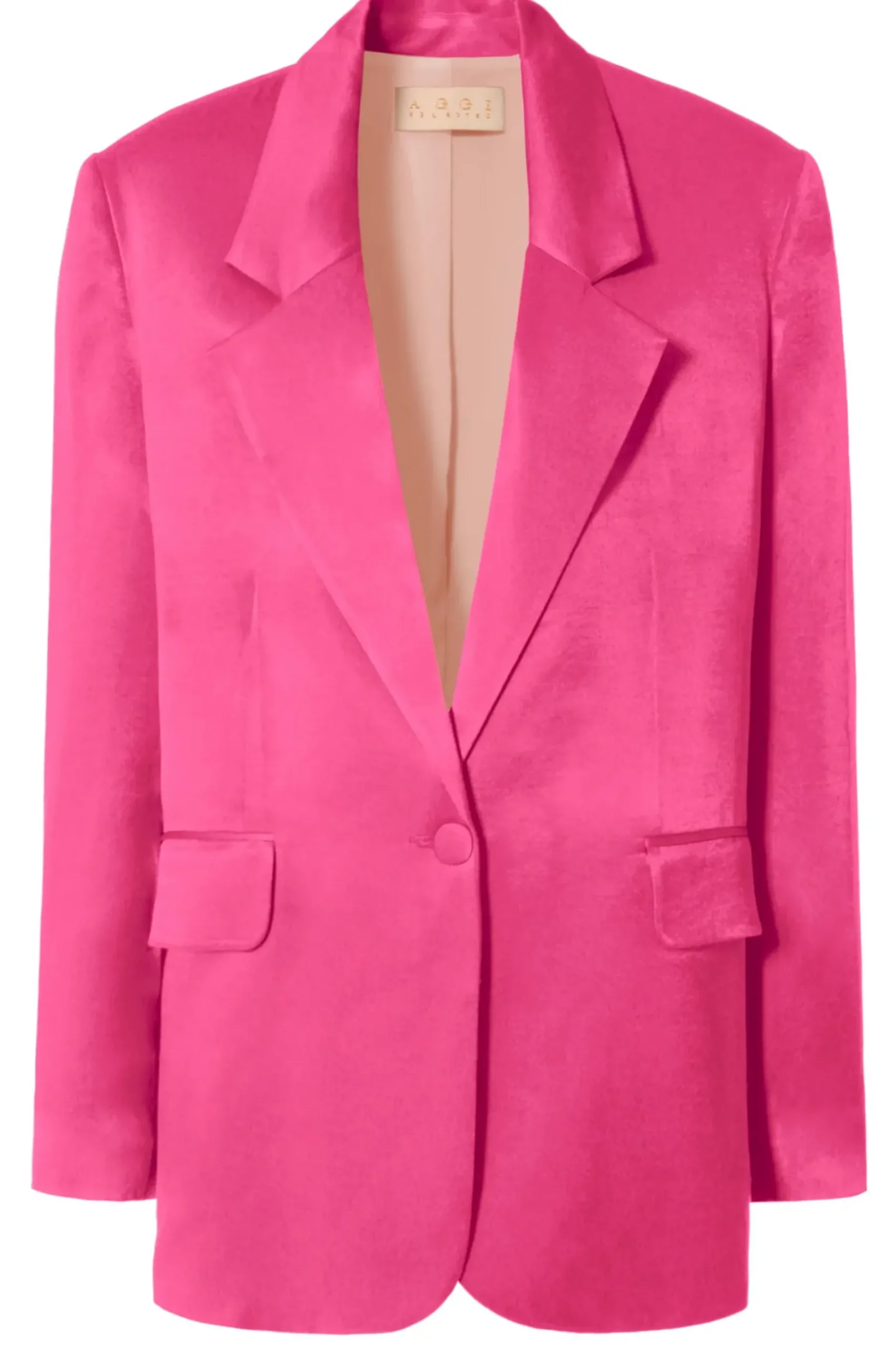 Jednorzedowa Atlasowa Marynarka O Luznym, Nieco Nonszalanckim Kroju Kroju Z Charakterystycznym Dla Projektow Aggi Kunsztem Konstrukcyjnym Zaakcentowanym W Mocniejszej, Zdecydowanie Podkreslonej Linii Ramion Oraz Precyzyjnie Wymodelowanych Klapach. Dlugie Rekawy, Miekko Ukladajaca Sie Miesista, Szlachetna Tkanina Atlasowa Pozwala Odkryc W Projekcie Zarowno Dzienny Jak I Wieczorowy Charakter Marynarki. Zestaw Ja Z Satynowymi Spodniami Jessie Satin Barbie Pink I Topem Asha Satin Barbie Pink Lub Zarzuc Na Ramiona Do Dopasowanej Wieczorowej Sukienki. Calosc Na Delikatnej Szyfonowej Podszewce.