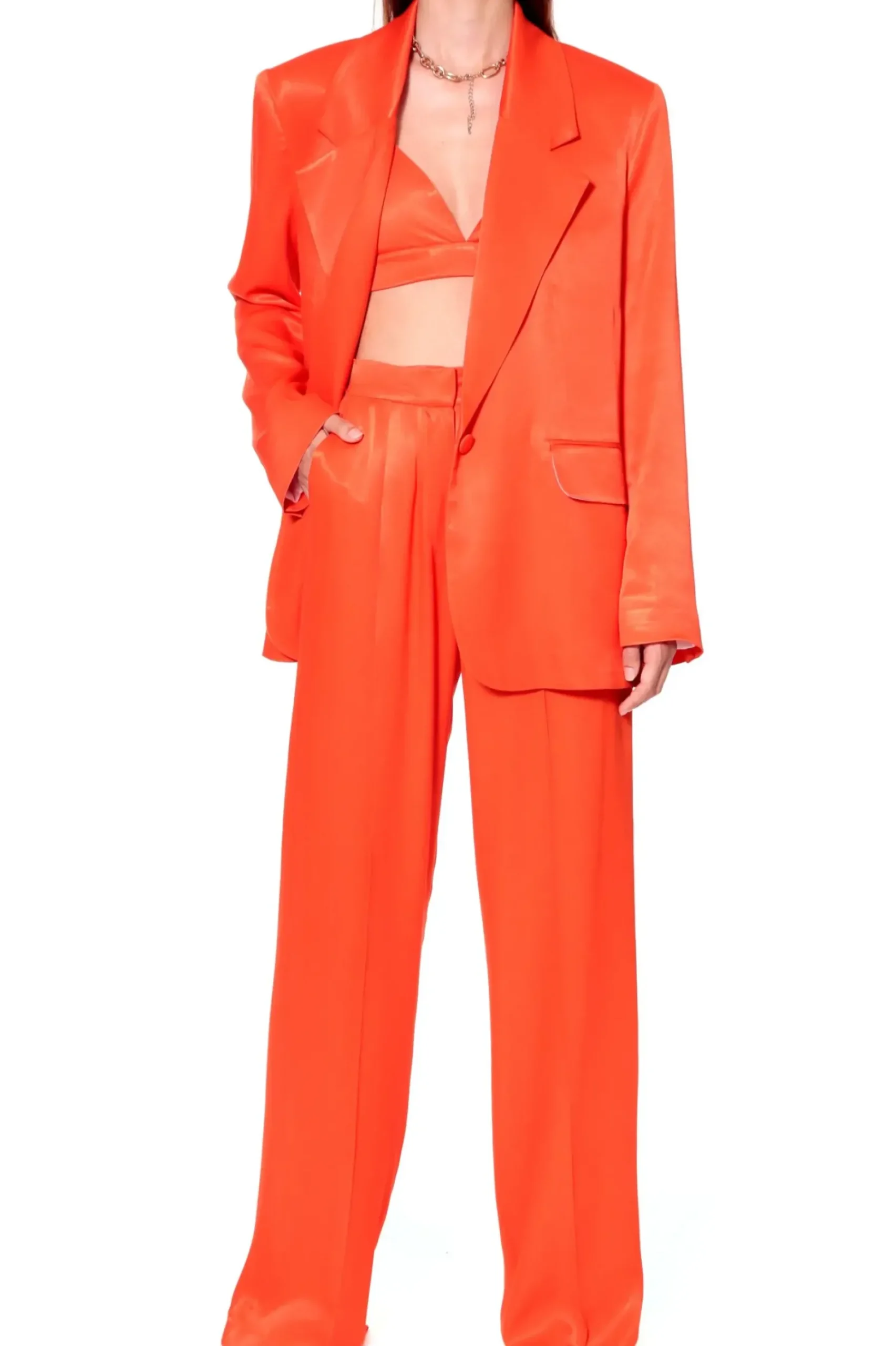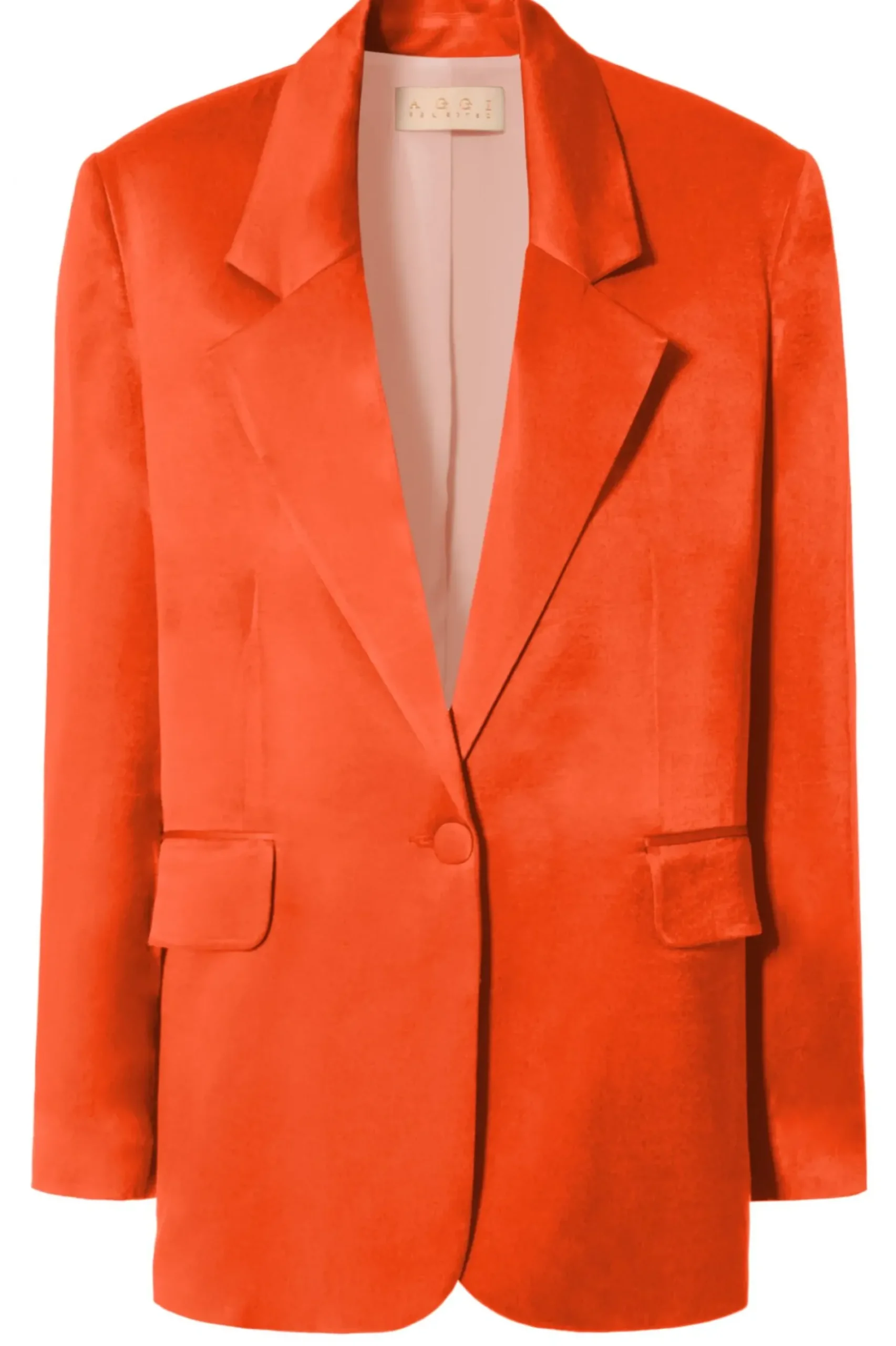 Jednorzedowa Atlasowa Marynarka O Luznym, Nieco Nonszalanckim Kroju Kroju Z Charakterystycznym Dla Projektow Aggi Kunsztem Konstrukcyjnym Zaakcentowanym W Mocniejszej, Zdecydowanie Podkreslonej Linii Ramion Oraz Precyzyjnie Wymodelowanych Klapach. Dlugie Rekawy, Miekko Ukladajaca Sie Miesista, Szlachetna Tkanina Atlasowa Pozwala Odkryc W Projekcie Zarowno Dzienny Jak I Wieczorowy Charakter Marynarki. Zestaw Ja Z Satynowymi Spodniami Jessie Satin Nasturium I Topem Asha Satin Nasturium Lub Zarzuc Na Ramiona Do Dopasowanej Wieczorowej Sukienki. Calosc Na Delikatnej Szyfonowej Podszewce.