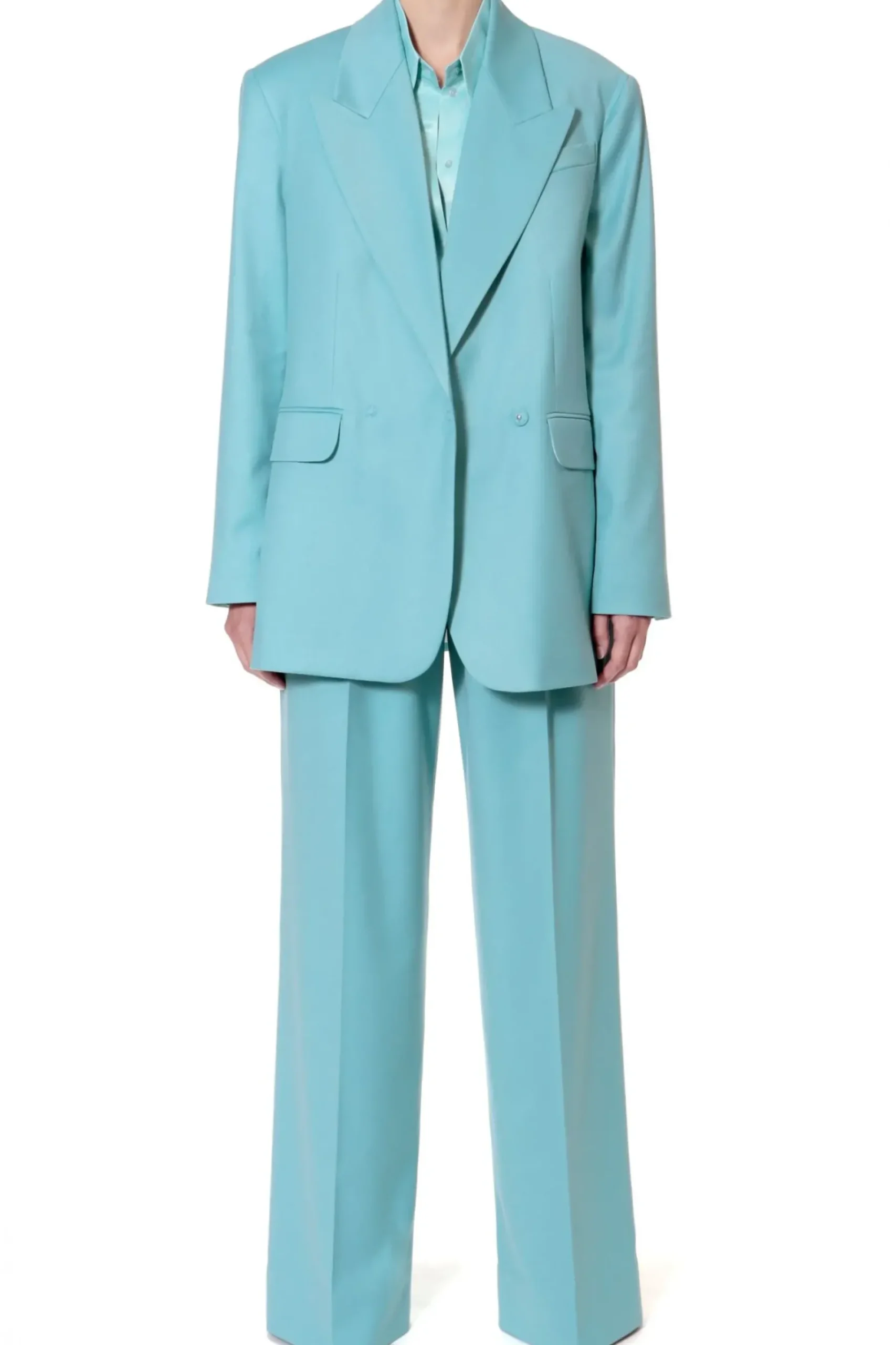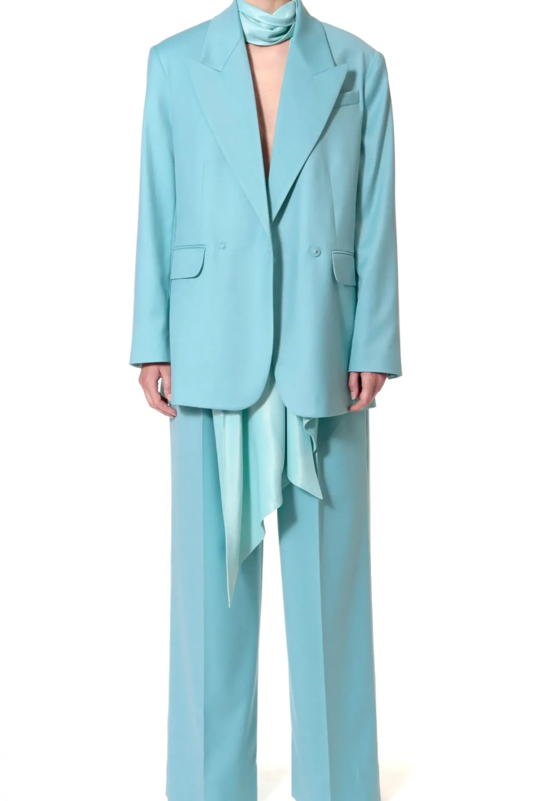 Dluga, Obszerna Marynarka O Inspirowana Marynarka Z Meskiego Garnituru. Maskulinistyczny, Oversizowy Fason W Szlachetnym Odcieniu Spopielalego Blekitu To Projekt Minimalistyczny I Niezwykle Elegancki W Swojej Surowosci. Szerokie Klapy, Mocno Zarysowane Ramiona Wystajace Poza Linie Sylwetki, Rozciecia Z Tylu Marynarki. Calosc Na Zakardowej Podszewce W Drobne Prazki.
