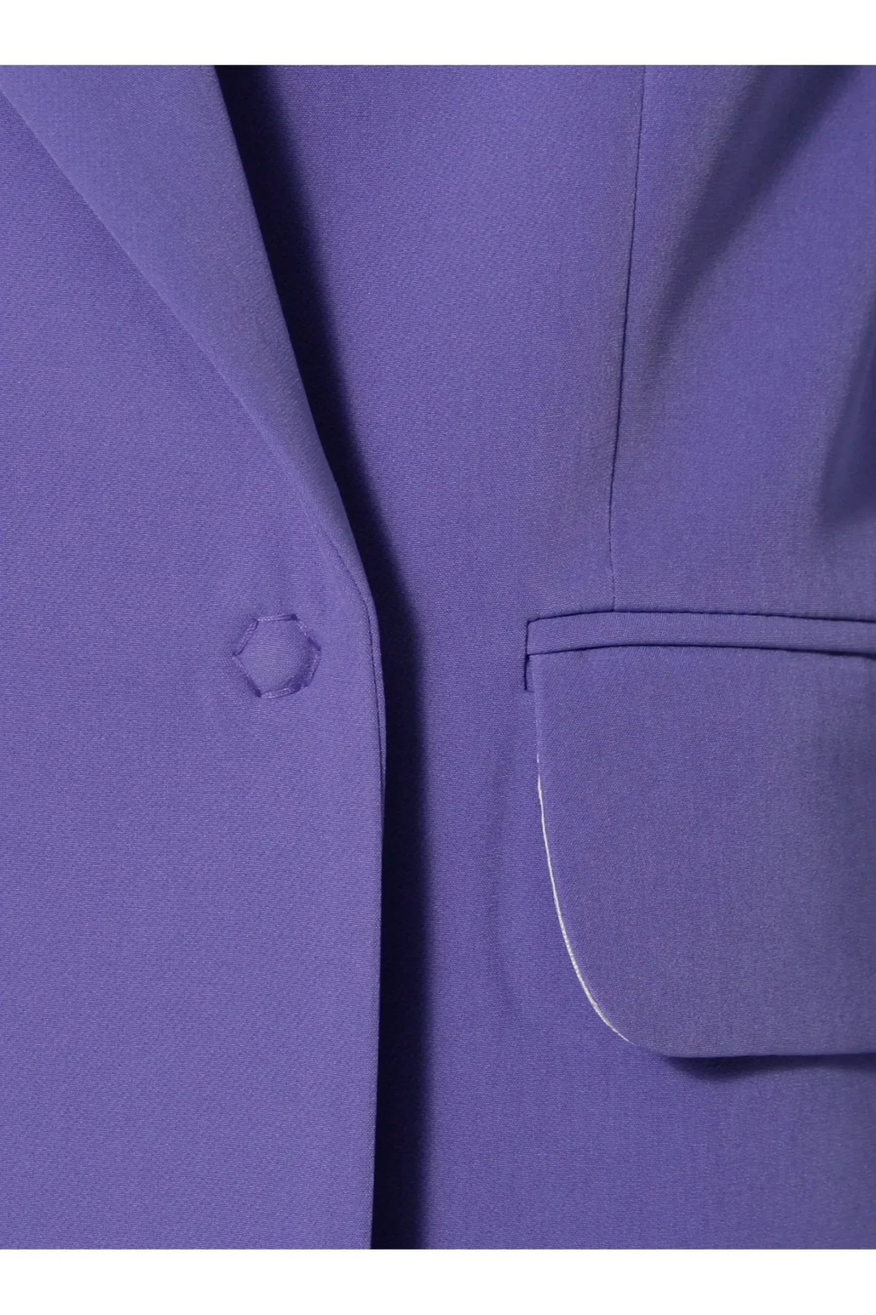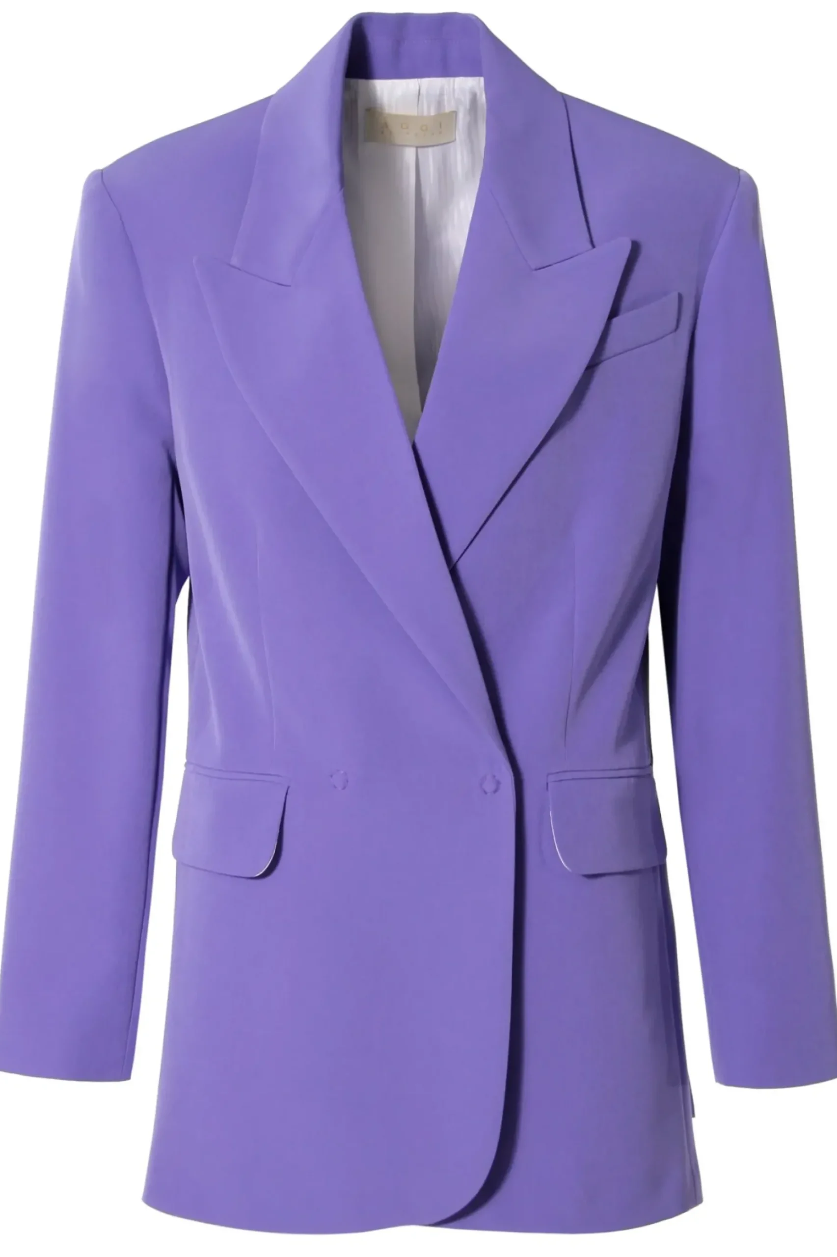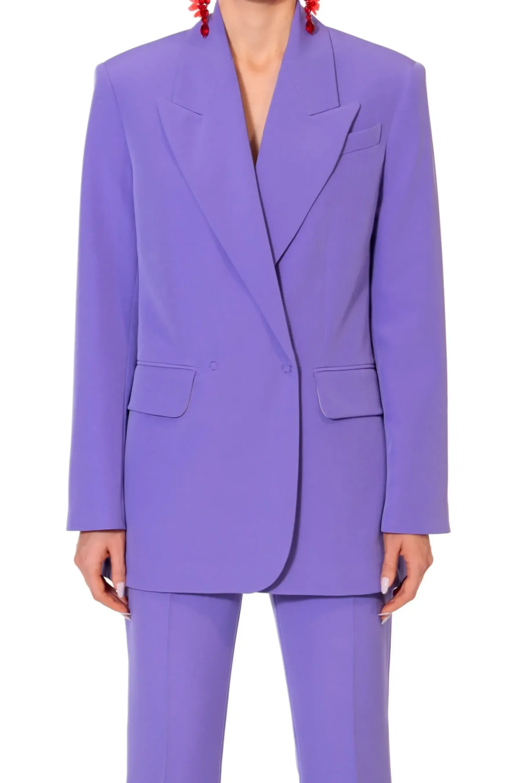 Blair Purple Opulence – Dluga , Obszerna Marynarka W Kolorze Elektryzujacego Fioletu. Szerokie Klapy, Dwurzedowe Zapiecie Oraz Mocno Zarysowane Ramiona Wystajace Poza Linie Sylwetki, Rozciecia Z Tylu Marynarki. Zestaw Ja Ze Spodniami Kyle Purple Opulence Tworzac Mocna Stylizacje Przyciagajaca Spojrzenia.