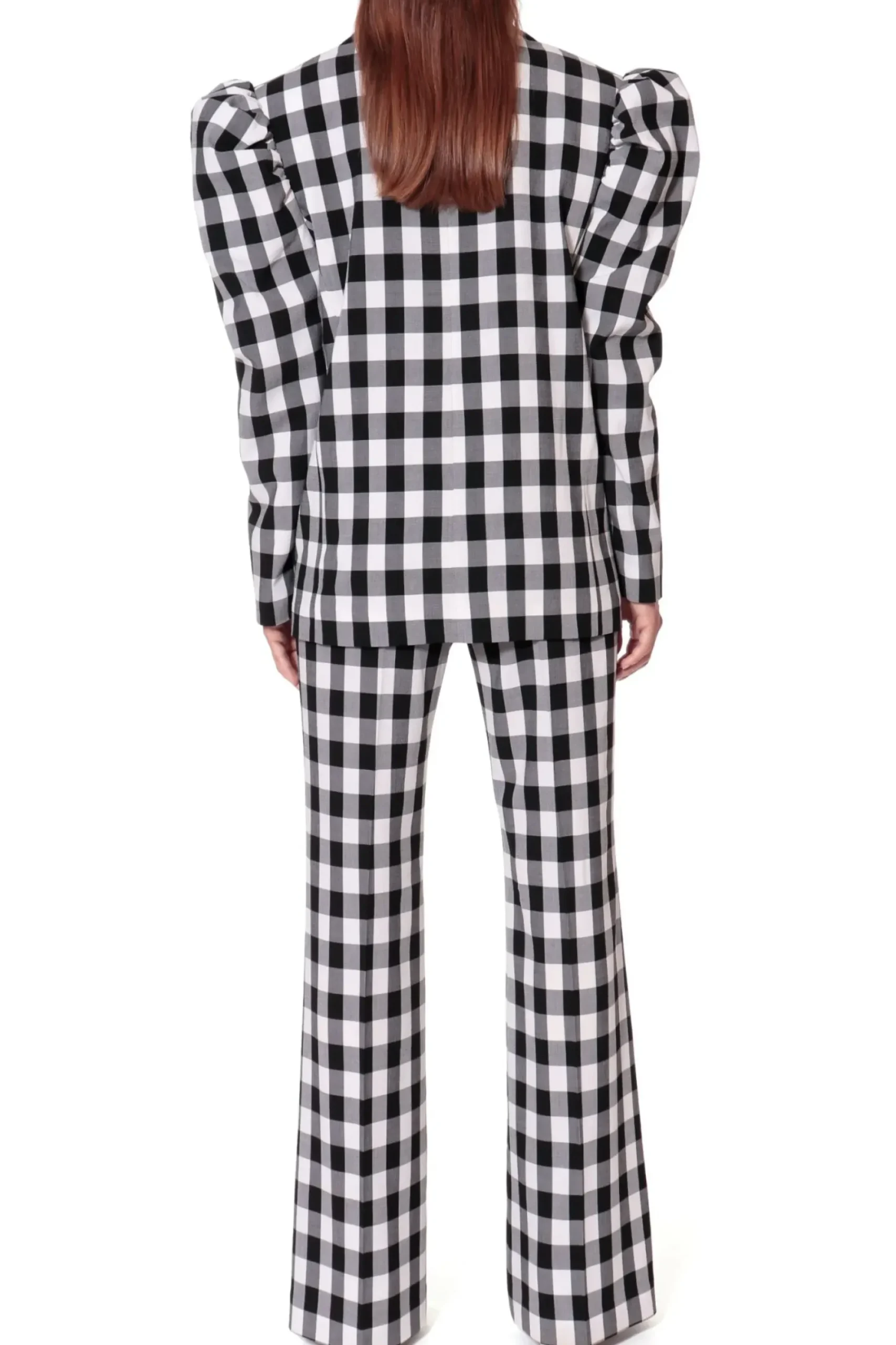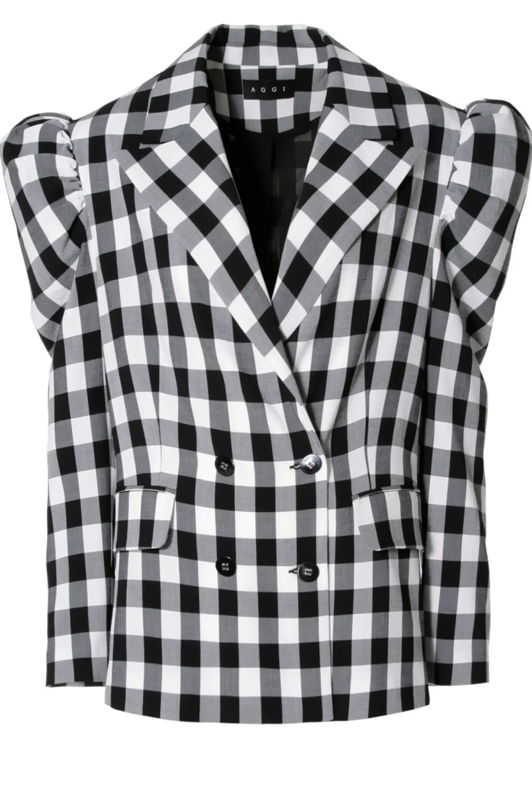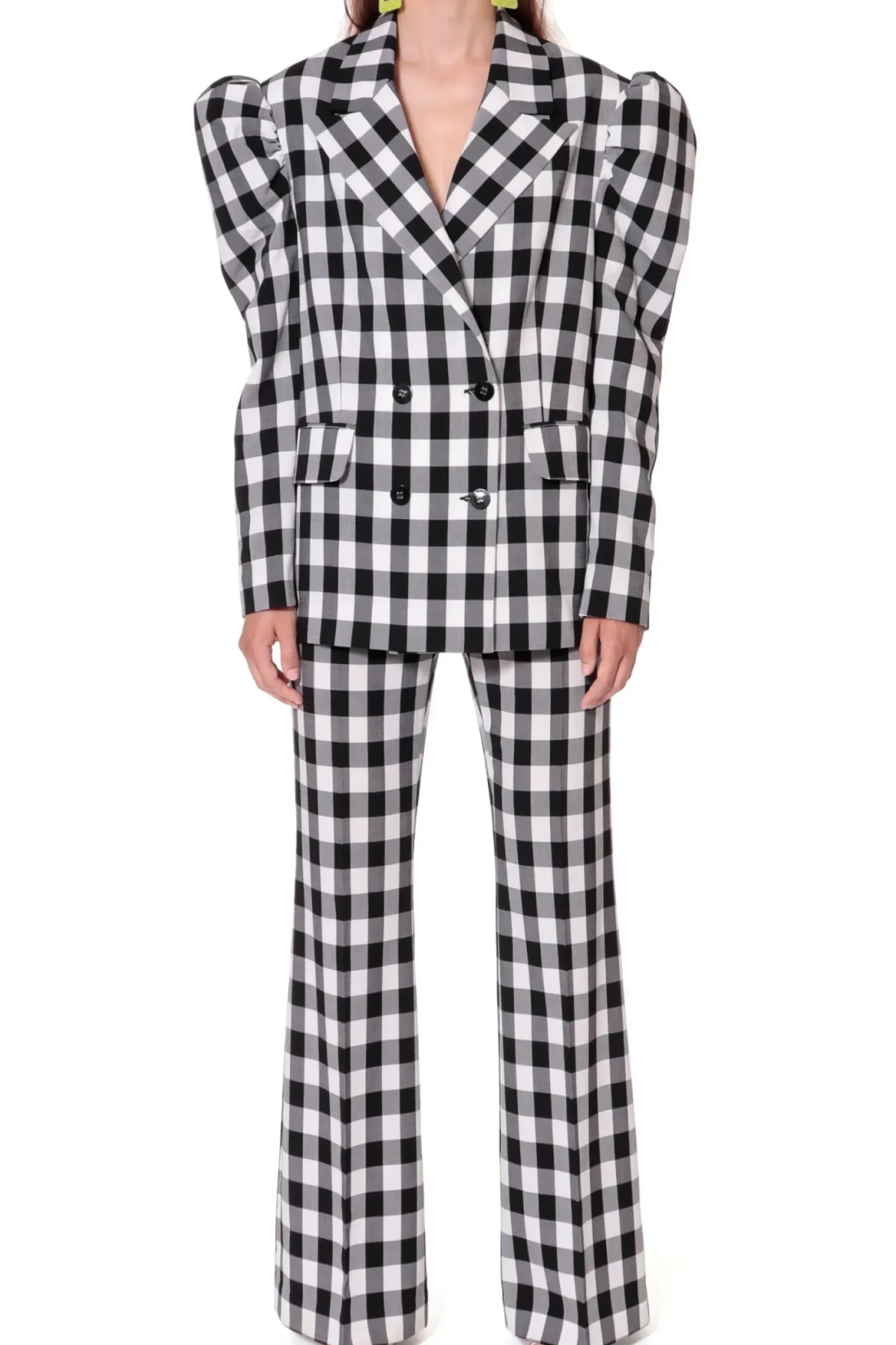 Dwurzedowa Marynarka Z Duzymi Bufami. Eklektyczny Fason W Monochromatyczna Bialo-Czarna Krate Gingham Wykonczony Z Dbaloscia O Detal – Czarne Ebonitowe Guziki Ze Srebrnymi Dziurkami Zdecydowany, Mocny Wzor Skupia Uwage I Bedzie Glownym Elementem Twojej Stylizacji. Nos Ja W Zestawie Ze Spodniami Lexi.