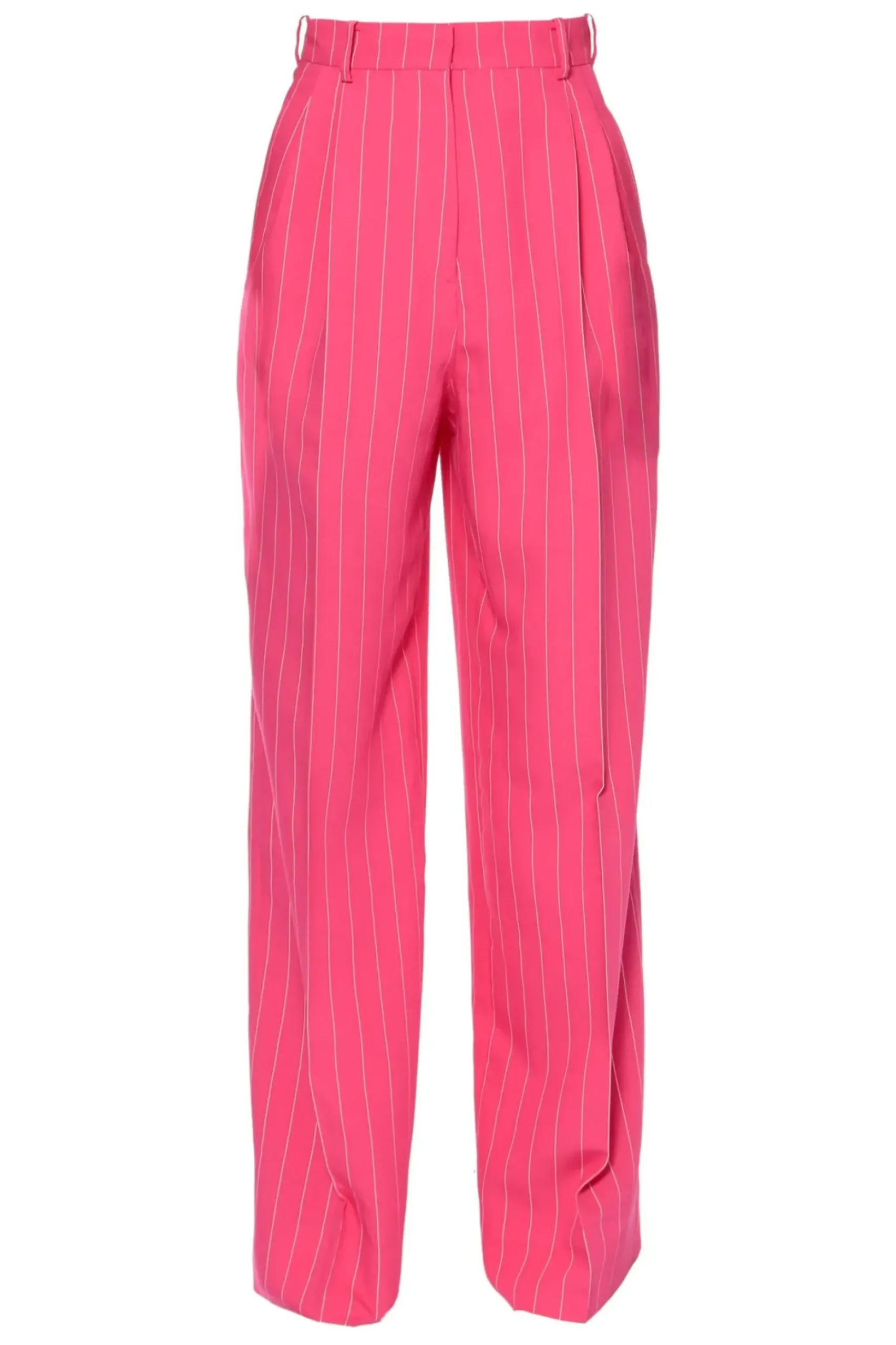 Szerokie Spodnie W Kolorze Intensywnego Rozu W Bialy Tenisowy Prazek. Wysoka Dopasowana Talia Z Zakladkami Pozostajaca W Kontrascie Z Szerokimi Nogawkami. Nos Je Z Marynarka Tiffany Hot Pink.