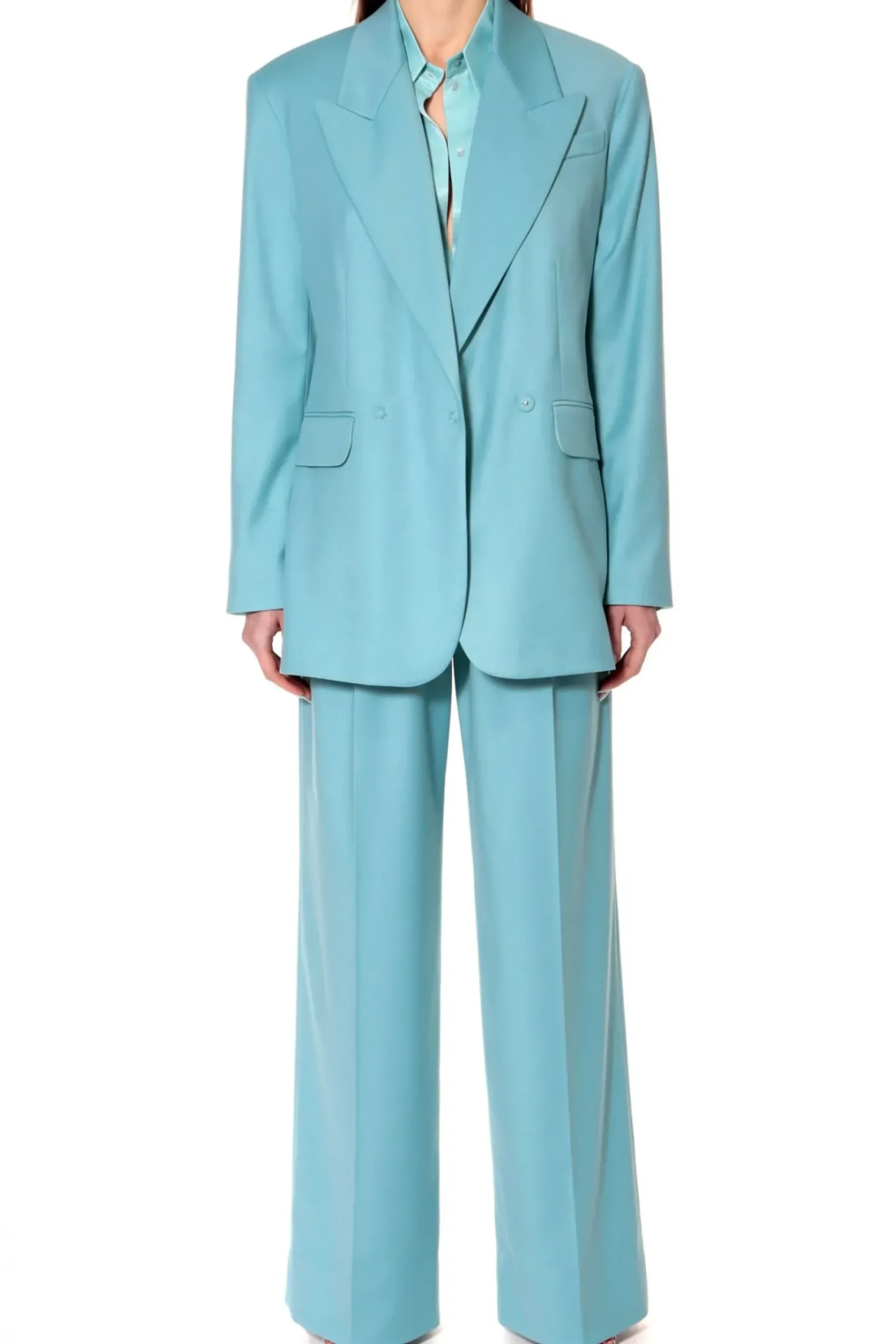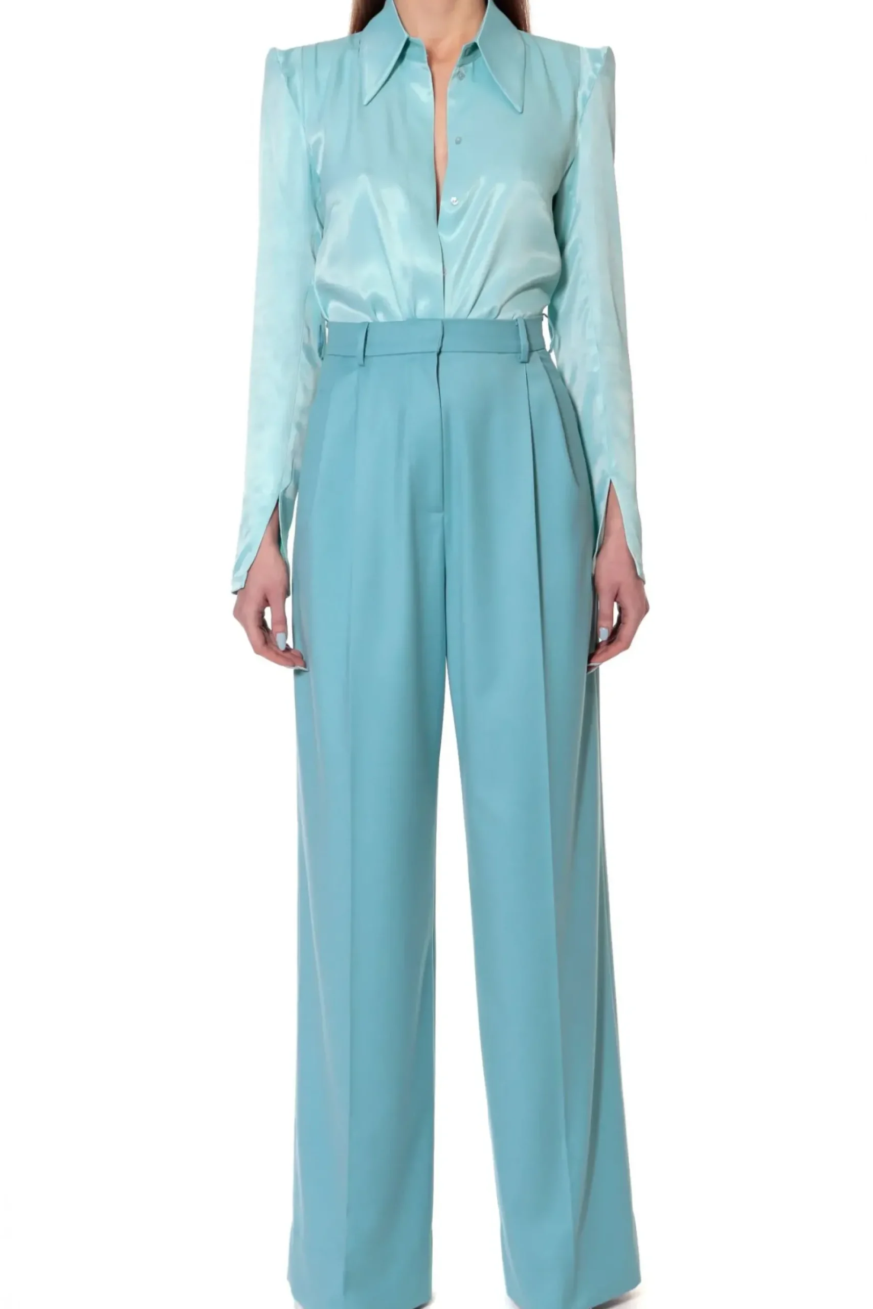 Szerokie Spodnie W Szlachetnym Odcieniu Spopielalego Blekitu. Wysoka Dopasowana Talia Z Zakladkami Pozostajaca W Kontrascie Z Szerokimi Nogawkami.W Szwach Bocznych Ukryte Kieszenie. Skomponuj Je Z Marynarka Blair How Blue Am I? Tworzac Elegancki Total Look Lub Nos Je Nonszalancko Z Tshirtem I Sportowym Obuwiem Na Co Dzien.