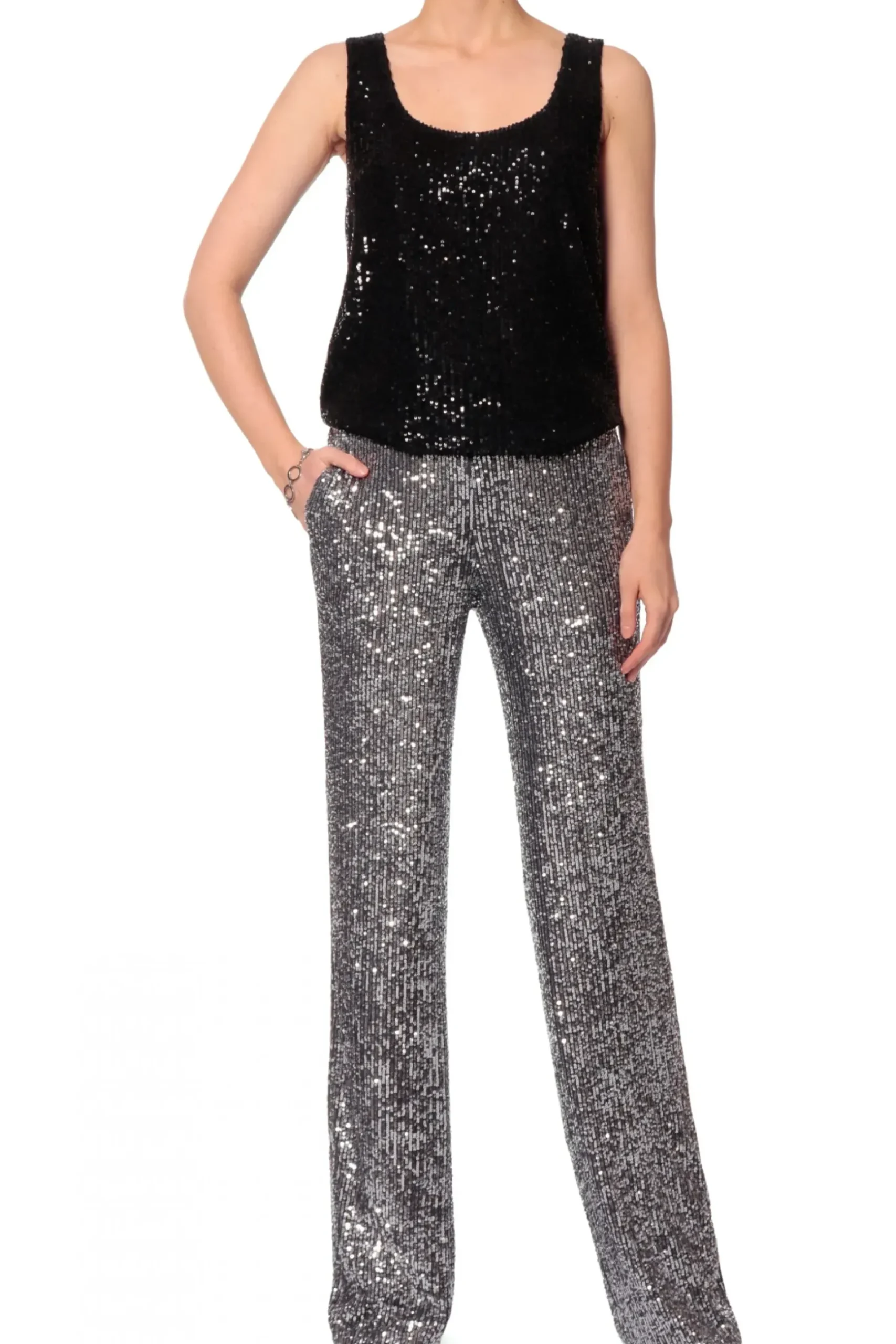 Spodnie Z Wysokim Stanem I Szerokimi Nogawkami Wykonane Z Materialu Wyszywanego Drobnymi Cekinami W Calosci Podszyte Wiskozowa Podszewka. Lekko Elastyczne Wlasciwosci Materialu Zapewniaja Idealne Dopasowanie W Okolicach Talii I Bioder. Z Wygodnymi Bocznymi Kieszeniami, Zapinane Na Zamek Blyskawiczny Z Lewej Strony. Nos Je Z Cekinowym Zakietem Luna Obsidian Black Lub Reina Obsidian Black By Skomponowac Idealna Stylizacje Na Sylwestra Lub Zabawe Karnawalowa.