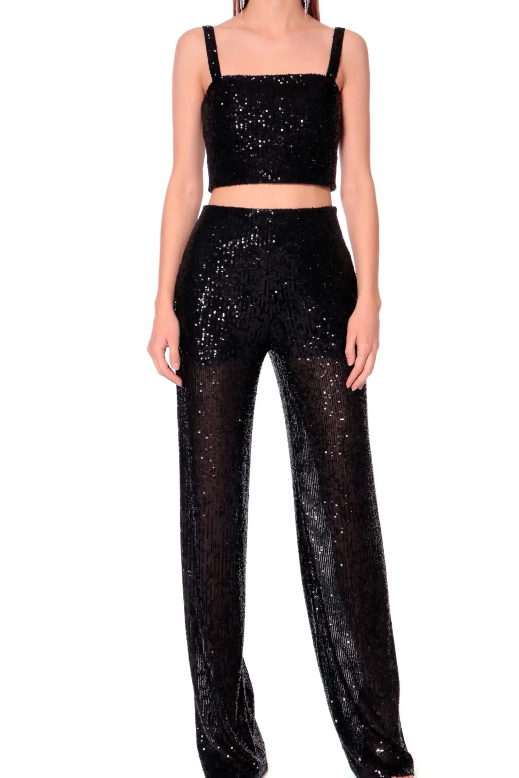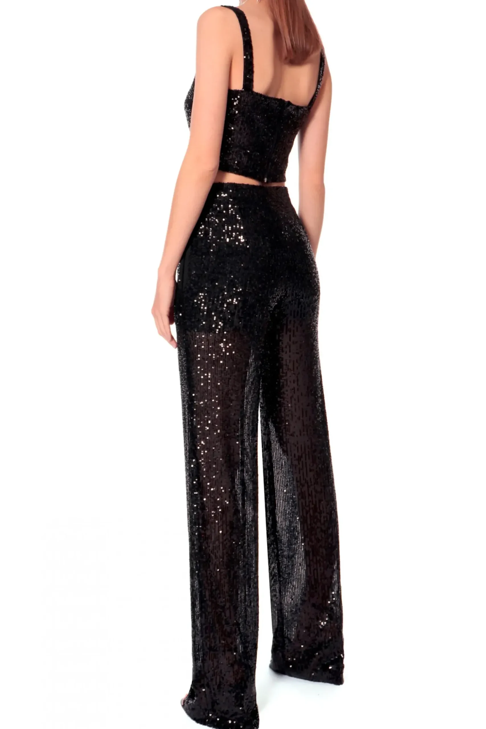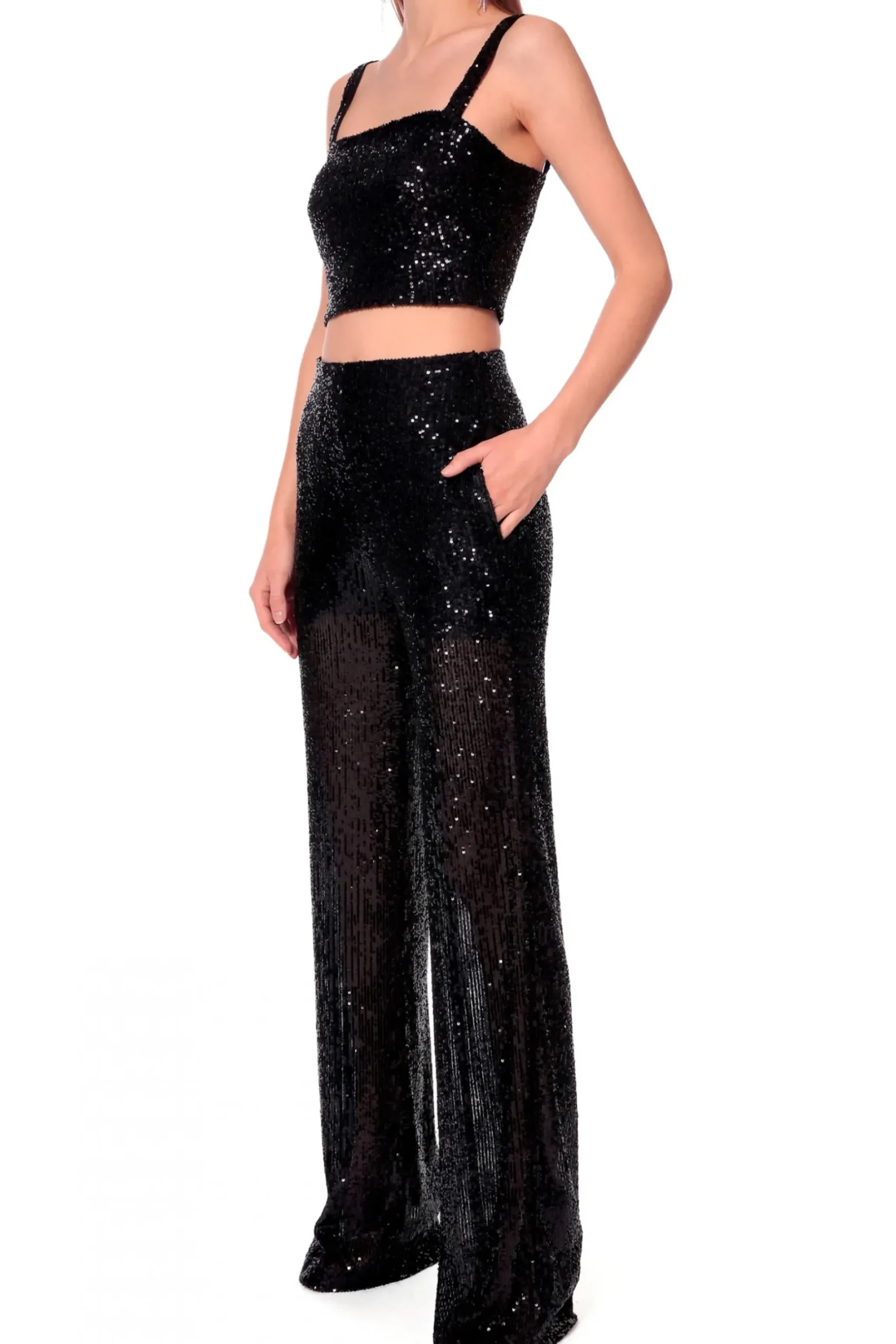 Spodnie Z Wysokim Stanem I Szerokimi Nogawkami Wykonane Z Materialu Wyszywanego Drobnymi Cekinami Podszyte Wiskozowa Poszewka Na Wysokosci Bioder. Lekko Elastyczne Wlasciwosci Materialu Zapewniaja Idealne Dopasowanie W Okolicach Talii I Bioder. Z Wygodnymi Bocznymi Kieszeniami, Zapinane Na Zamek Blyskawiczny Z Lewej Strony. Nos Je Z Cekinowym Zakietem Luna Obsidian Black Lub Topem Reina Obsidian Black By Skomponowac Idealna Stylizacje Na Sylwestra Lub Zabawe Karnawalowa.