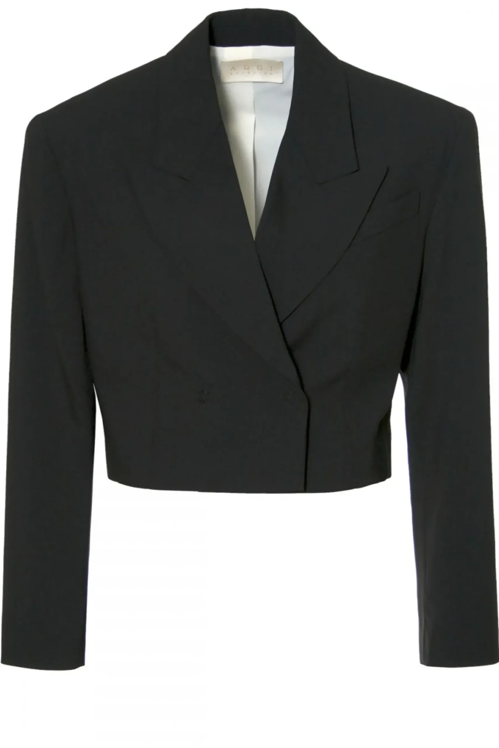 Krotka, Dwurzedowa Marynarka Z Szerokimi Klapami. Z Tylu Ozdobne, Misterne Plisowanie Nadajace Projektowi Unikatowego Charakteru.