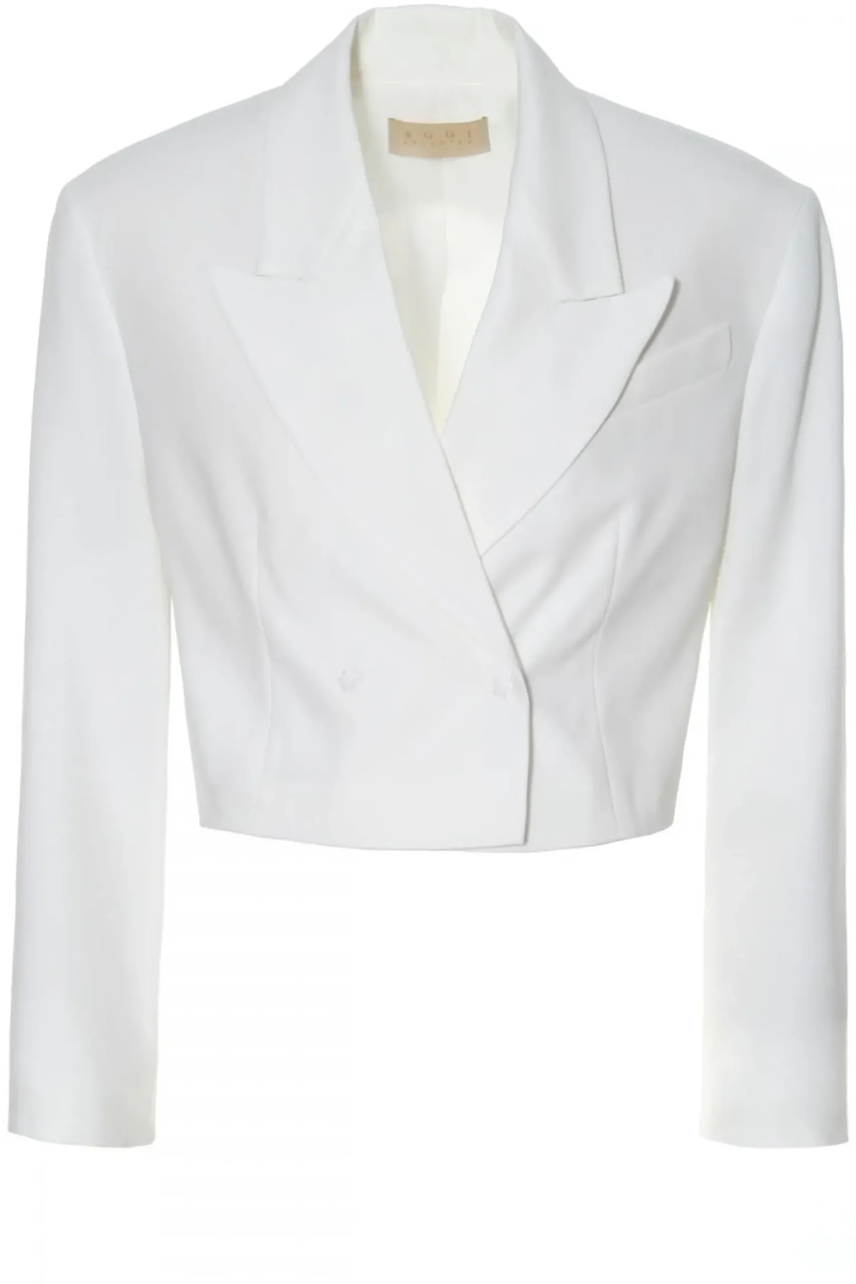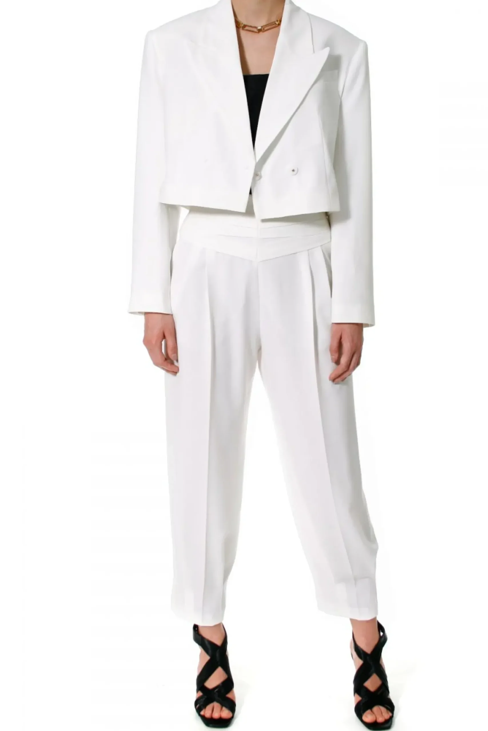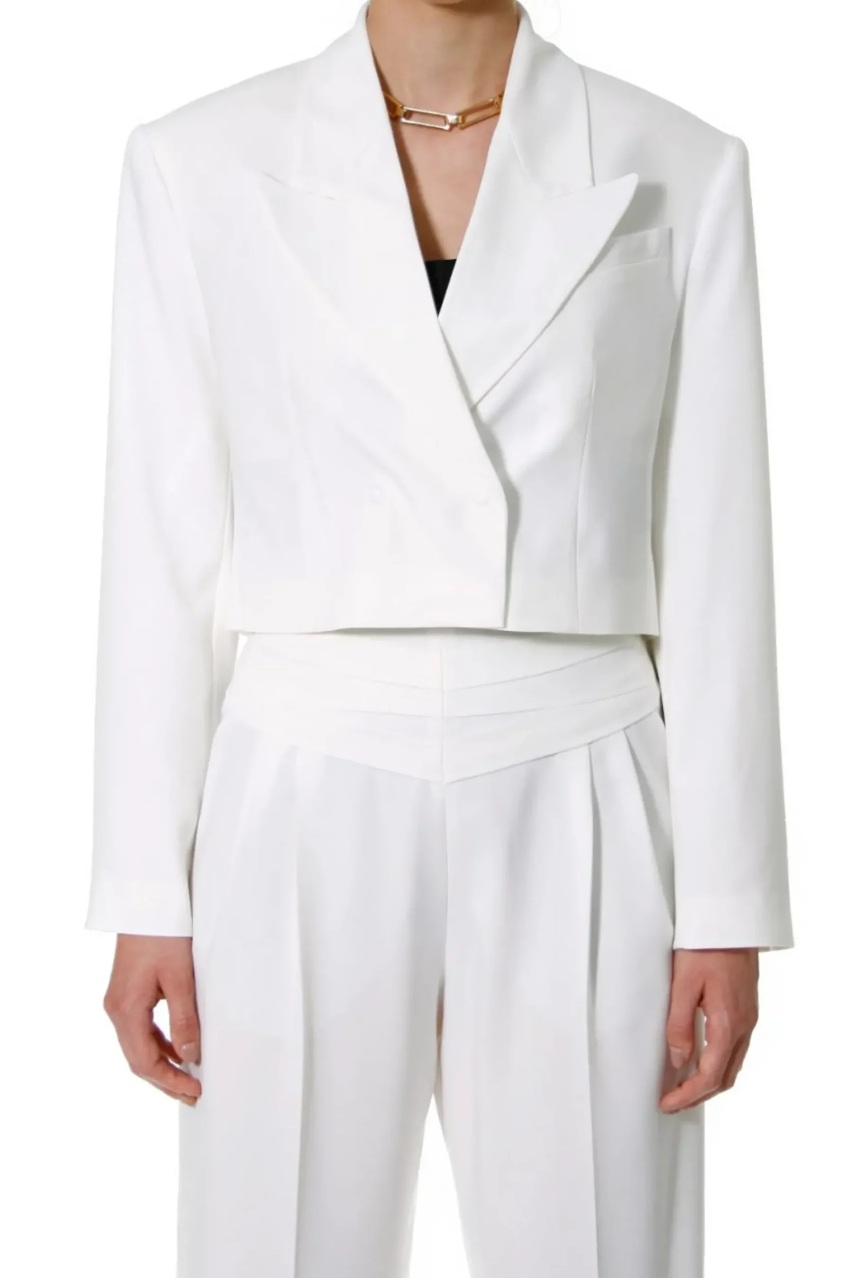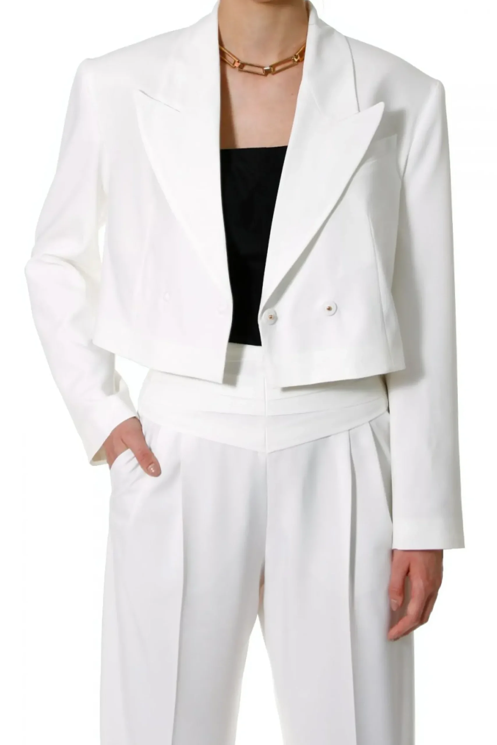 Krotka, Dwurzedowa Marynarka Z Szerokimi Klapami. Z Tylu Ozdobne, Misterne Plisowanie Nadajace Projektowi Unikatowego Charakteru.