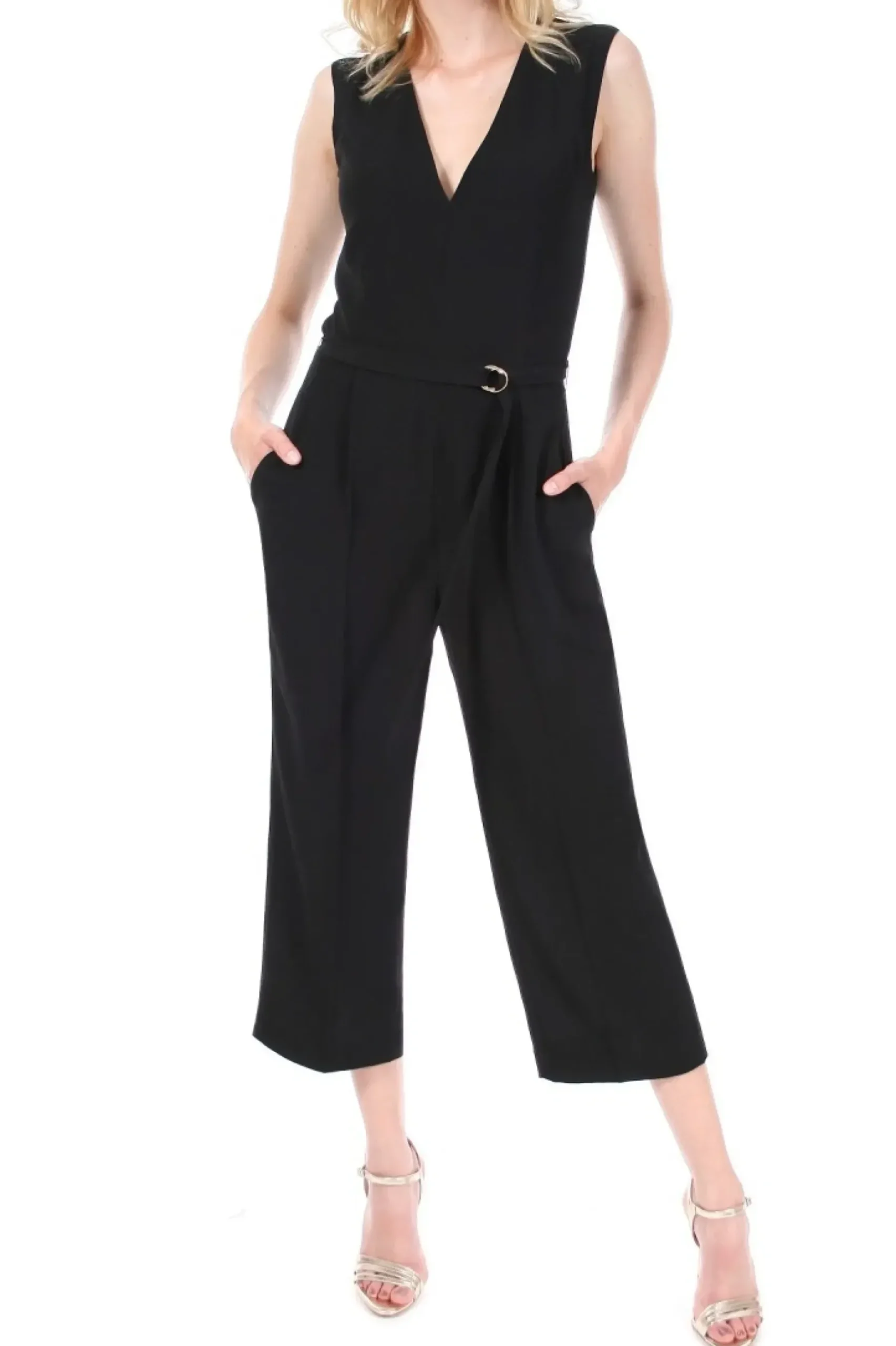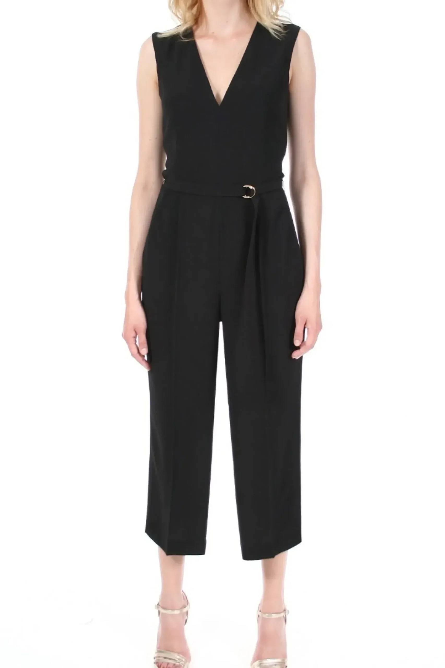 Kombinezon Z Linii Aggi Selected Uszyty Z Delikatnej Tkaniny Z Dodatkiem Elastanu O Fakturze „Gesiej Skorki”. Dopasowana Gora Kombinezonu Ze Zdecydowanym Dekoltem W Ksztalcie V. Odcinany W Talii. Luzne Spodnie Z Kieszeniami O Dlugosci 7/8, Z Tylu Dopasowane Zaszewkami, Na Przodzie Zakladki. Talie Podkresla Pasek Z Metalowym Zapieciem W Kolorze Zlota. Z Tylu Wszyty Zamek Blyskawiczny Z Ozdobna Zawieszka W Ksztalcie Zlotego Serduszka.