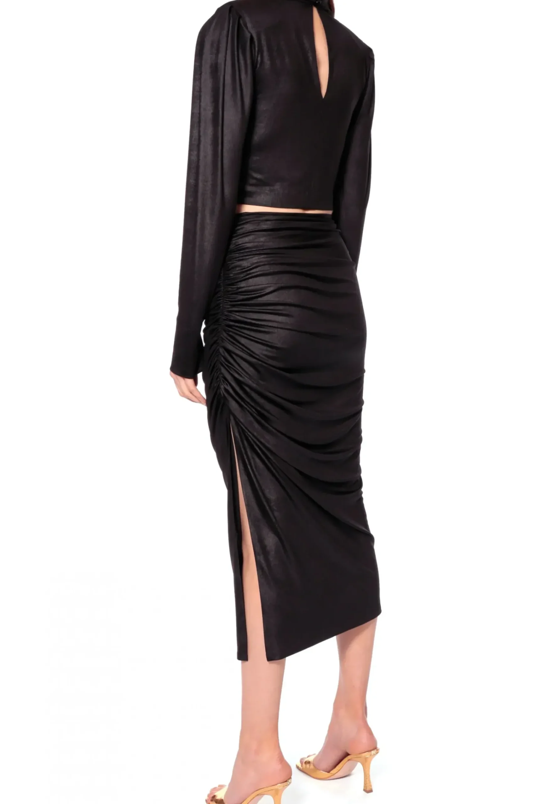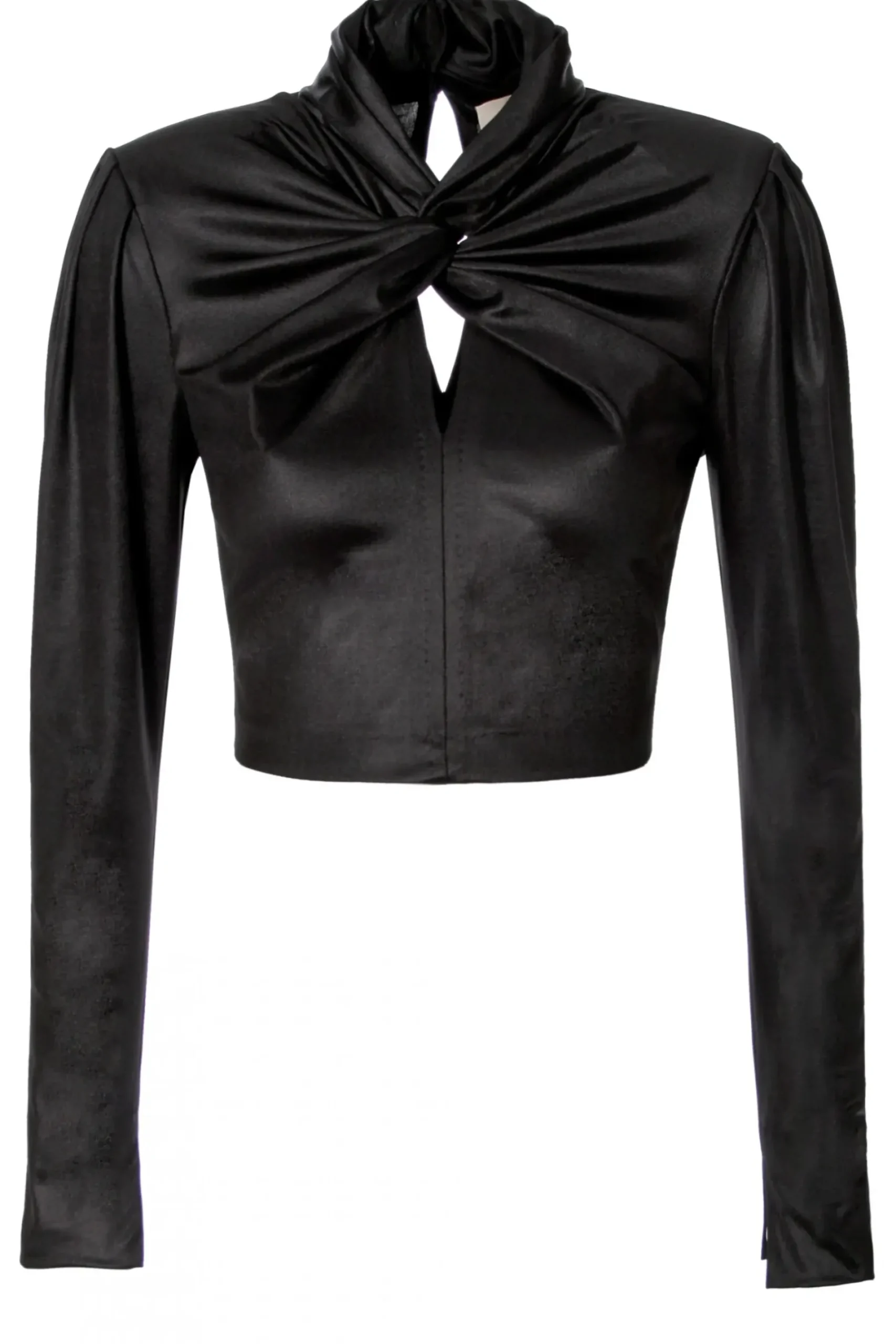 Bluzka Z Dlugim Rekawem Uszyta Z Elastycznego, Miekko Podkreslajacego Sylwetke Materialu O Subtelnym Polysku. Dekolt Z Delikatnym Wycieciem, Ozdobiony Jest Wezlem Z Obficie Zebranego Materialu, Krzyzujacym Sie Pod Szyja. Dlugie Wyciecie W Ksztalcie Lezki Z Tylu , Zakonczone Zapieciem Na Male Perlowe Guziczki.