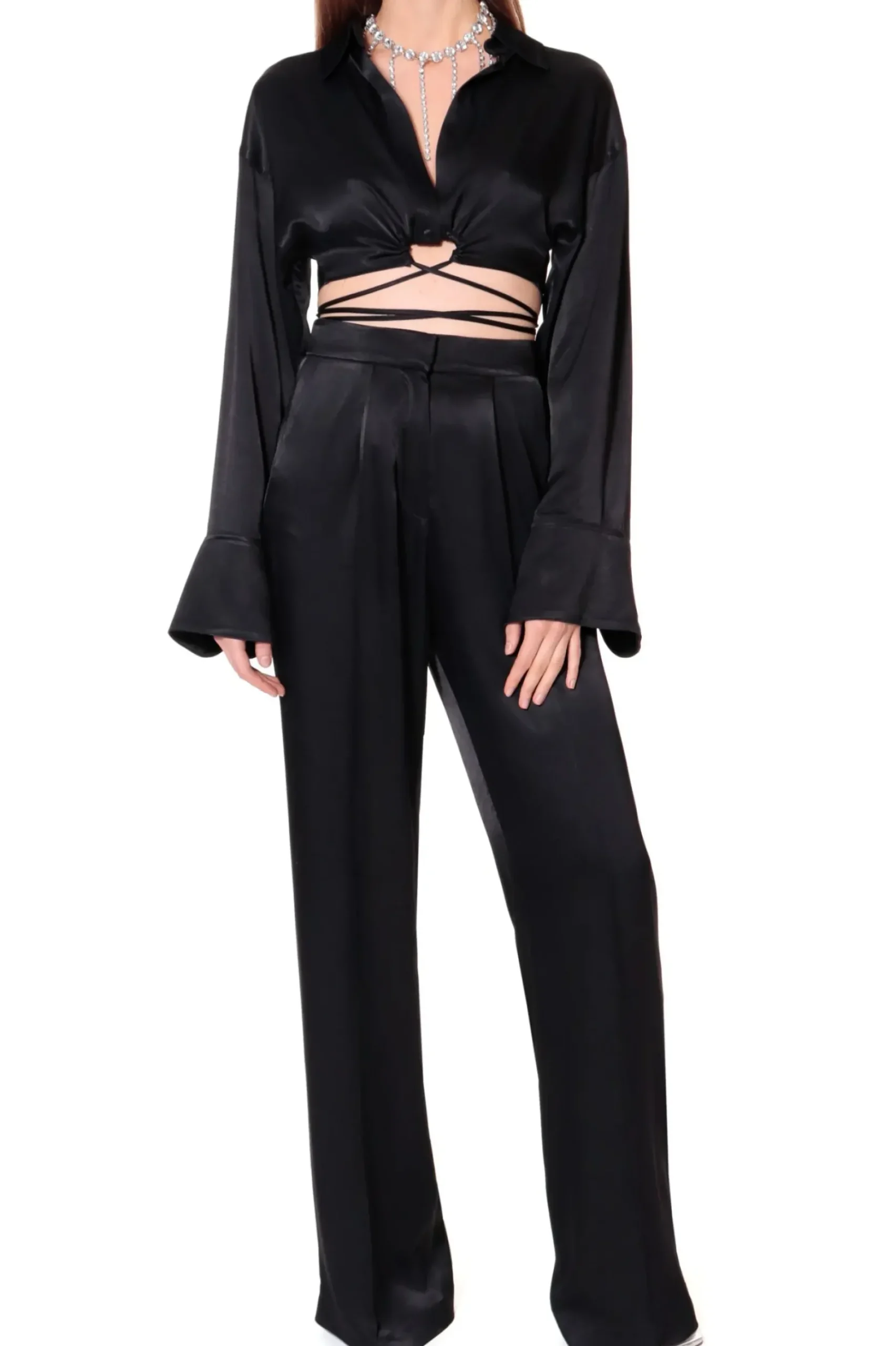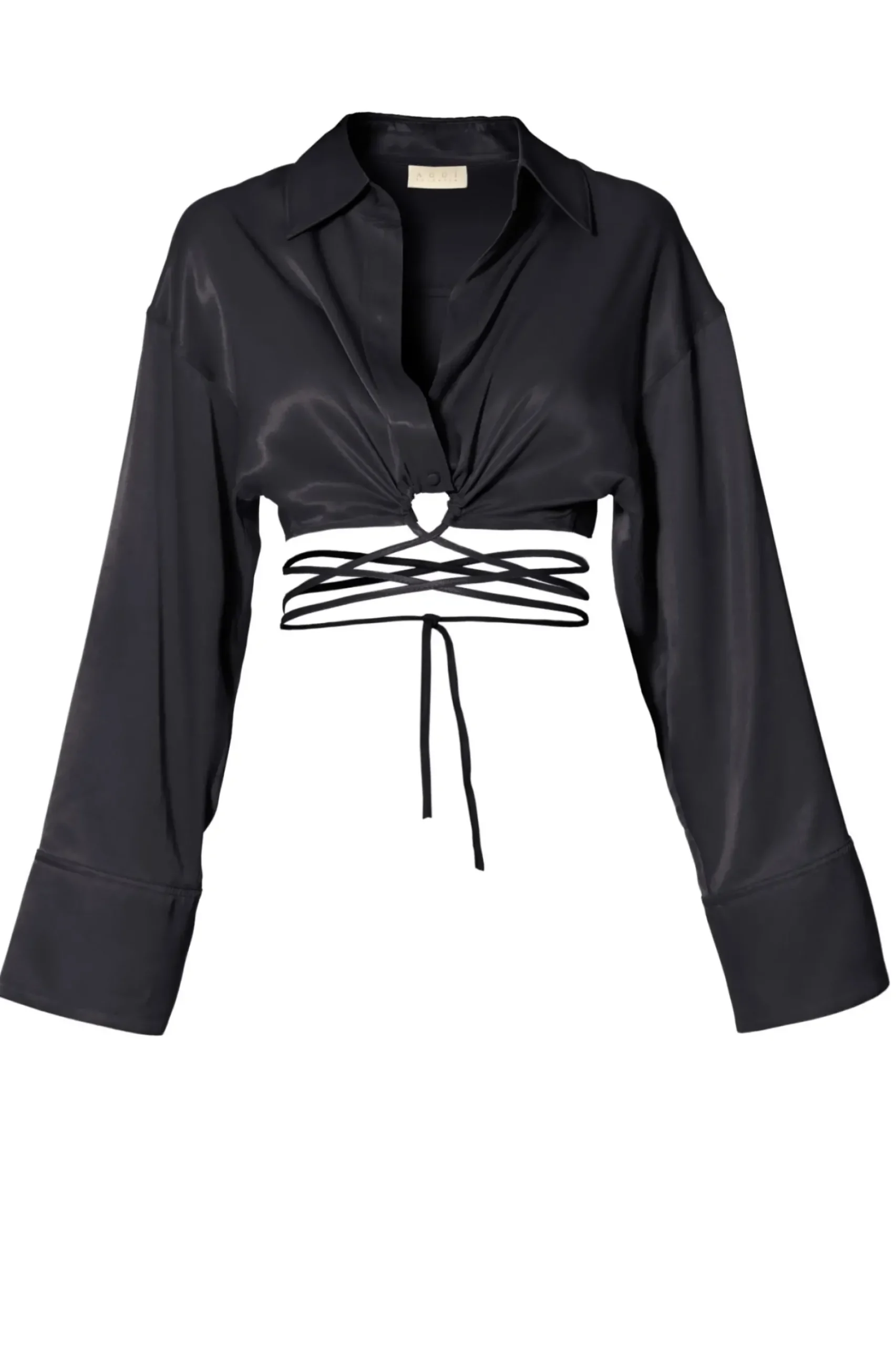 Atlasowa Bluzka Koszulowa Odslaniajaca Talie Przewiazana Zmyslowo Krzyzujacymi Sie Troczkami.