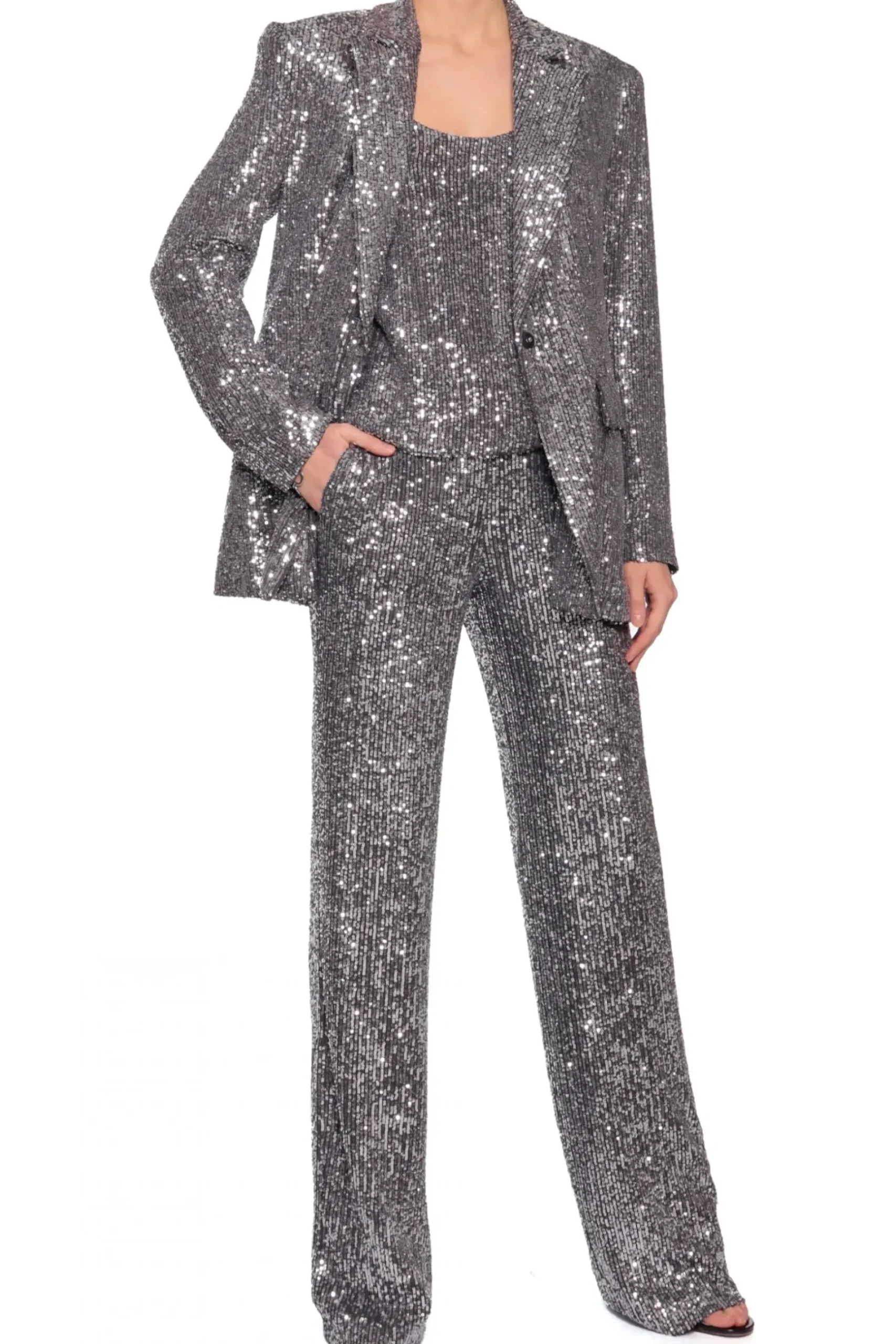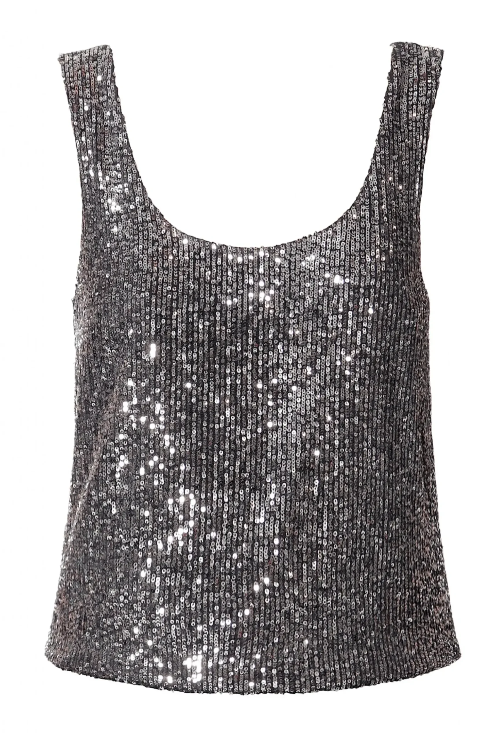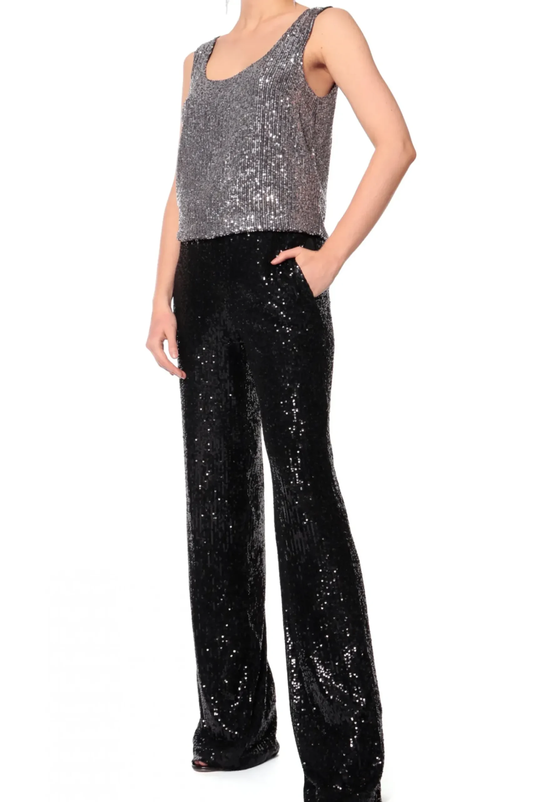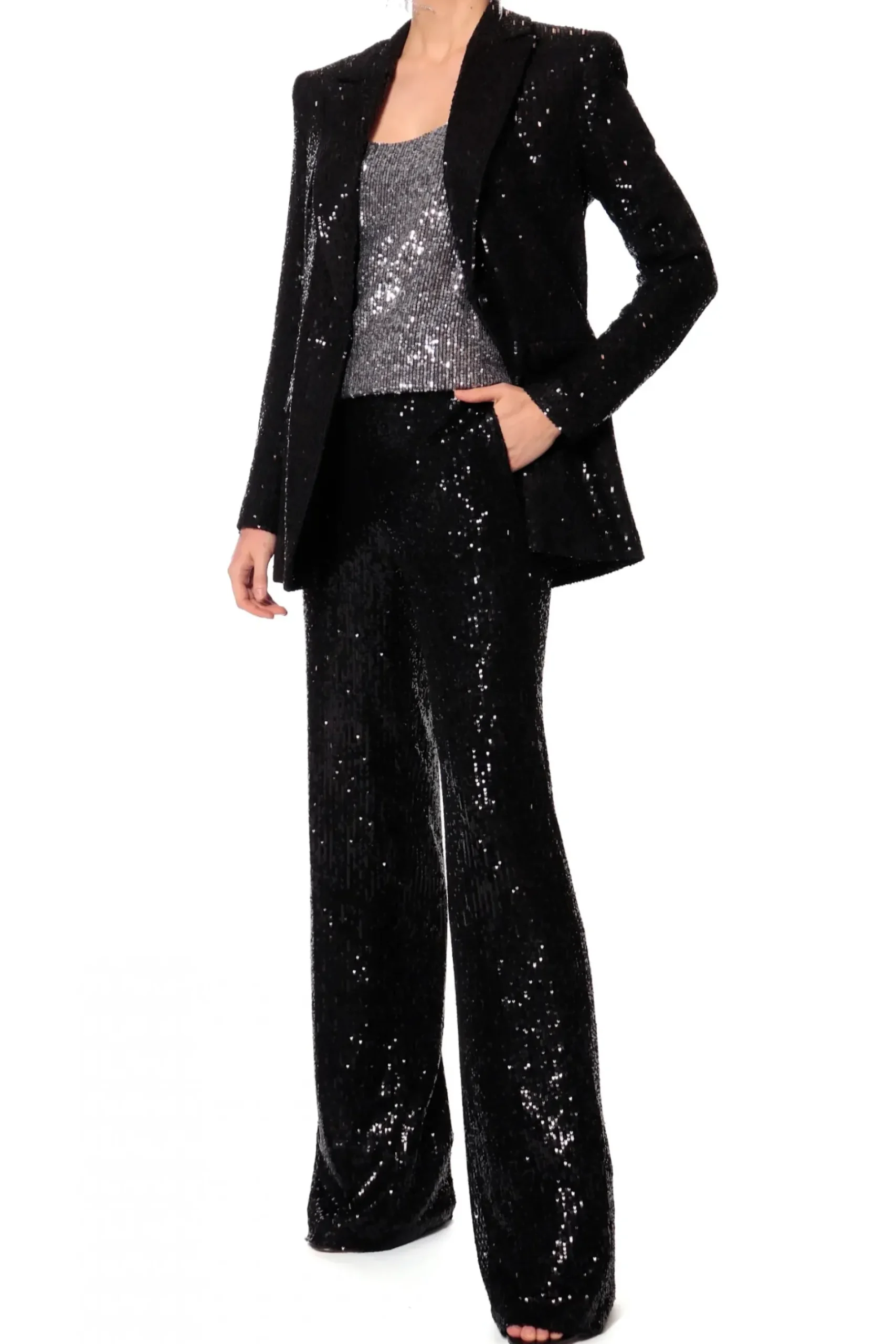 Dopasowany Crop Top Na Ramiaczkach Wykonany Z Materialu Wyszywanego Drobnymi Cekinami. Profilowany Fiszbinami Front Delikatnie Podkresla Biust. Zapinany Z Tylu Na Zamek. Z Cekinowymi Spodniami Luca Lub Olympe Obsidian Black Stworzy Idealny Look Na Sylwestra Lub Zabawe Karnawalowa. Do Dopelnienia Kreacji Nos Z Marynarka Luna Obsidian Black Oraz Wysokimi Szpilkami