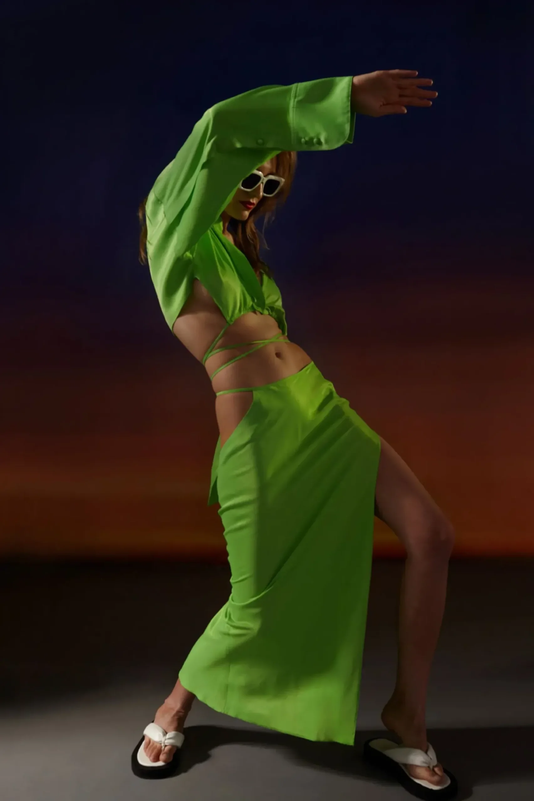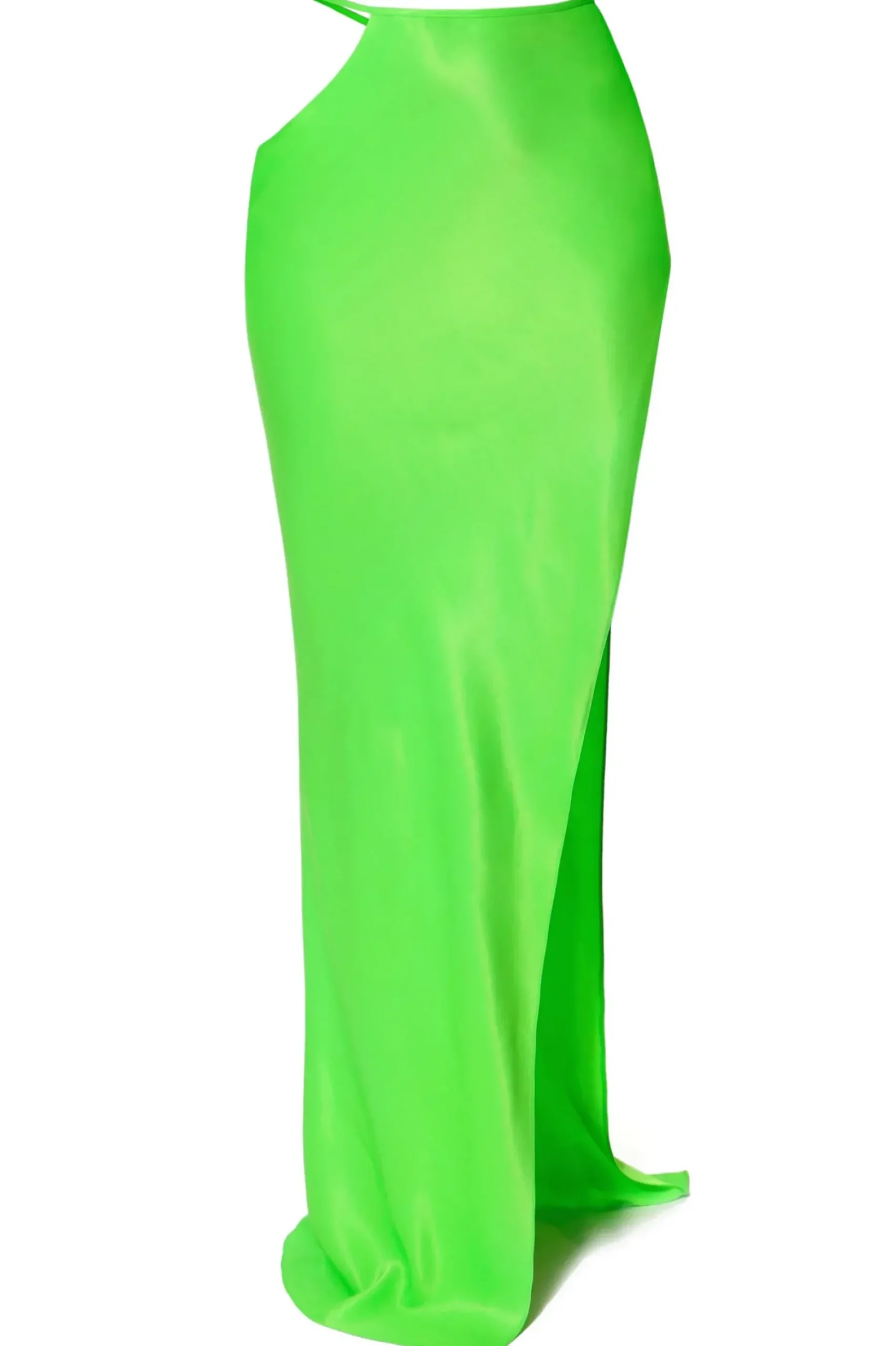 Spodnica Maxi Ze Zmyslowym Wycieciem Na Biodrze Wykonana Z Miesistego, Szlachetnego Atlasu W Odcieniu Neonowej Zieleni. Wysokie Rozciecie Odslaniajace Lewe Udo.