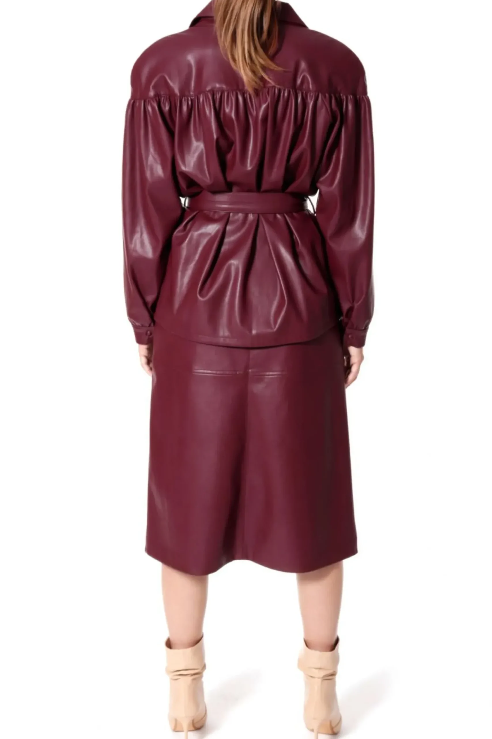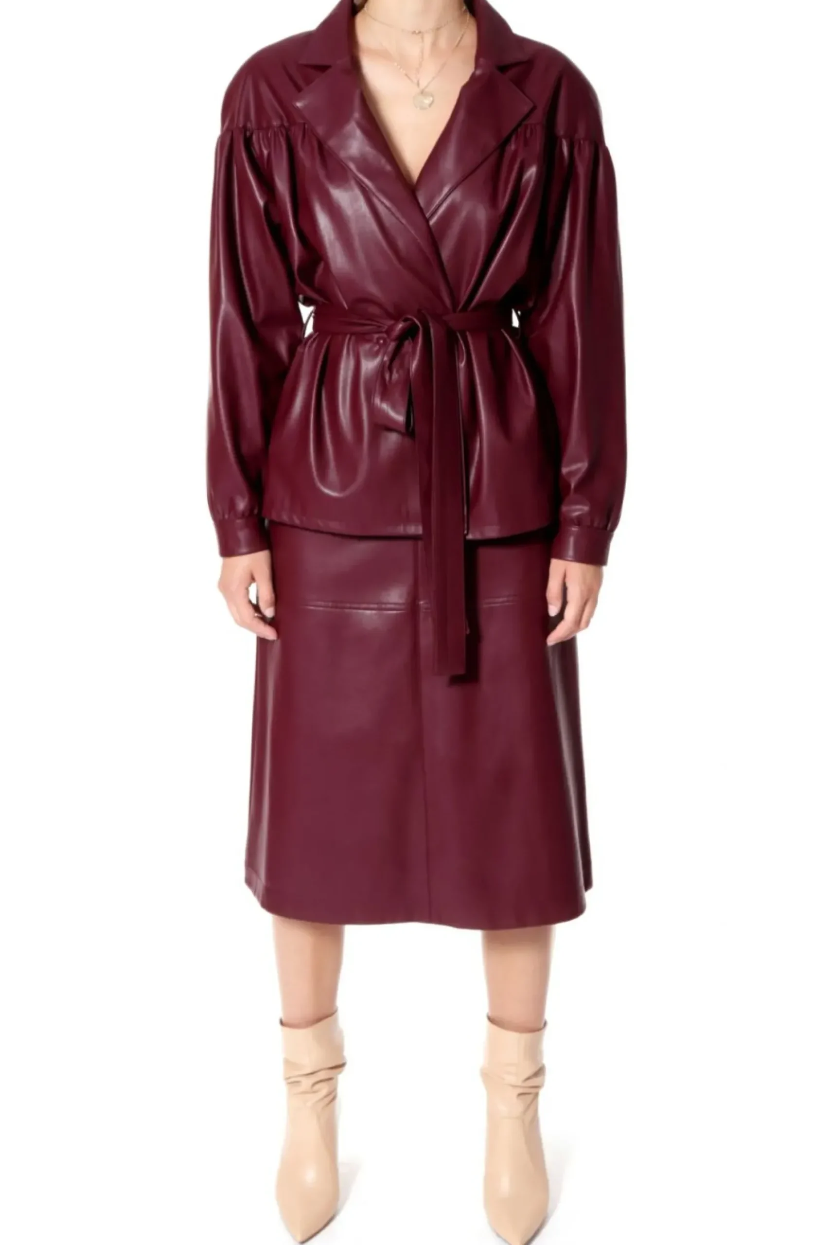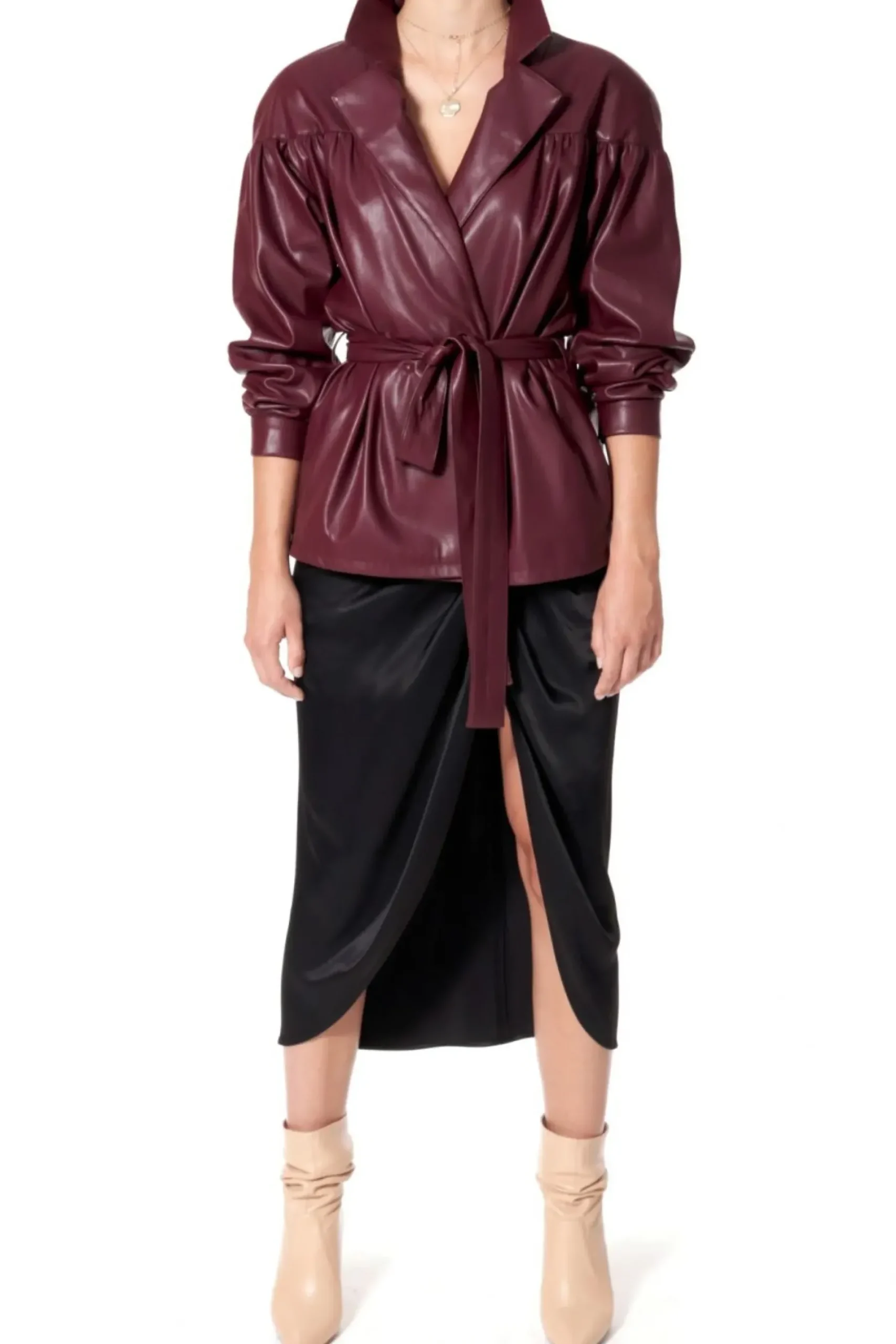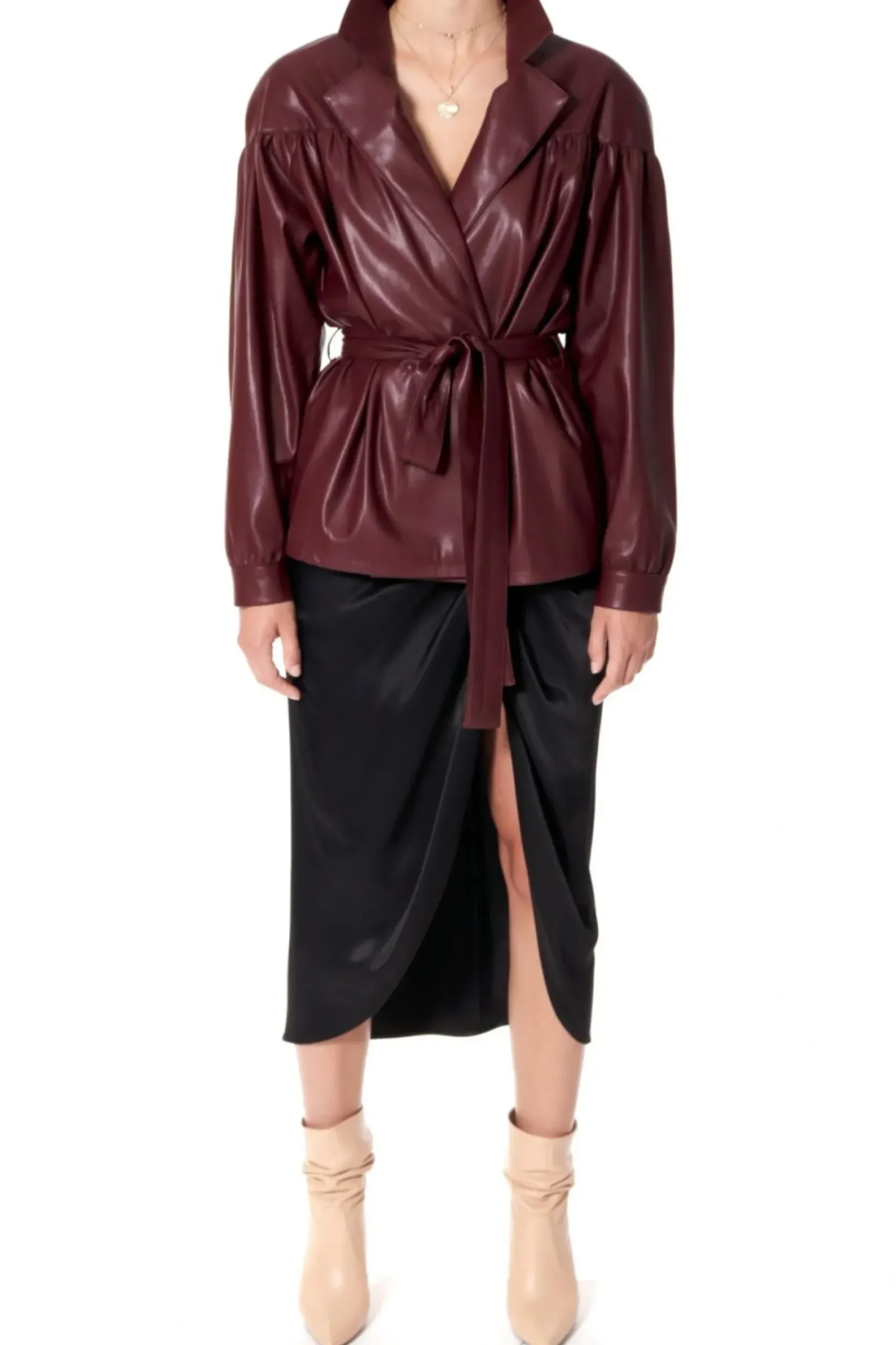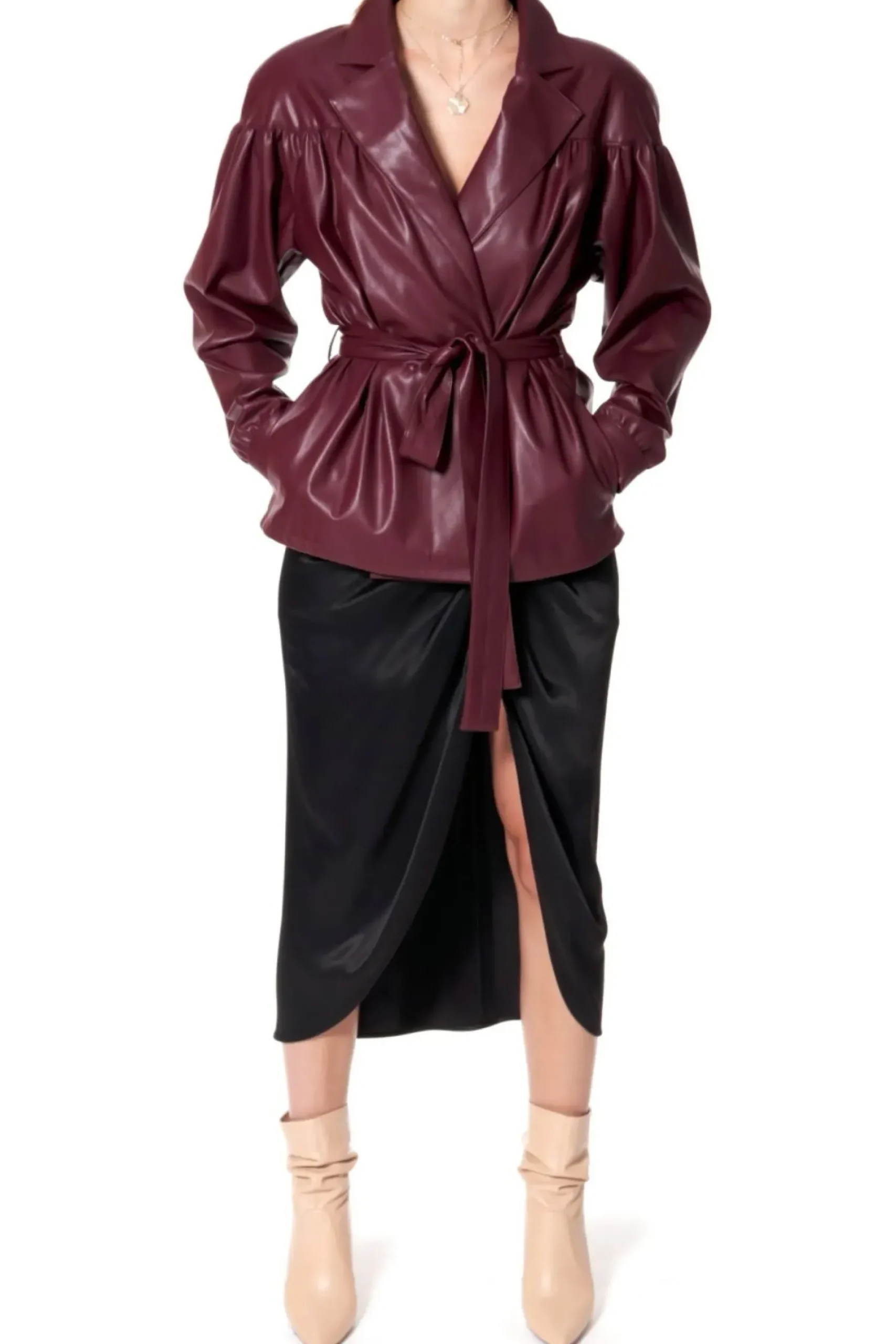 Rekawy Zakonczone Mankietami Zapinanymi Na Obleczone Skora Zatrzaski. Dwurzedowe Zapiecie Na Recznie Przyszywane Zatrzaski, Pokryte Skora Weganska. Talia Podkreslona Wiazanym Paskiem. W Szwach Bocznych Kieszenie. Calosc Na Delikatnej Zorzetowej Podszewce. Kurtka Skorzana Z Paskiem.