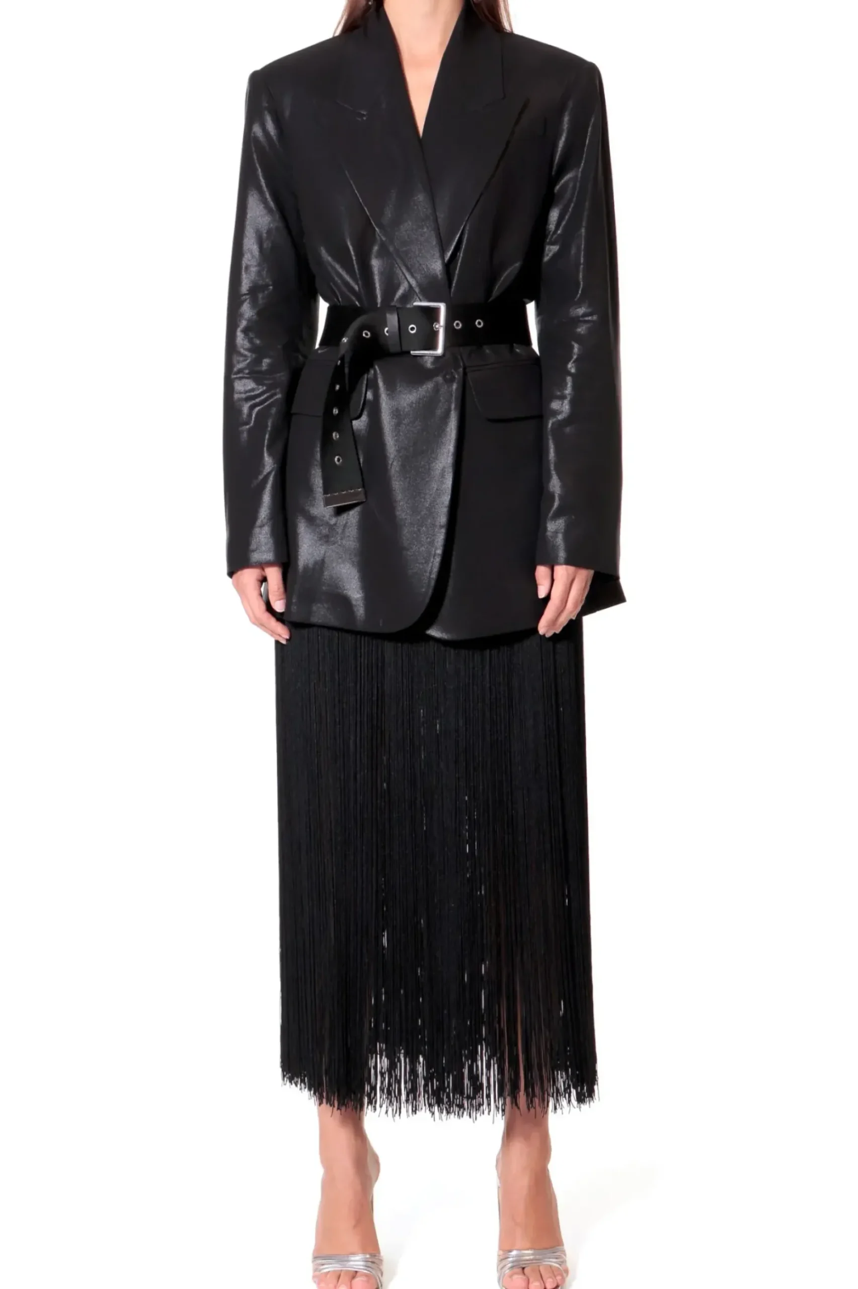 Oversizowa Marynarka Z Paskiem, Uszyta Z Delikatnej Tkaniny O Mokrym Polysku.