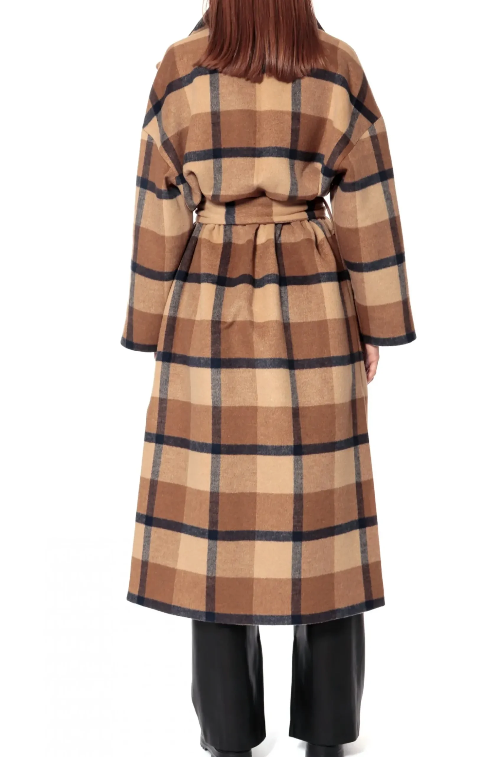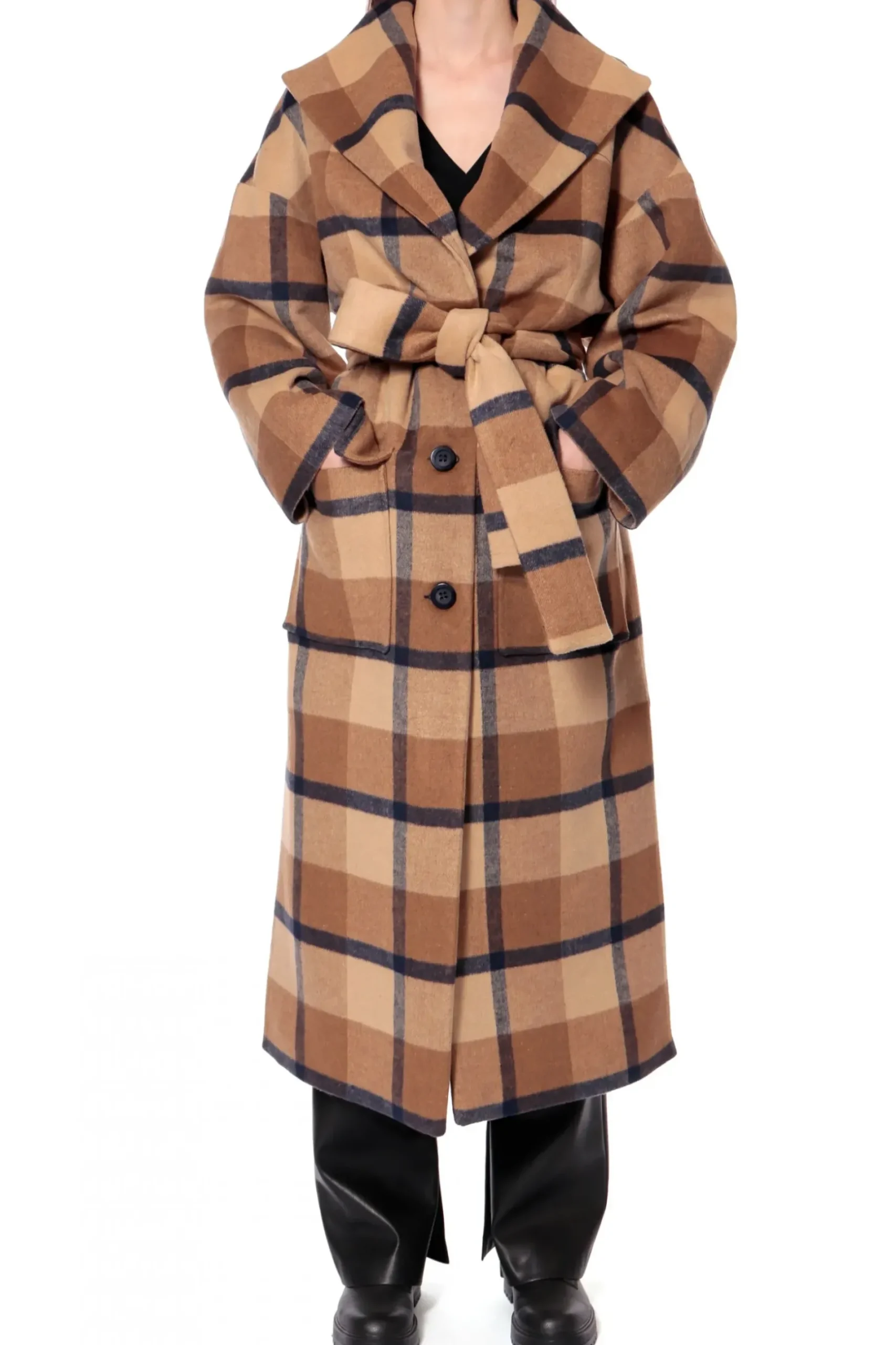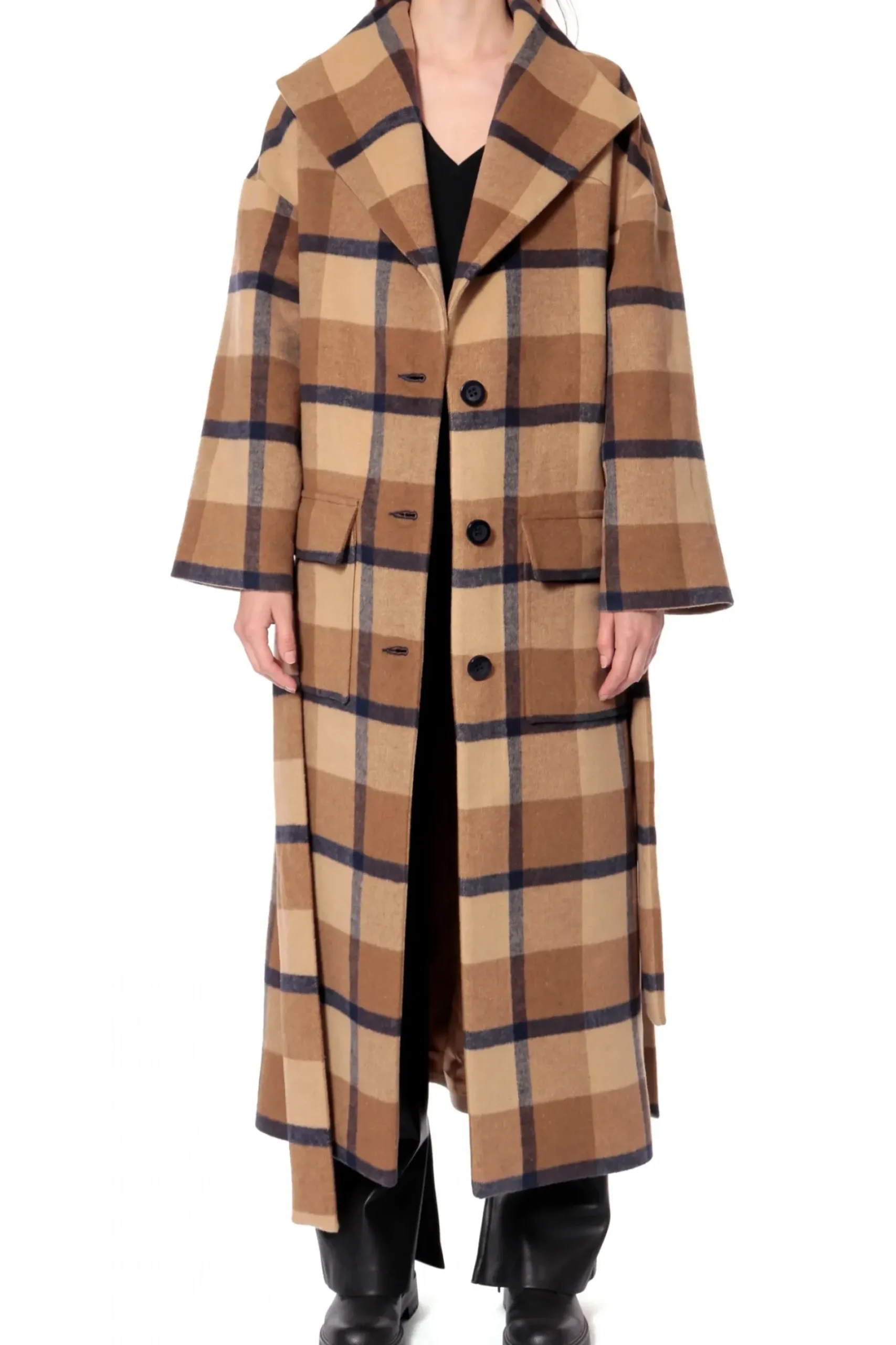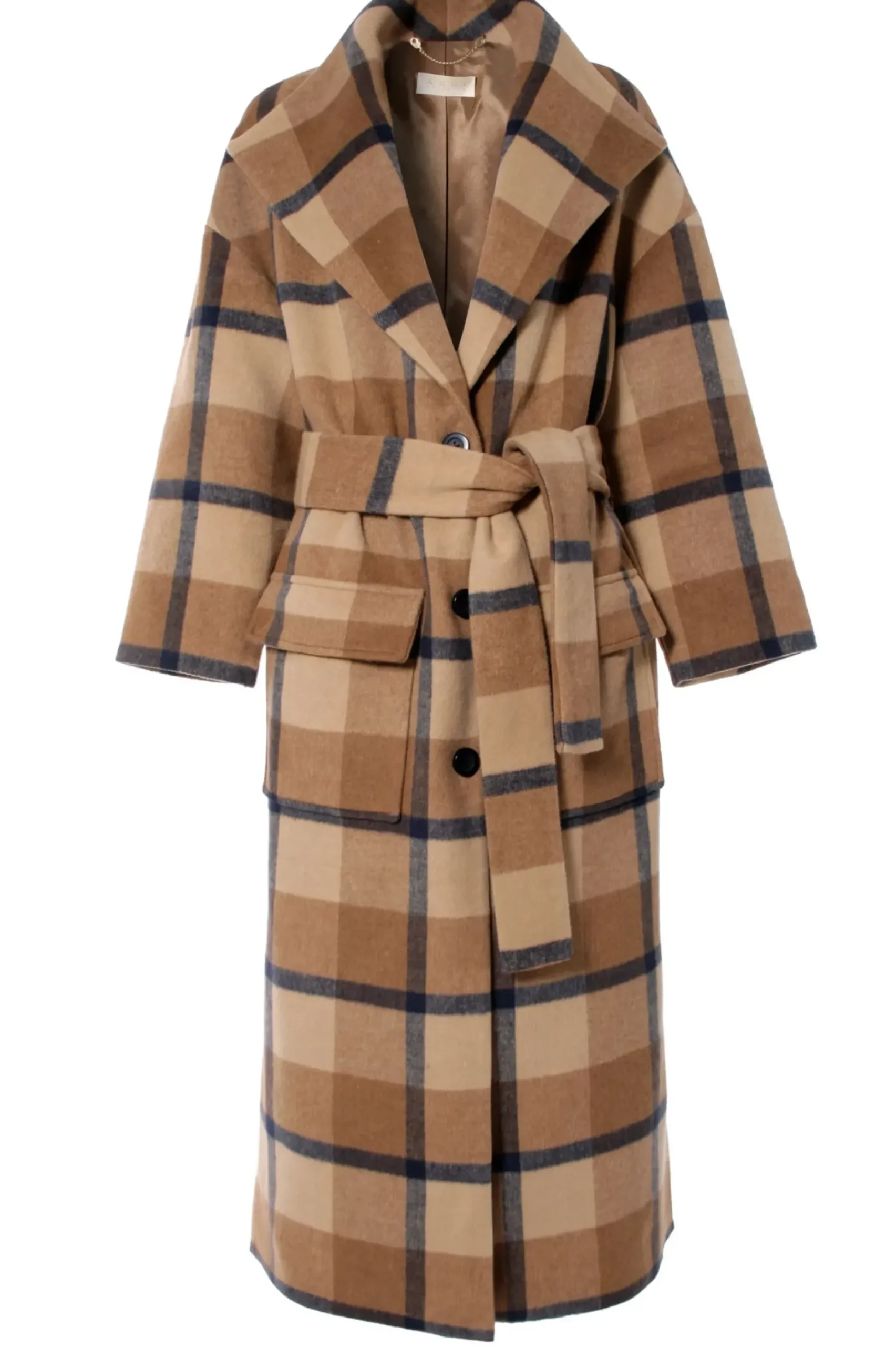 Dlugi Plaszcz Jednorzedowy Wykonany Z Przyjemnej W Dotyku Mieszanki Welny. Wzor W Duza Krate W Odcieniach Brazu I Kawy Z Mlekiem Wraz Z Miekkim Materialem Nadaja Projektowi Przyjemny, Komfortowy Charakter. Stojacy Kolnierz Przechodzi W Szerokie Klapy, Ktorymi Mozna Sie Owinac W Wietrzne Dni. Zapinany Na Duze Czarne Guziki, Dodatkowo Wiazany Jest Szerokim Paskiem. Obszerne Boczne Nakladane Kieszenie Z Klapami Idealnie Wtapiaja Sie We Wzor Dzieki Czemu Projekt Tworzy Harmonijna Calosc.