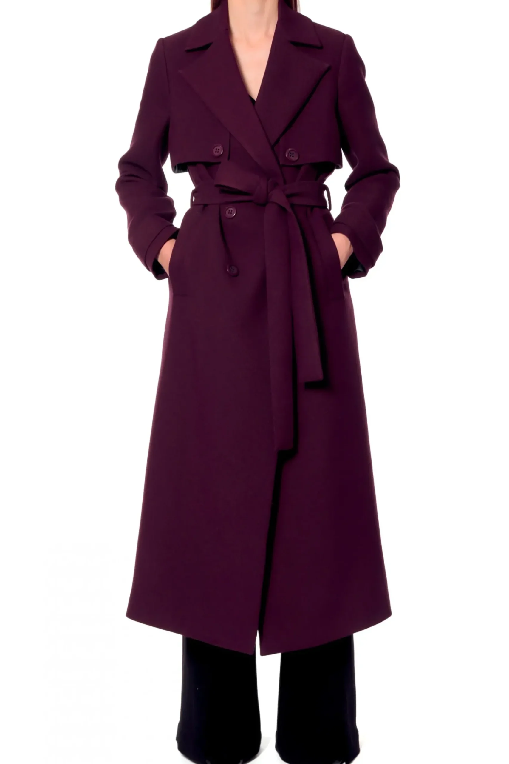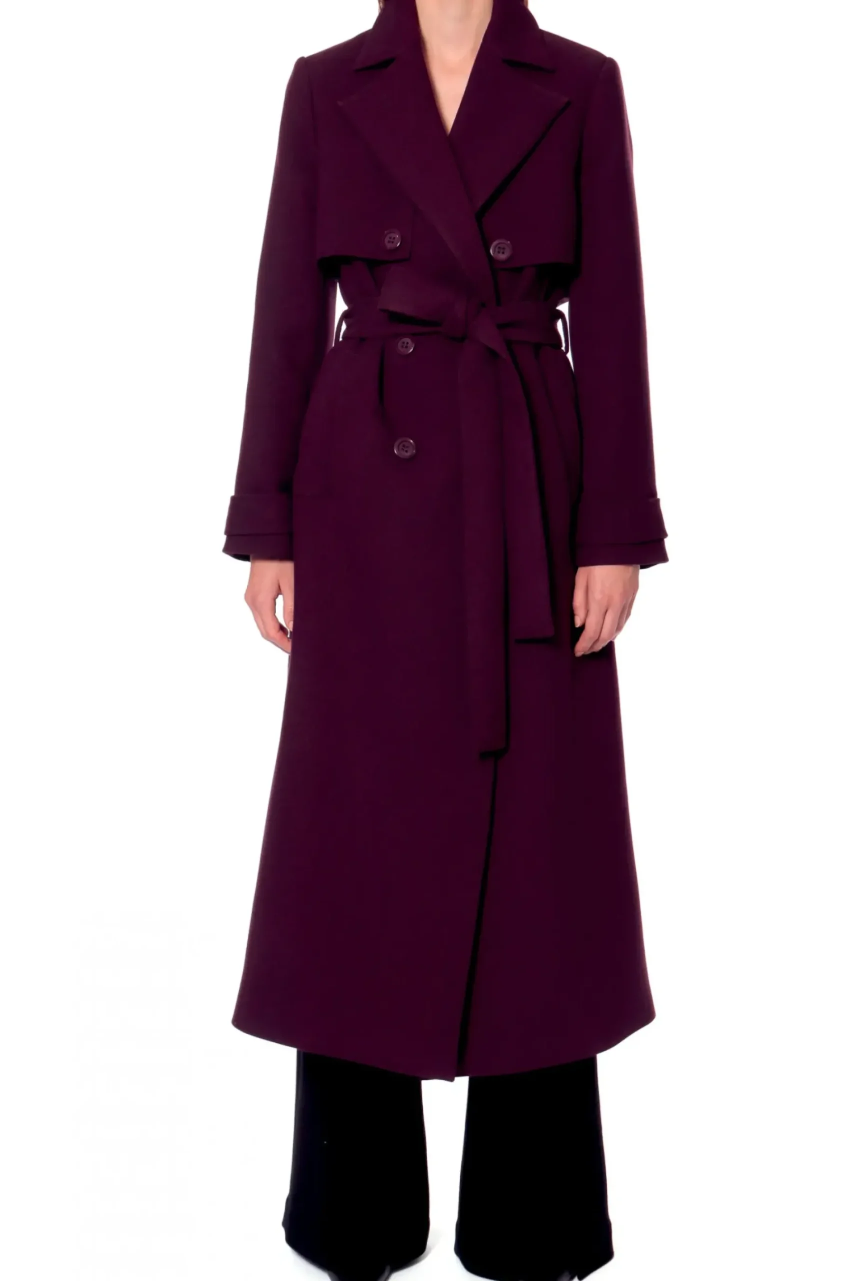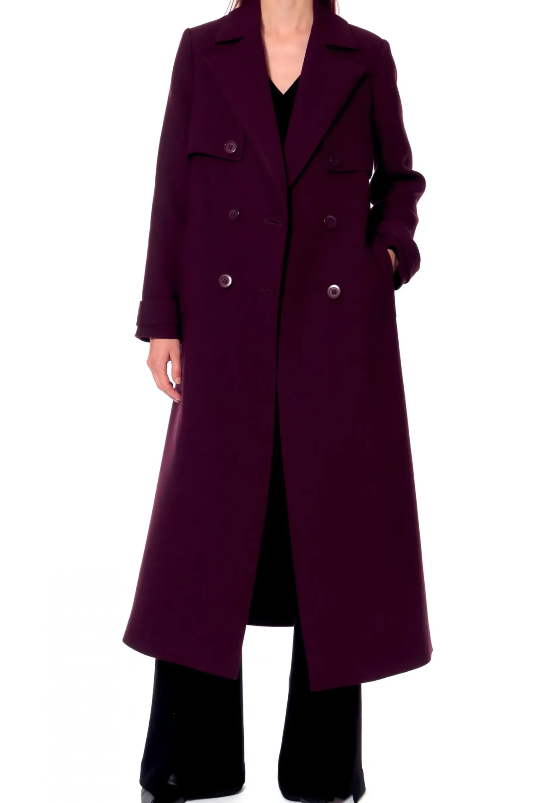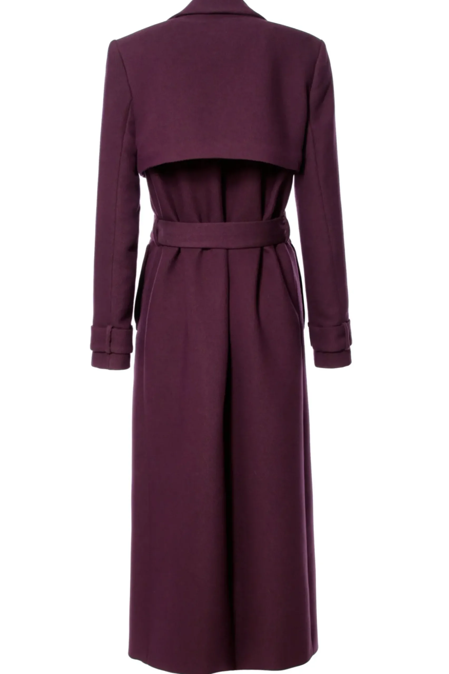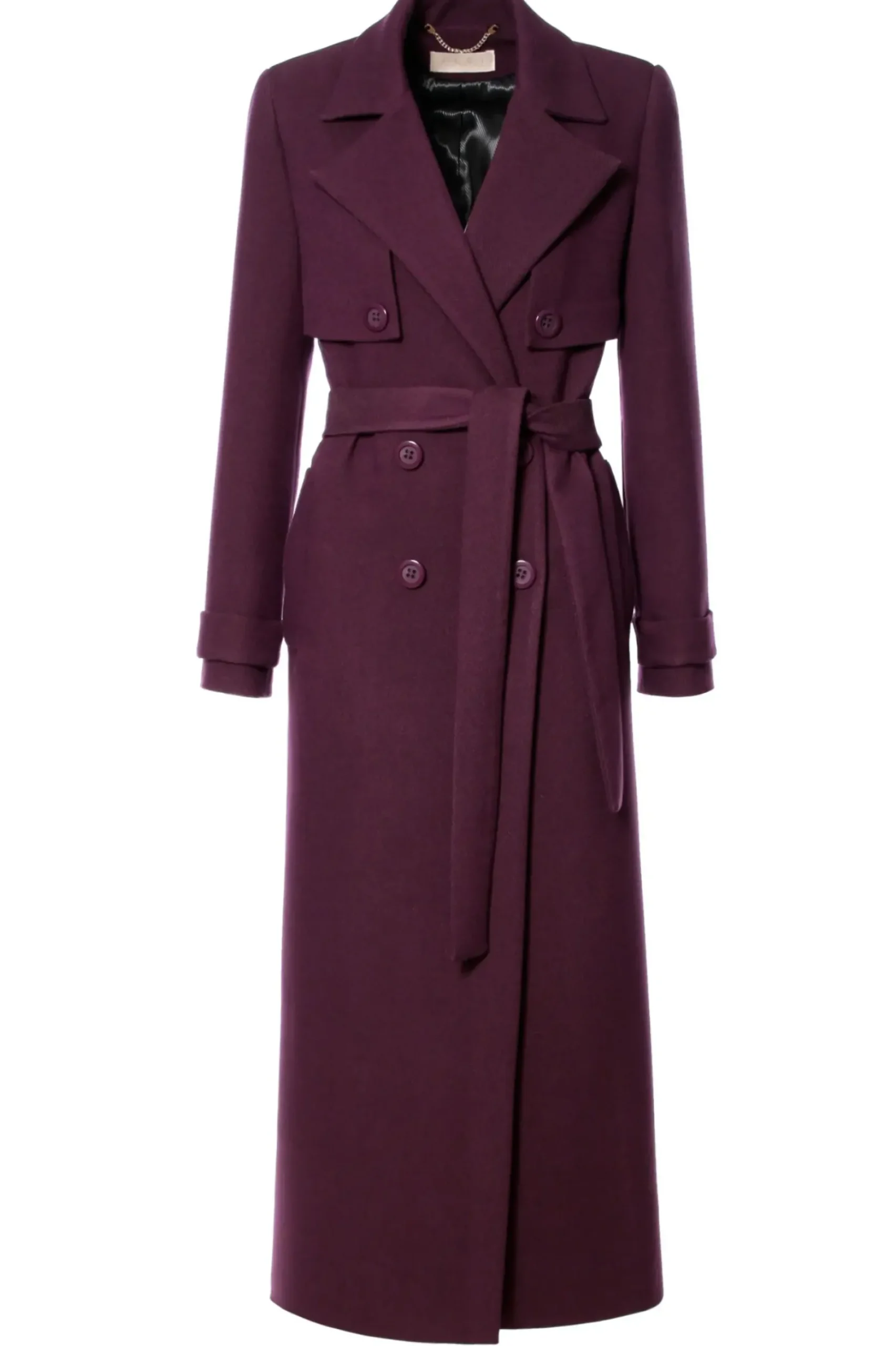Elegancki, Dlugi Plaszcz W Stylu Lat 70 Tych, Wykonany Z Miesistej Tkaniny W Jesiennym Odcieniu Sliwki. Dwurzedowy, Z Przedluzonym Tylem Oraz Przednimi Klapami Mocowanymi Na Guziki. Klasyczny, Dlugi Kolnierz Nadaje Projektowi Ponadczasowy Charakter. Dodatkowo Wiazany Jest W Pasie Szerokim Paskiem Z Tego Samego Materialu. Plaszcz Jest Podszyty Zakardowa Podszewka W Czarny Prazek.