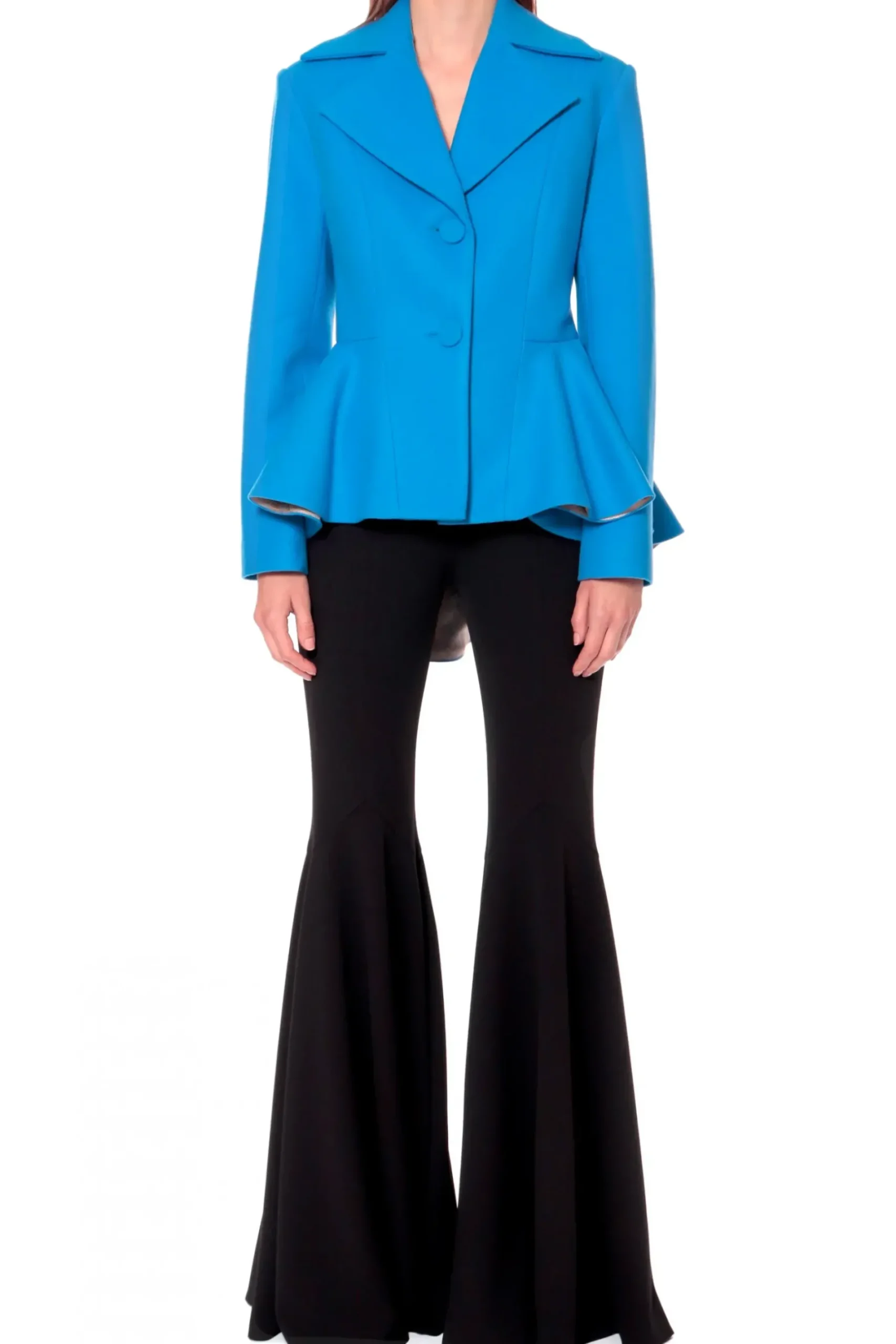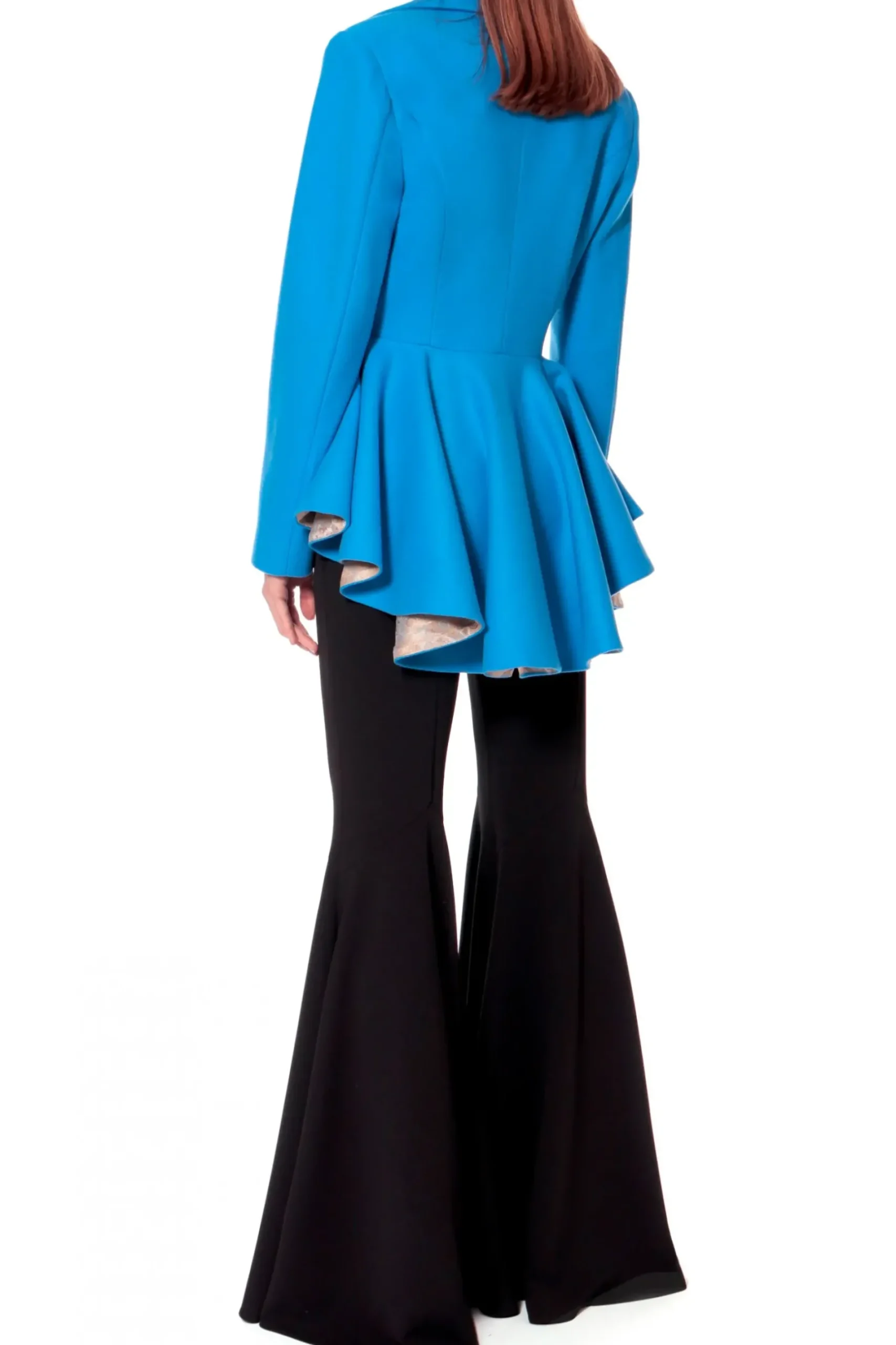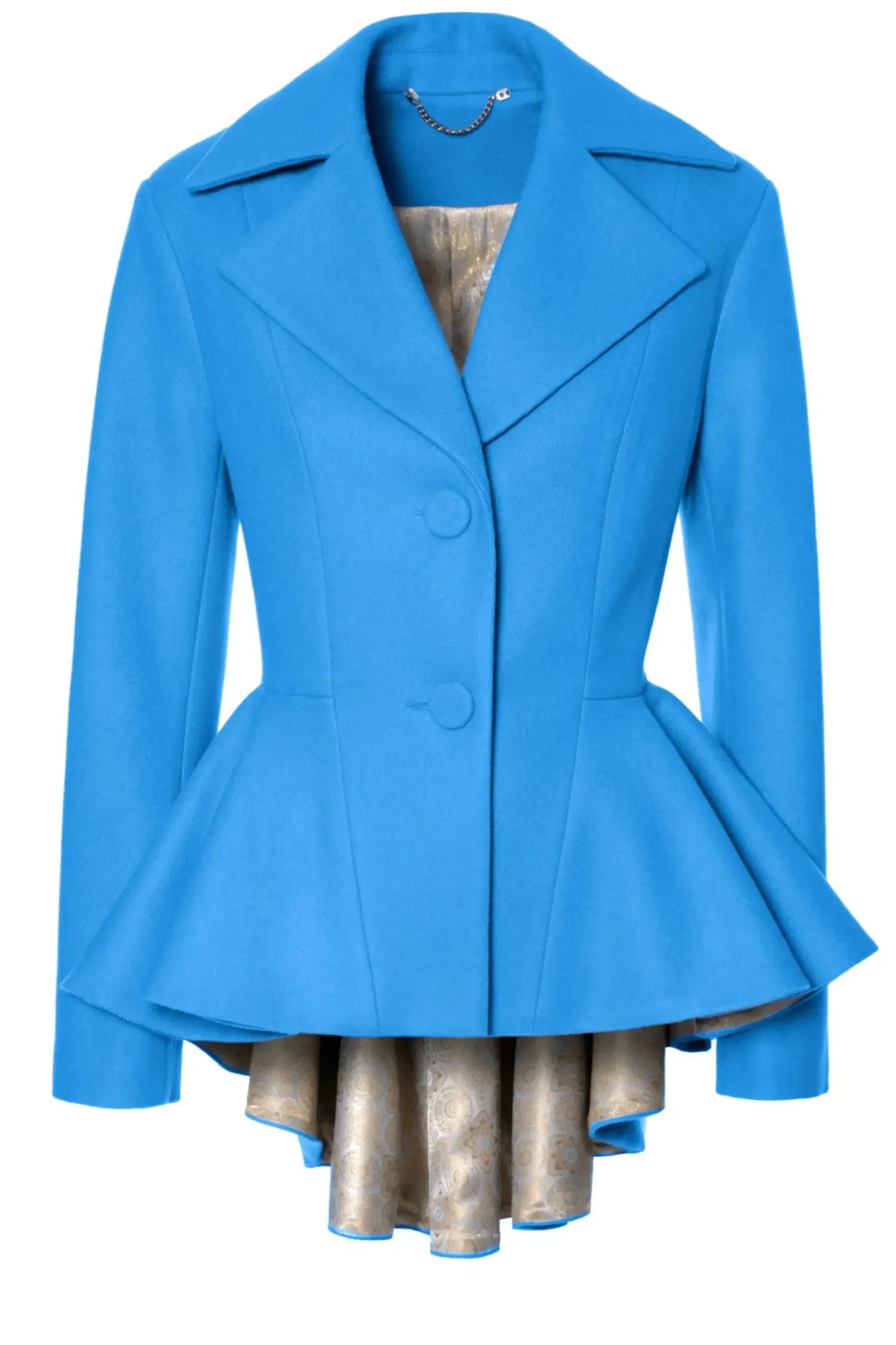 Przyciagajacy Wzrok, Dopasowany, Jednorzedowy, Krotki Plaszcz W Intensywnym Lazurowym Odcieniu. Projekt Wykonany Z Miesistej, Cieplej Mieszanki Welny I Akrylu. Duzy Kolnierz I Klapy O Ostrym Kroju Wraz Z Mocno Zaznaczona Linia Talii Podkreslaja Kobiece Ksztalty. Rozkloszowanie Precyzyjnie Odciete Od Talii W Dol, Z Przodu Elegancko Rozchodzi Sie Na Boki Optycznie Poszerzajac Biodra, Z Tylu Przechodzac W Wyraznie Dluzsza Falbane. Zapiecie Na Oblekane Materialem Guziki. Calosc Podszyta Zakardowa Podszewka W Ornamentowy Wzor.