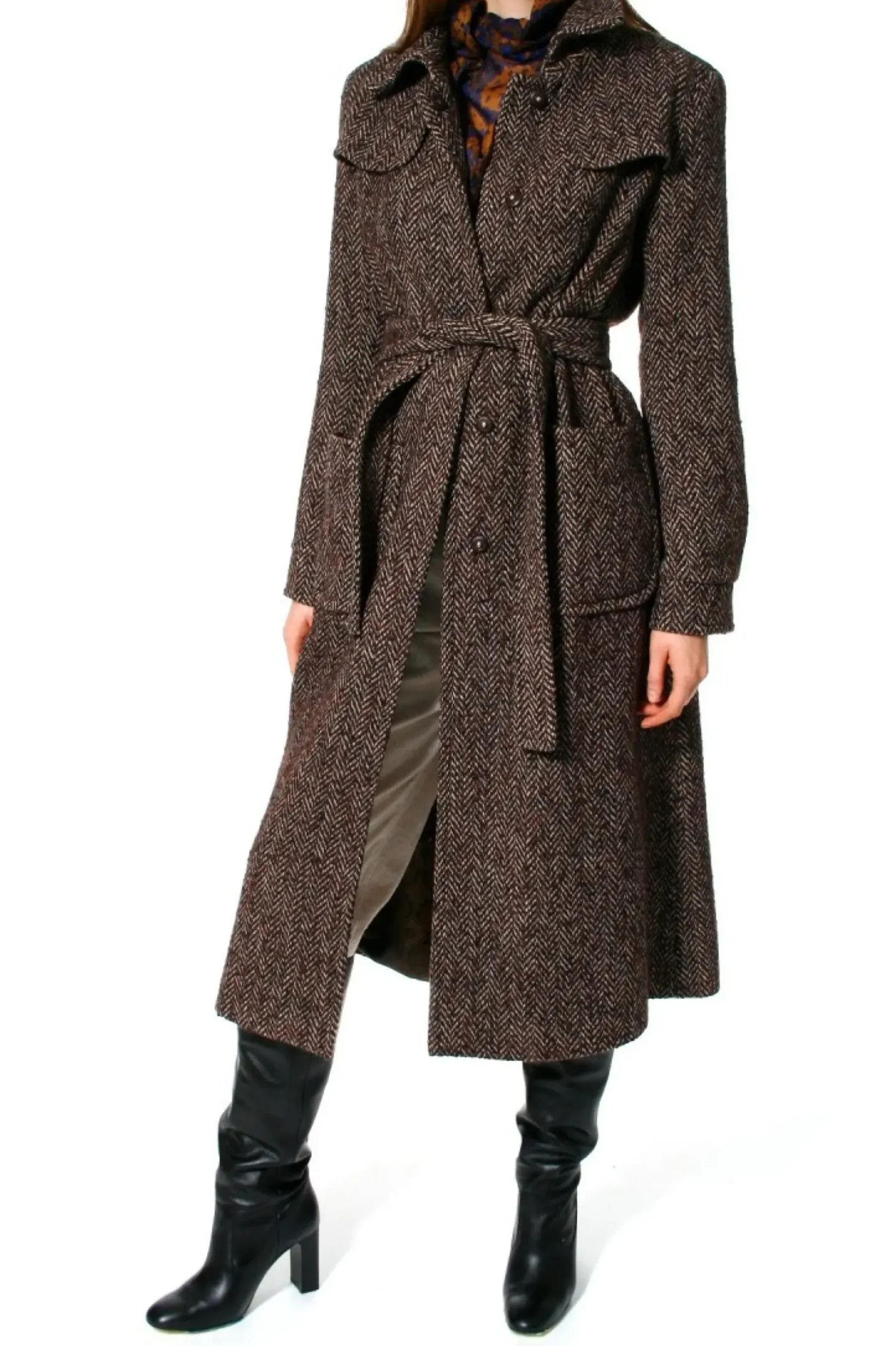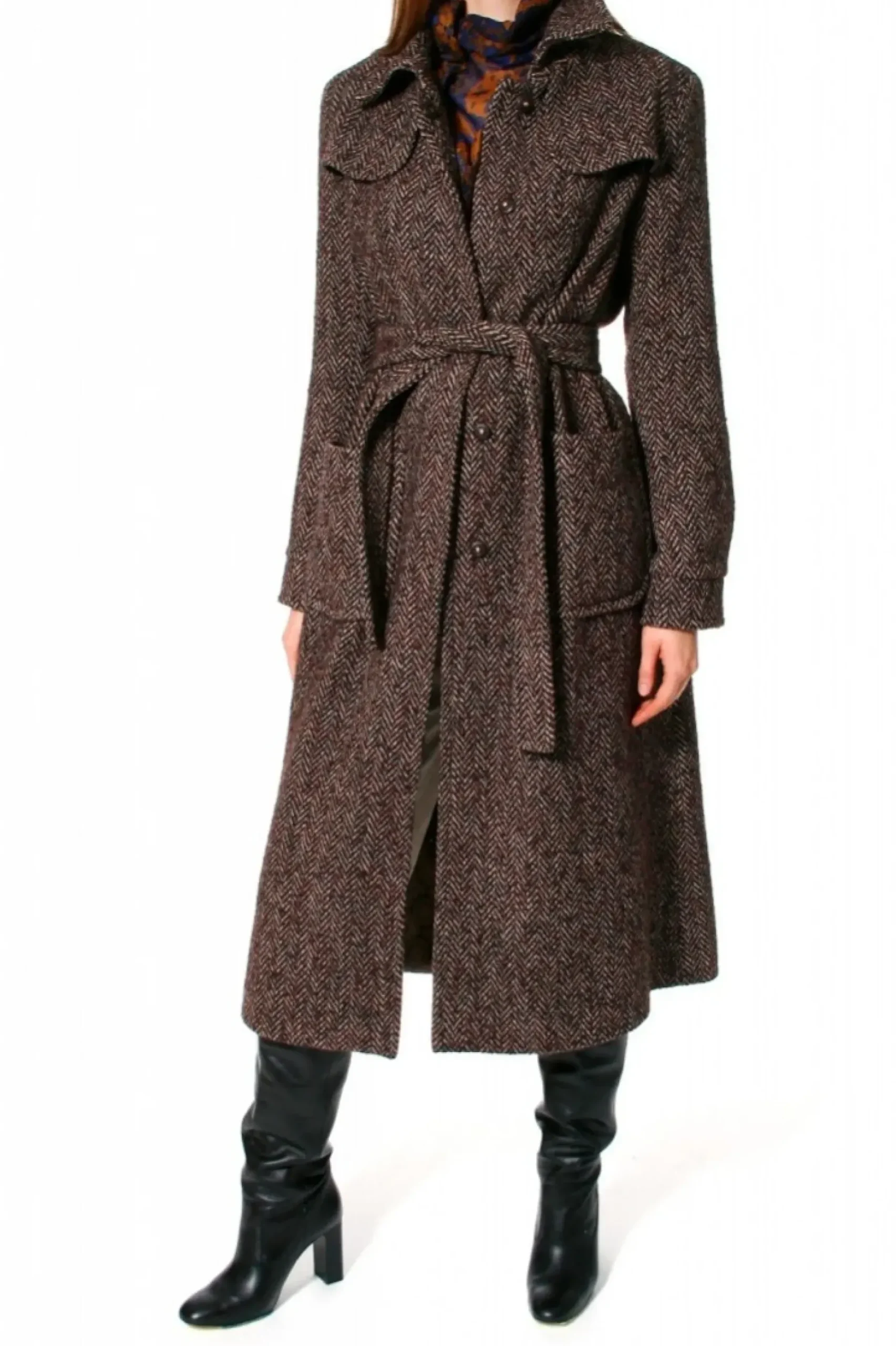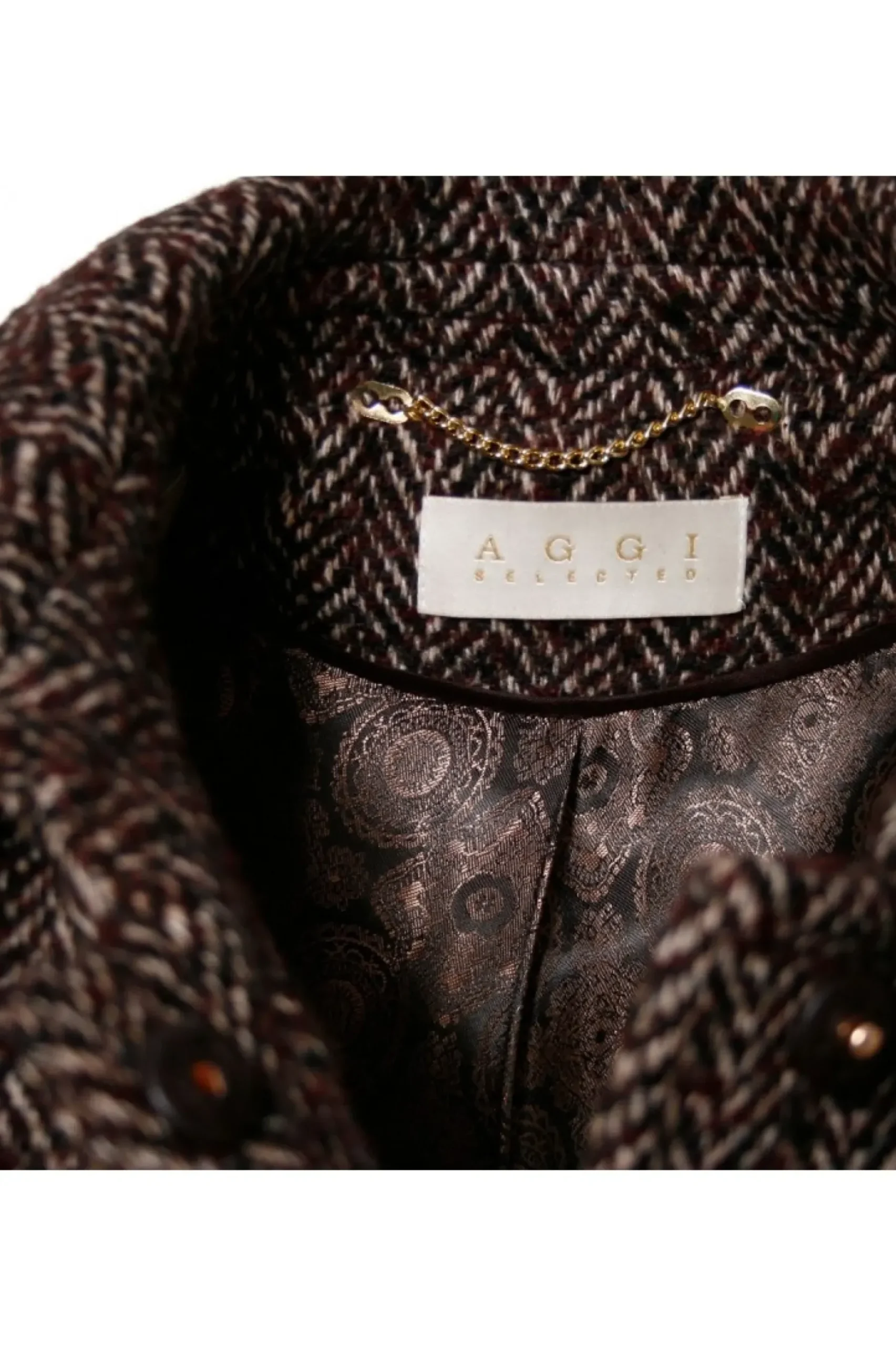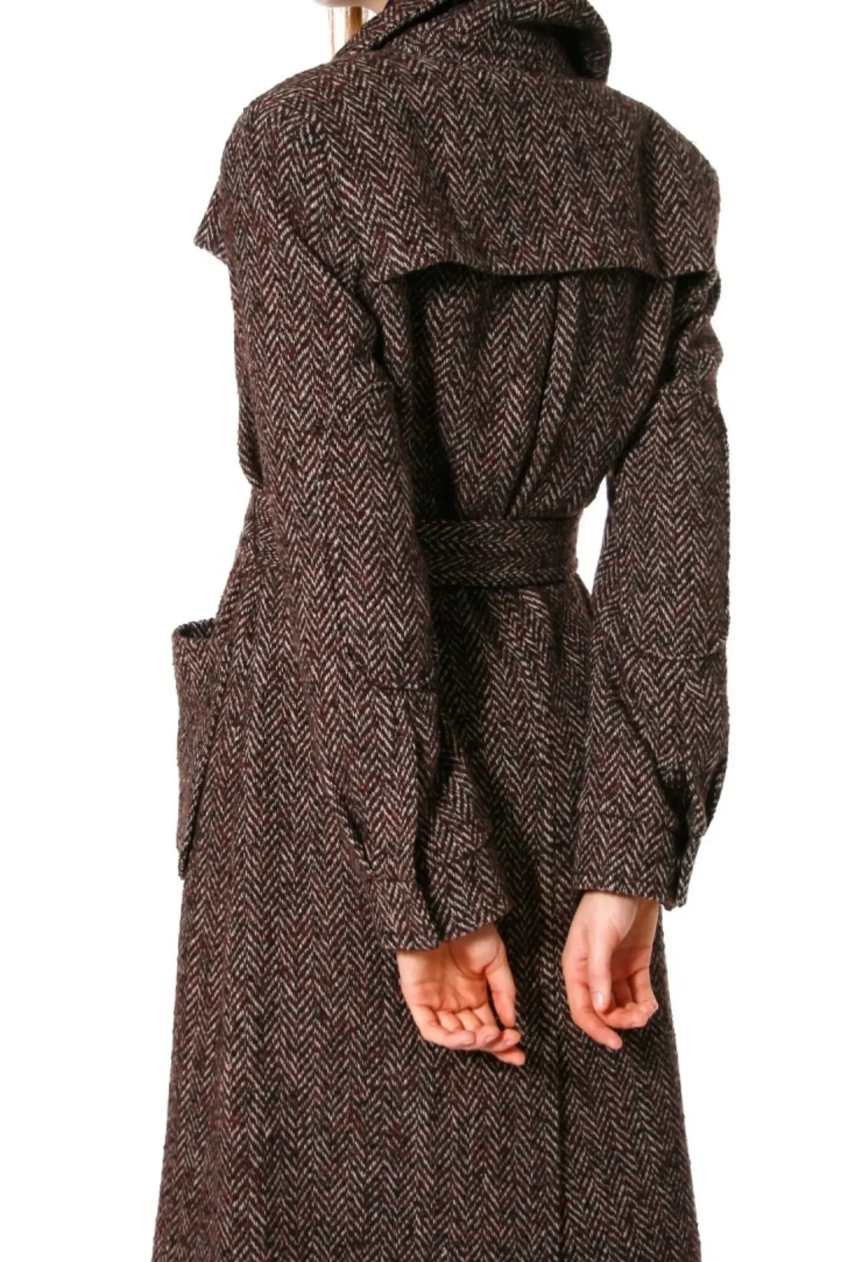 Plaszcz Midi Uszyty Z Miekkiego, Strukturalnego Tweedu W Jodelke. Melanzowa Tkanina Laczaca Odcien Ciemnego, Czekoladowego Brazu, Kremu Oraz Nute Bordo. Projekt Utrzymany W Klimacie Lat 70-Tych. Spiczasty Kolnierz Na Stojce, Patki Z Przodu I Z Tylu Plaszcza. Nakladane Kieszenie Korespondujace Linia Z Patkami. Prosty Rekaw Zakonczony Mankietem Zapinanym Na Duze Zatrzaski. Plaszcz Zapinany Jednorzedowo Na Duze, Zatrzaski Obciagniete Skora Weganska W Ciemnobrazowym Kolorze. W Talii Przewiazywany Pasek. Calosc Na Zakardowej Podszewce W Ornamentowy Wzor.