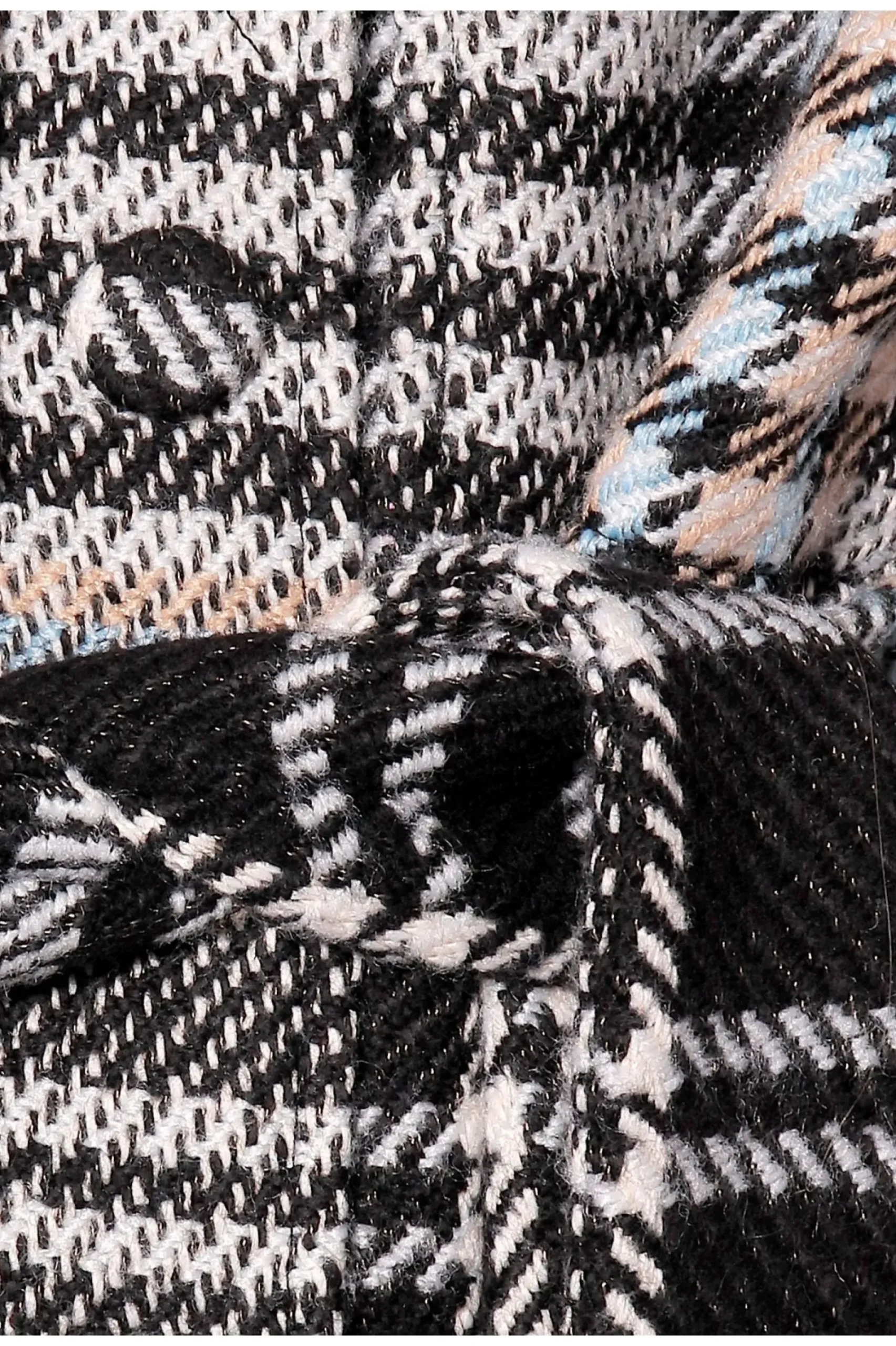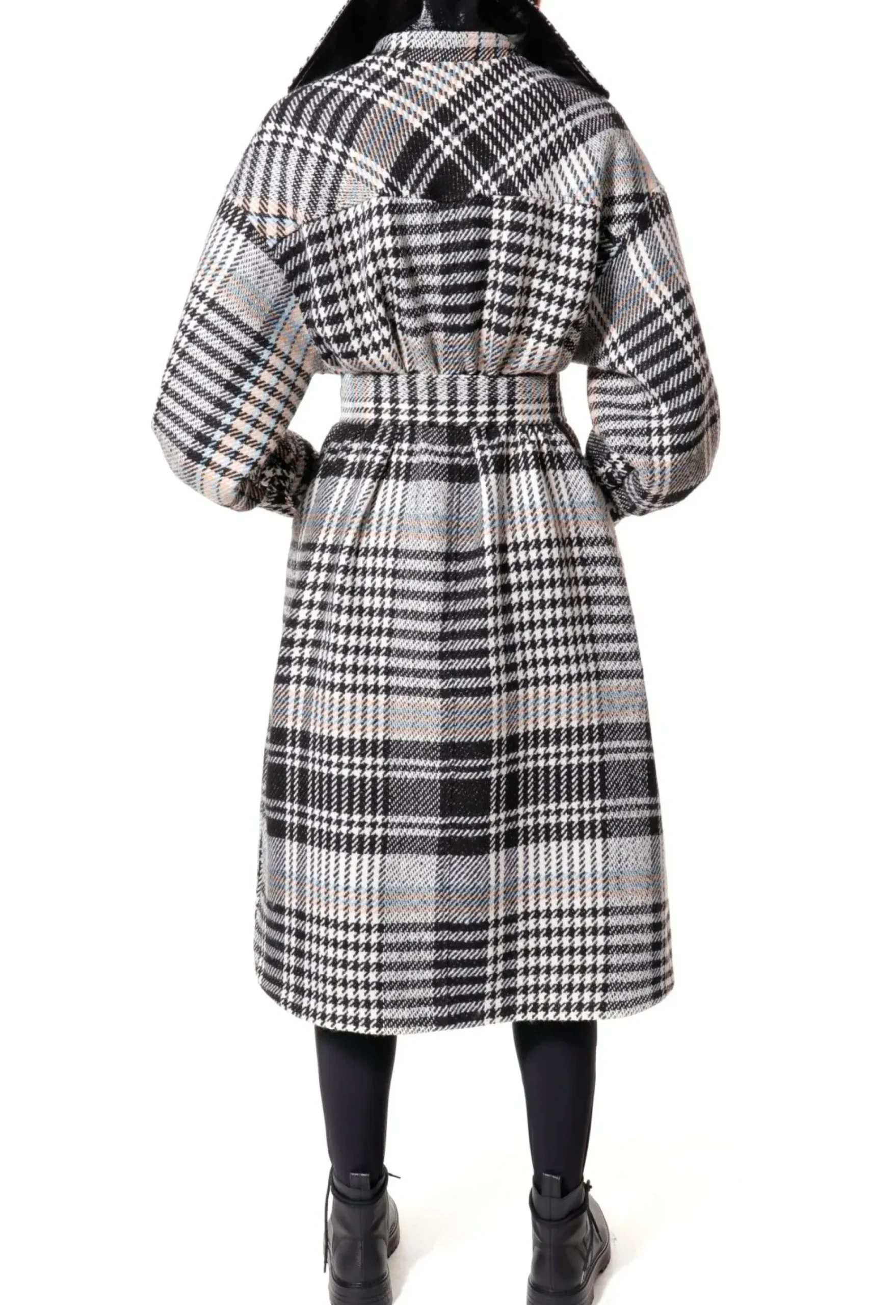 Plaszcz Maxi W Wyrazista Krate Inspirowany Krojem Sportowej Koszuli. Efektowny, Kraciasty Desen Tworza Klasyczne, Neutralne Kolory: Krem, Czern, Cieply Bez I Jasny Blekit. Charakterystyczny Kolnierz Na Stojce Wykonczony Czarna Lakierowana Weganska Skora. Duze, Ozdobne Nakladane Kieszenie Z Patkami Z Przodu Oraz Dodatkowo W Szwach Bocznych Ukryte Praktyczne Kieszenie. Oversizowy Fason I Krata Stanowia O Eleganckim A Zarazem Swobodnym Charakterze Projektu. Rekaw Z Luzniejsza Pacha Pozwala Na Swobodne Noszenie Marynarki Lub Szerszego Swetra Pod Płaszczem. Talia Przewiazywana Szerokim Paskiem. Zapinany Na Metalowe Zatrzaski W Kolorze Srebrnym Z Zewnatrz Obleczone Kraciasta Tkanina Zasadnicza. Plaszcz Doskonale Wyglada Noszony Takze Bez Paska. Calosc Na Zakardowej Podszewce W Mozaikowy Zloto-Blekitny Desen.
