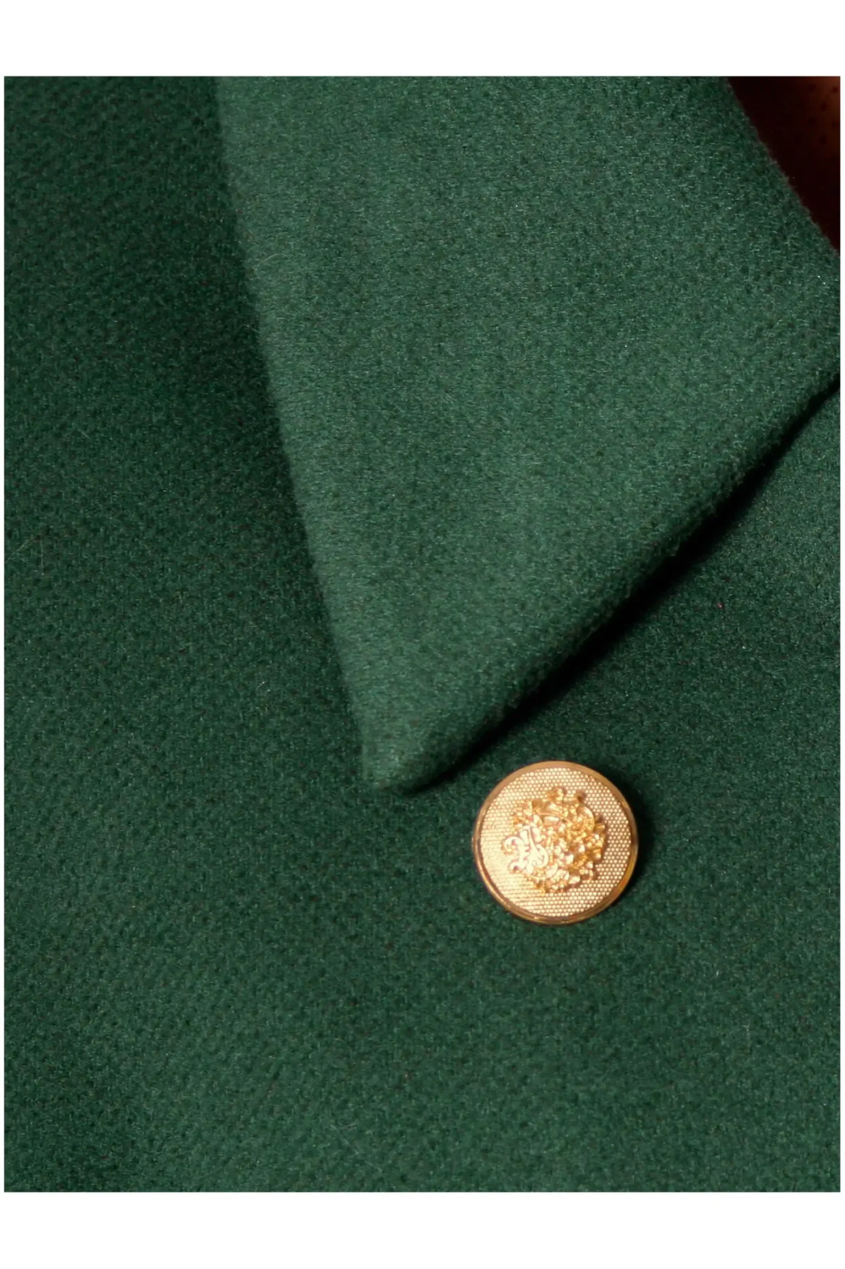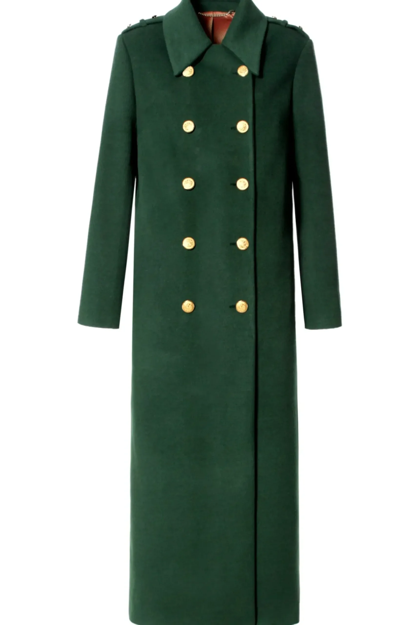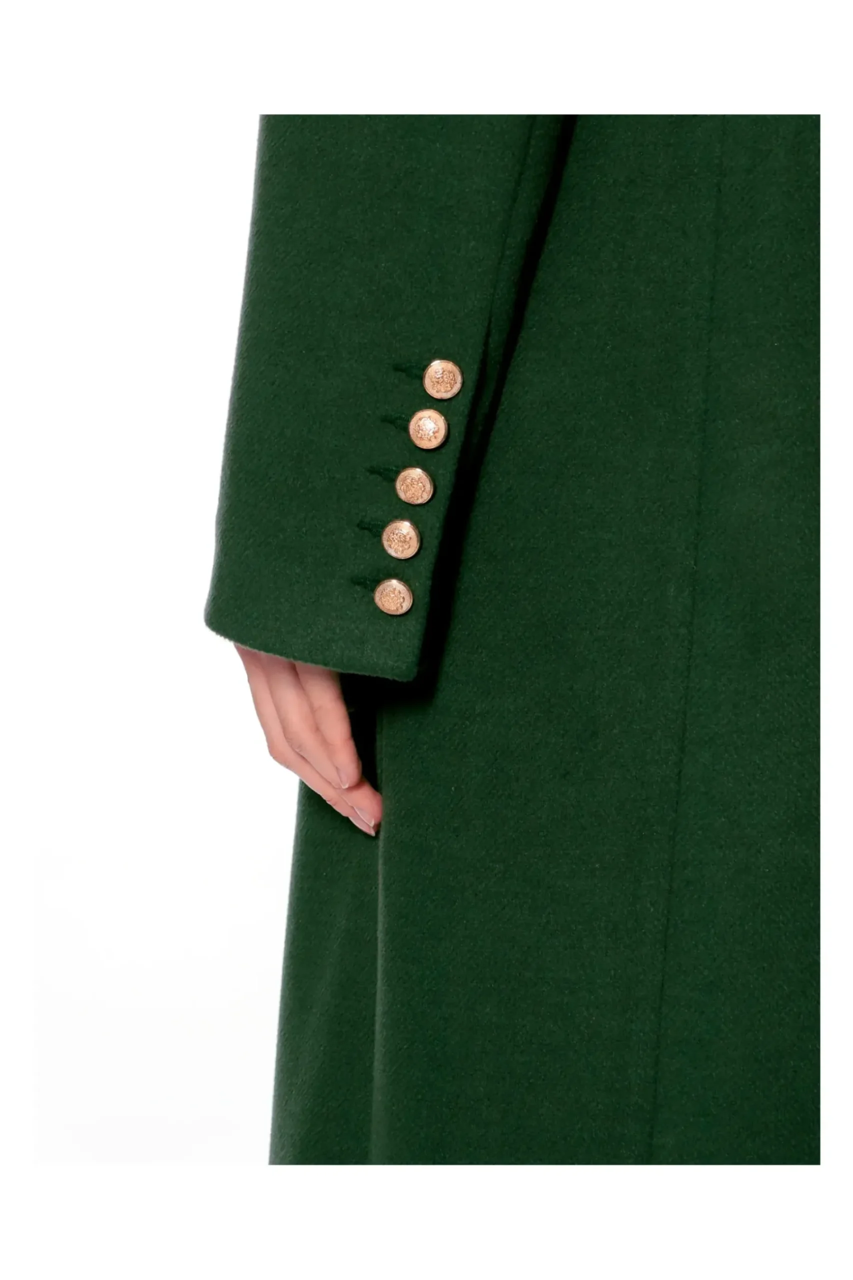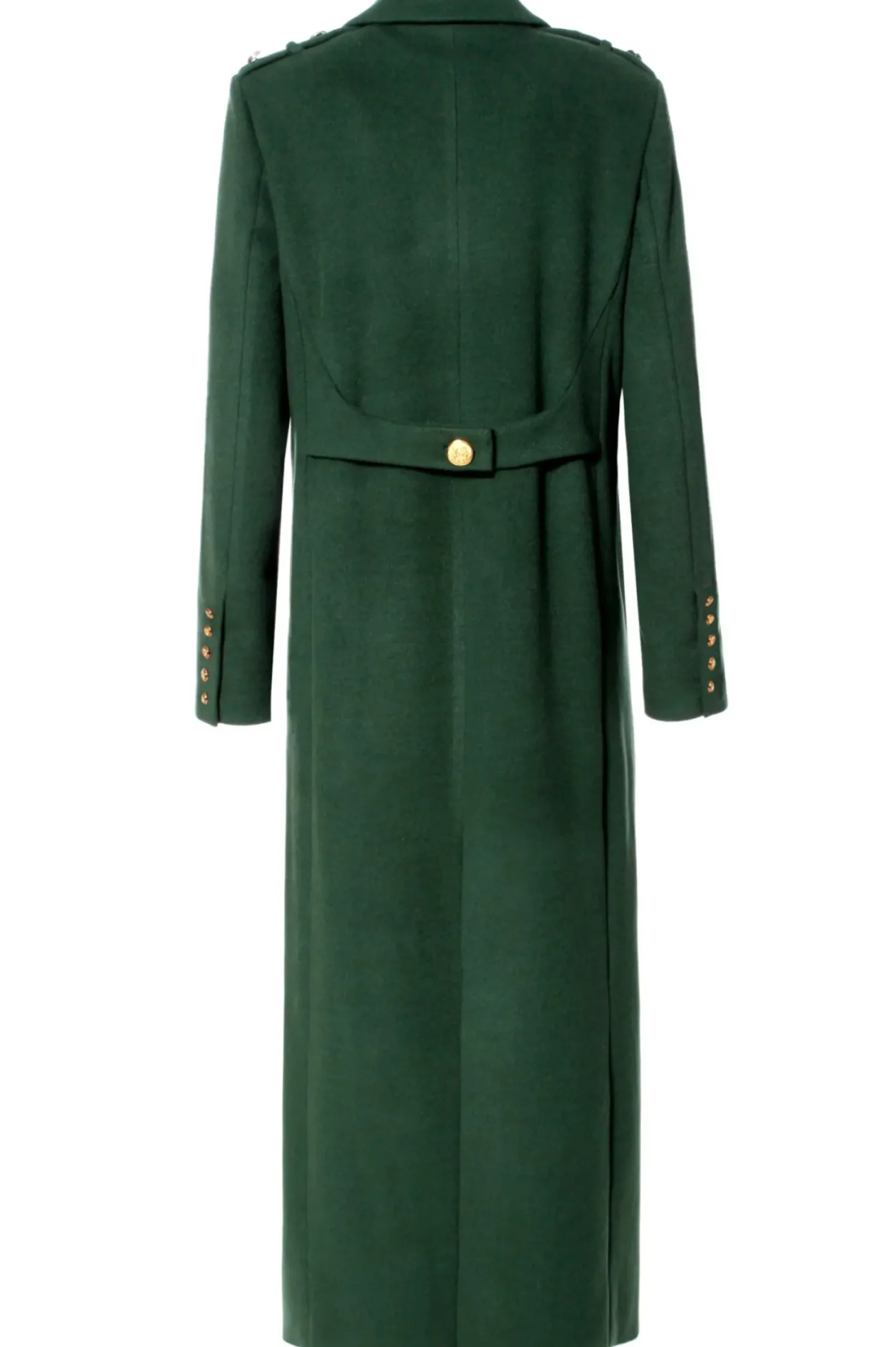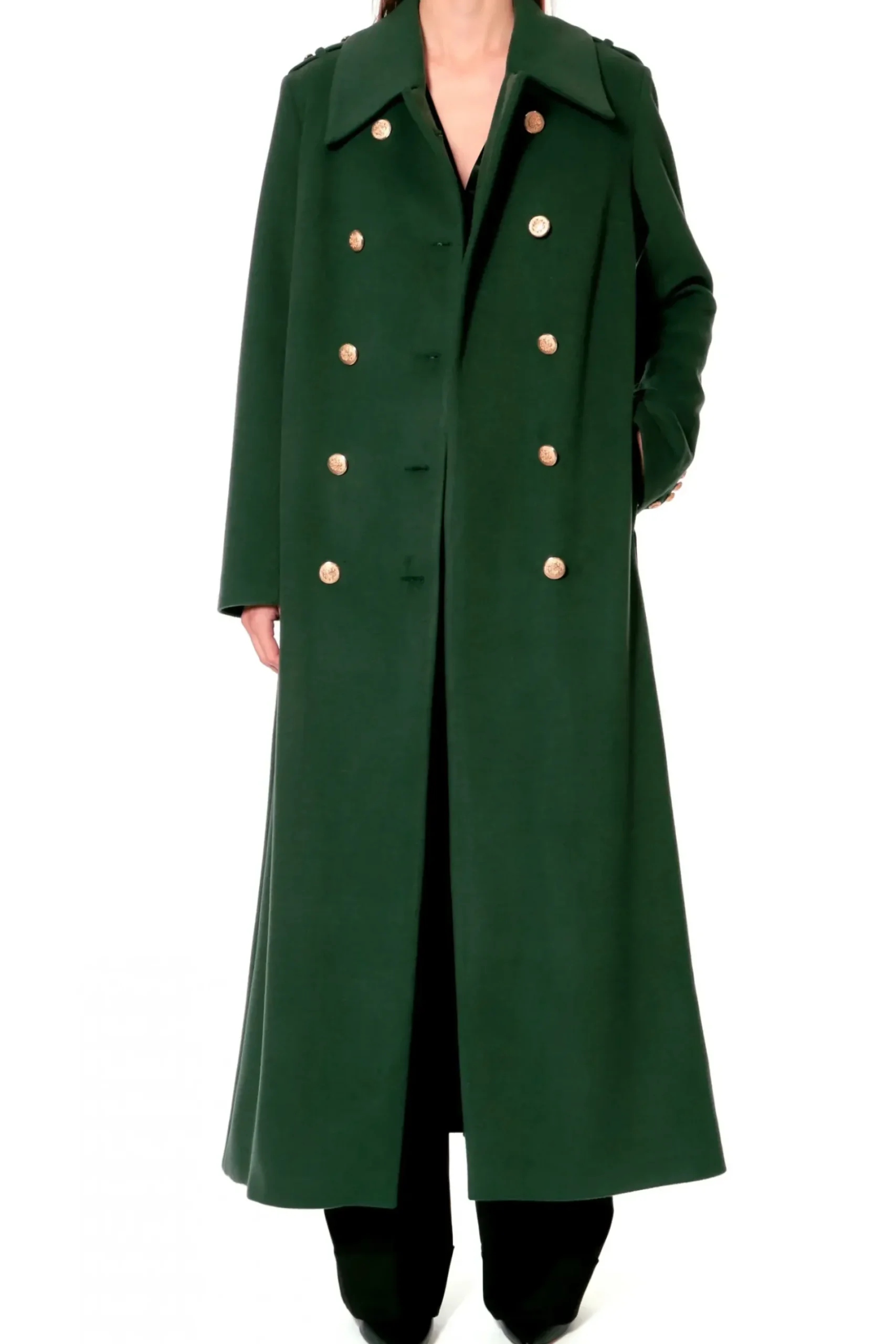Plaszcz Maxi W Stylu Militarnym, Wykonany Z Miesistego, Miekkiego Materialu. Dwurzedowy, Zapinany Na Dekoracyjne Zlote Guziki, Ktore Znajduja Sie Rowniez Na Pagonach I Prostych Mankietach. Kieszenie Ukryte W Bocznych Szwach Z Mala Padka. Szeroka Linia Ramion, Prosty Kroj Oraz Kolnierz Zapinany Pod Szyja Nadaja Calosci Maskulistyczny Wyglad. Calosc Podszyta Zakardowa Podszewka. Swietnie Skomponuje Sie Z Wysokimi Butami W Stylu Militarnym.