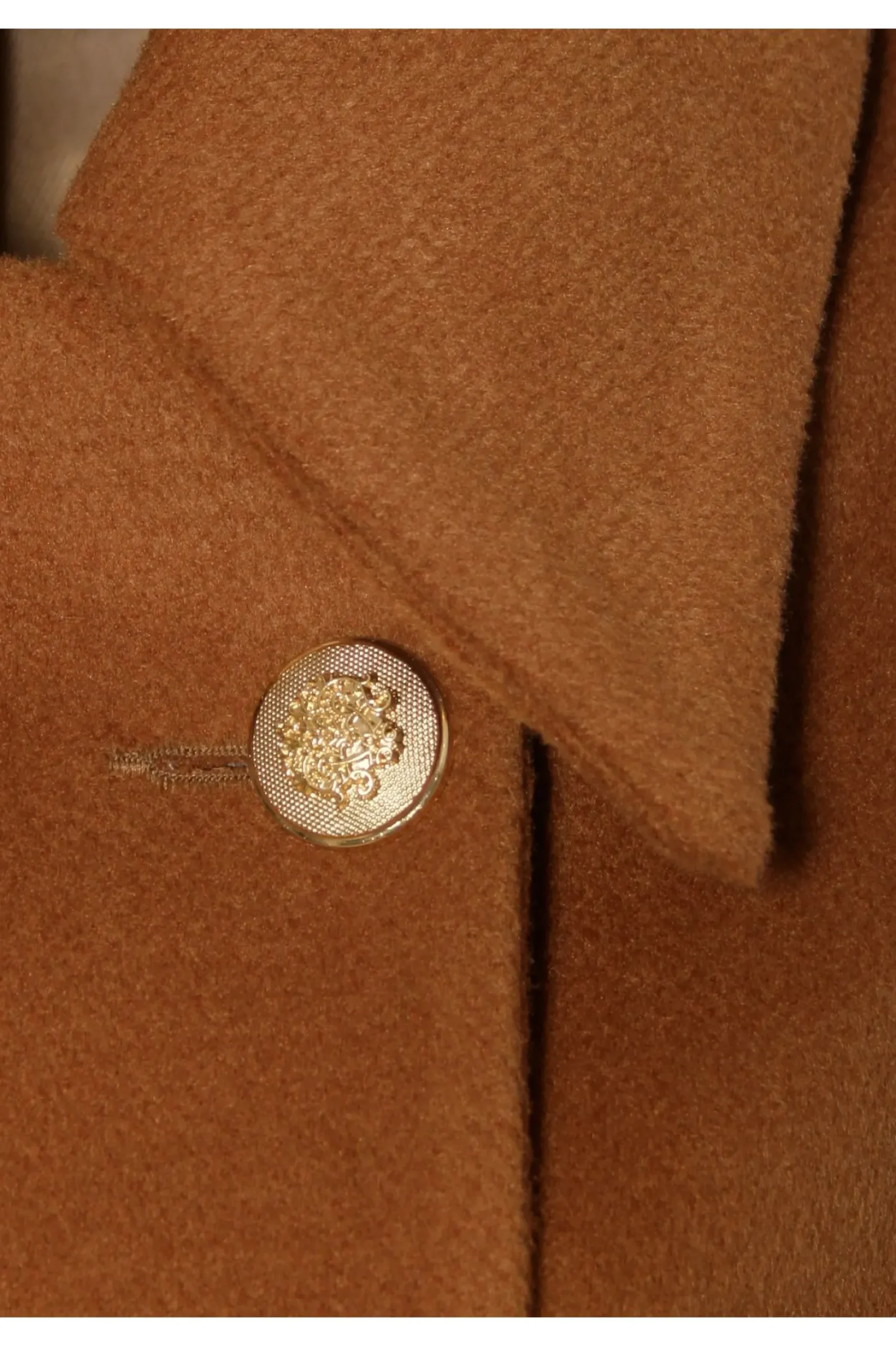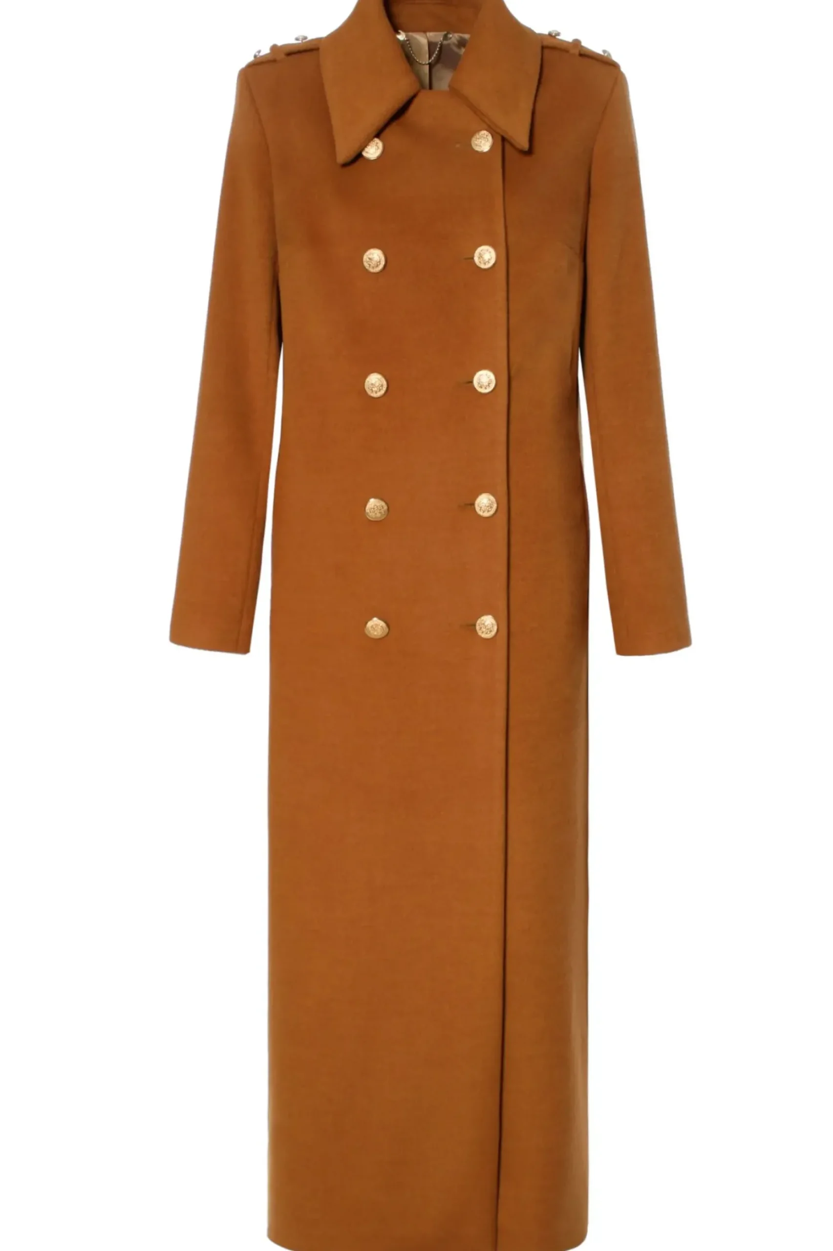 Plaszcz Maxi W Stylu Militarnym, Wykonany Z Miesistego, Miekkiego Materialu. Dwurzedowy, Zapinany Na Dekoracyjne Zlote Guziki, Ktore Znajduja Sie Rowniez Na Pagonach I Prostych Mankietach. Kieszenie Ukryte W Bocznych Szwach Z Mala Padka. Szeroka Linia Ramion, Prosty Kroj Oraz Kolnierz Zapinany Pod Szyja Nadaja Calosci Maskulistyczny Wyglad. Calosc Podszyta Zakardowa Podszewka. Swietnie Skomponuje Sie Z Wysokimi Butami W Stylu Militarnym.