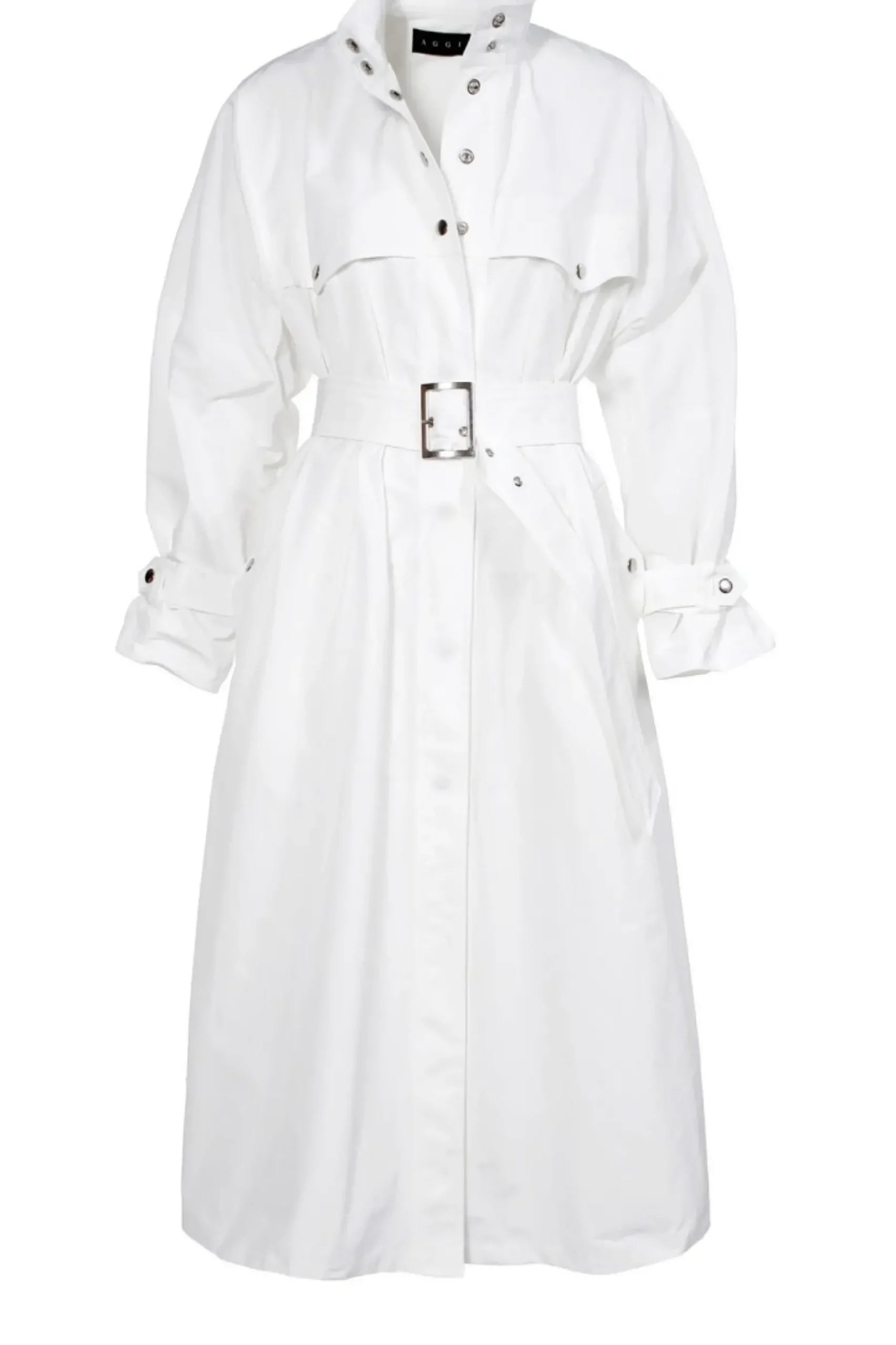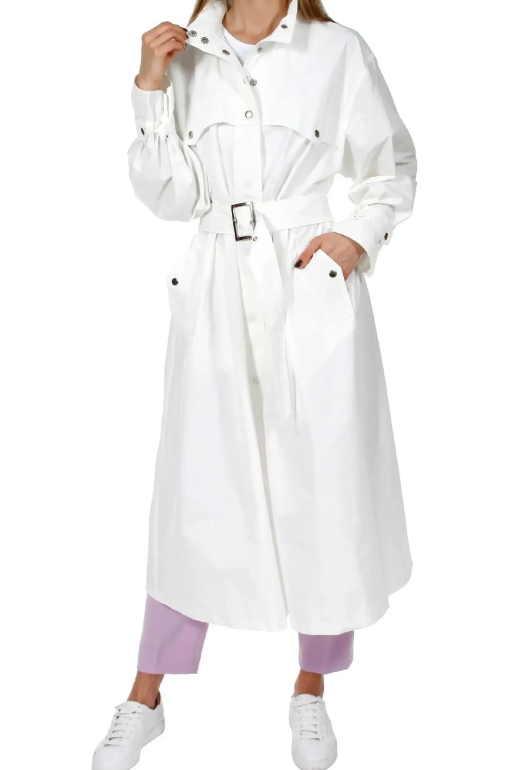 Trencz O Unikatowym Fasonie Na Stojce,Uszyty Z Wysokogatunkowej Mieszanki Bawelny I Nylonu. Tkanina Typu Memory Pozwala Podkreslic Przestrzenna Forme Plaszcza.Luzna Forma Rozszerzajaca Sie Ku Dolowi. Calosc Zapinana Na Zatrzaski W Srebrnym Kolorze.Na Plecach Gleboka Kontrafalda. Ozdobne Karczki Na Plecach I Na Przodzie Przypiete Zatrzaskami.Obfite Rekawy Wykonczone Szlufkami I Paseczkiem Umozliwiajacym Regulacje Szerokosci Rekawa Na Dole.Talia Podkreslona Paskiem Z Metalowa Klamra.Glebokie Kieszenie Wykonczone Patkami Zapinane Na Zatrzaski. Plaszcz Nie Posiada Podszewki. Wykonczony Zostal Z Duza Pieczolowitoscia Lamowkami.