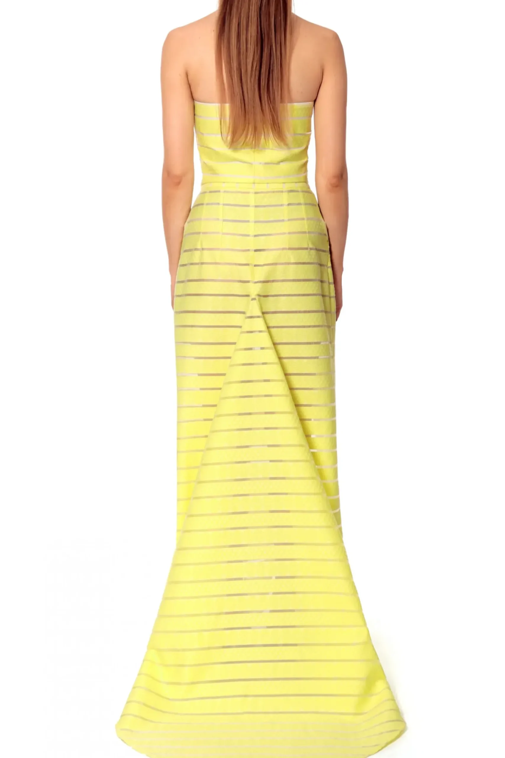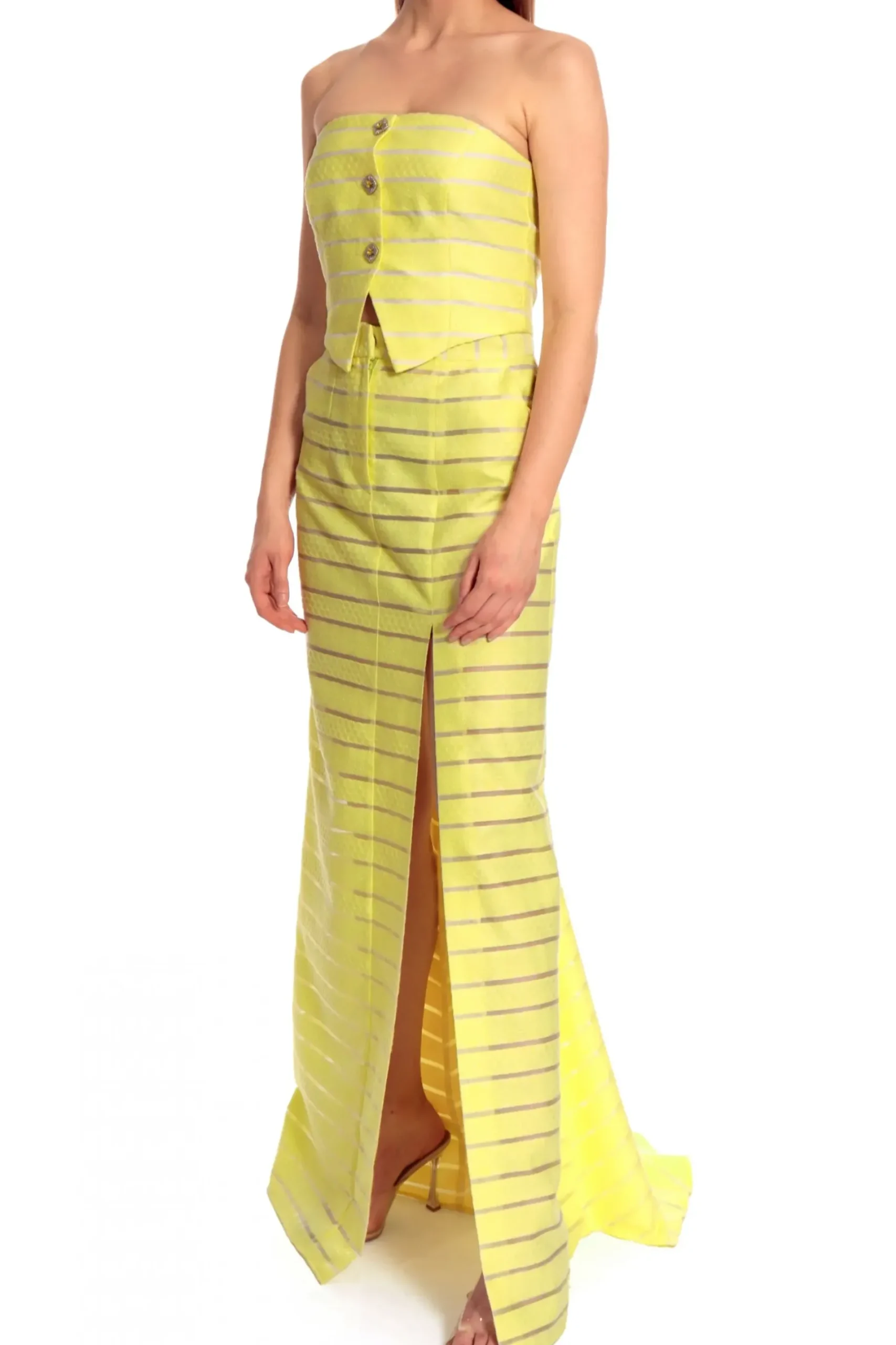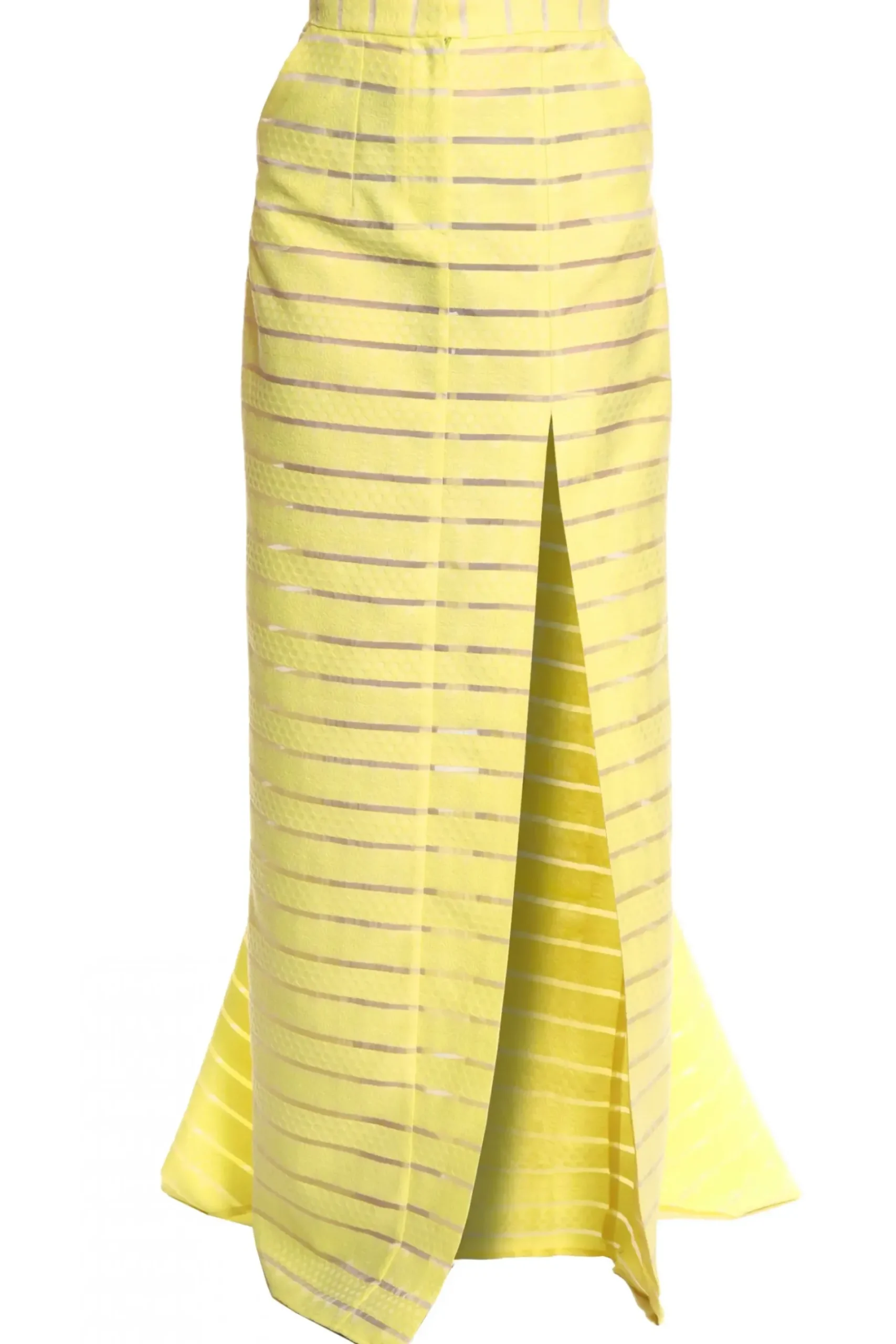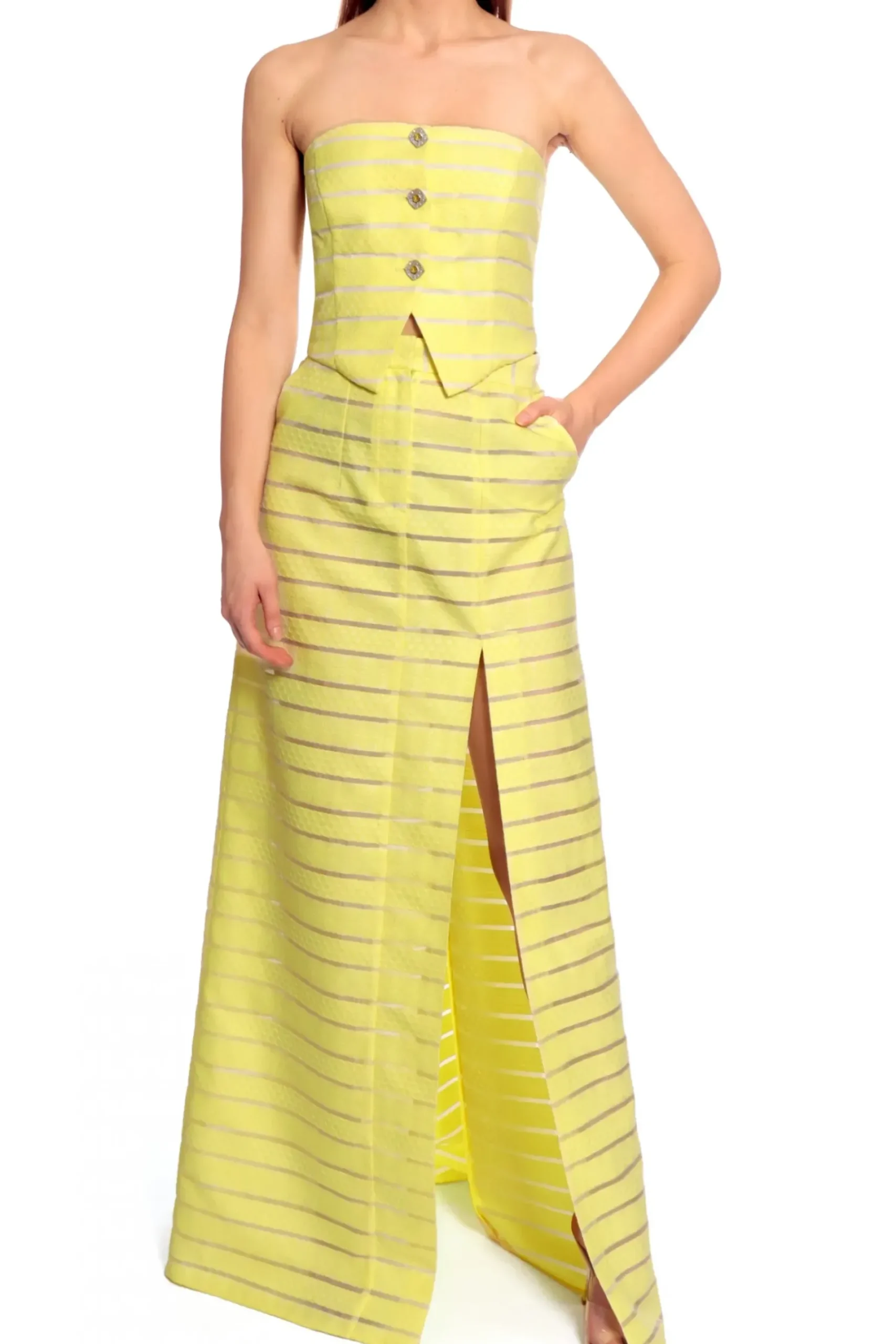 Spodnica Maxi Z Rozcieciem I Rozchodzacym Sie Z Tylu Trenem. Wykonana Z Materialu W Paski O Ciekawej Fakturze Przeplatany Przezroczystymi Sekcjami. Dopasowany Kroj Wokol Talii I Bioder Z Wygodnymi Kieszeniami. Nos Z Gorsetem Helena Light Lemon.