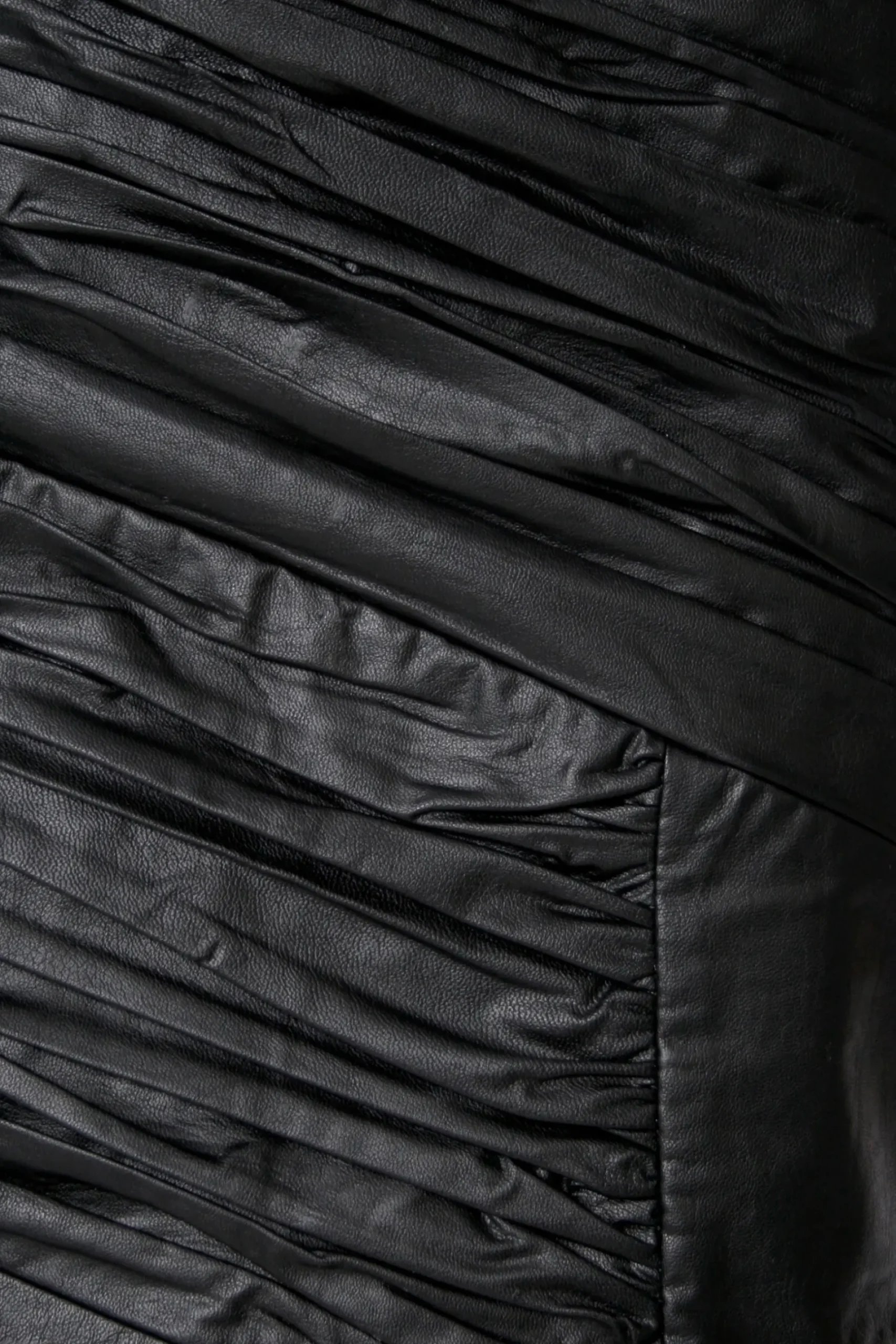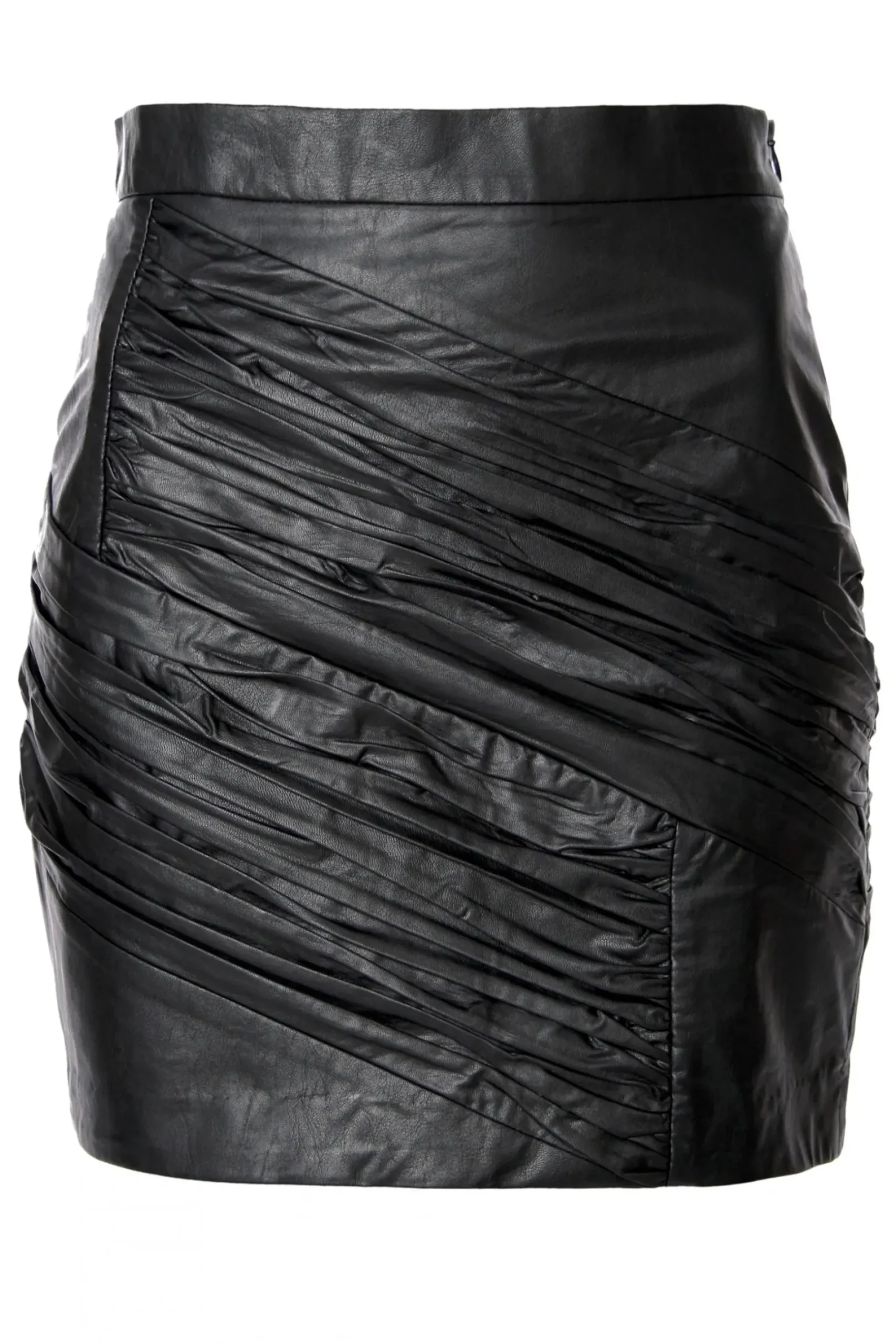 Krotka Dopasowana Spodnica Mini Wykonana Z Miekkiej Skory Weganskiej. Przekatne Marszczenia Nadaja Projektowi Ciekawa Strukture I Tworza Rockowy Charaktery Lat 80Tych.