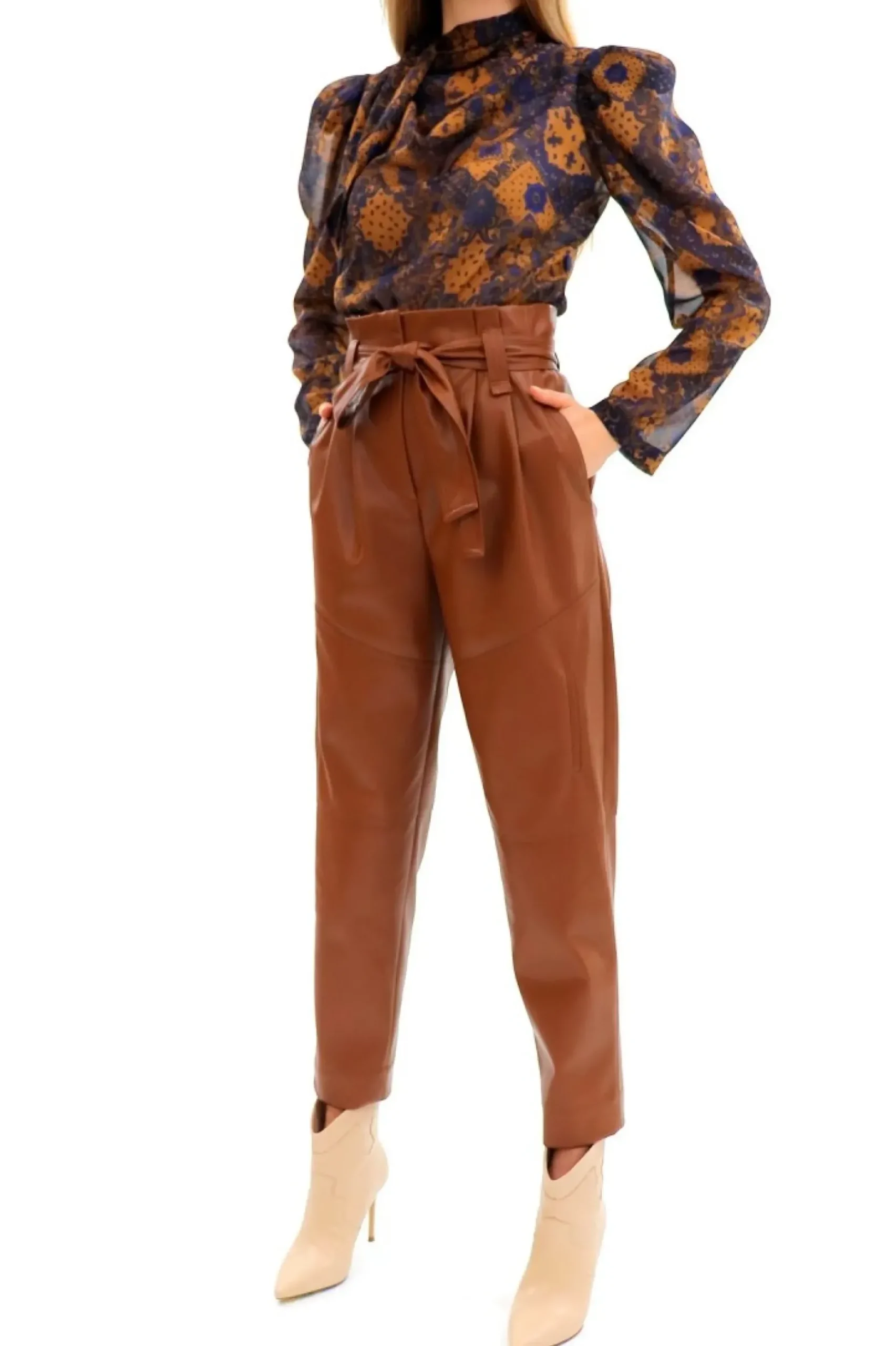 Spodnie Typu Paperbag Uszyte Z Miekkiej, Delikatnej W Dotyku, Wysokogatunkowej Skory Weganskiej. Drobiazgowo Dopracowane Detale W Postaci Ozdobnie Stebnowanych Szlufek. Dwa Wymienne Paski: Efektowny Z Oblekana Klamra Do Eleganckich Stylizacji Oraz Drugi Tradycyjnie Wiazany Na Supel/Kokarde Zmieniajacy Charakter Spodni Na Bardziej Codzienny. Wygodne Boczne Kieszenie Oraz Ciete Kieszonki Z Wypustka Na Posladkach Oraz Dodatkowo Z Przodu Na Nogawkach. Skosne Ciecia I Stebnowania W Linii Kolan. Wysoki Stan Z Zakladkami Na Przodzie I Modelujacymi Talie Zaszewkami Tylnimi. Luzna Linia Nogawek Z Mozliwoscia Wywiniecia W Celu Skrocenia Nogawek Badz Nadania Stylizacji Bardziej Nonszalanckiego Charakteru. Ten Bardzo Modowy Projekt Spodni Swietnie Komponuje Sie Ze Szpilkami, Krotkimi Botkami Lub Wpuszczony Do Wysokich Kozakow.
