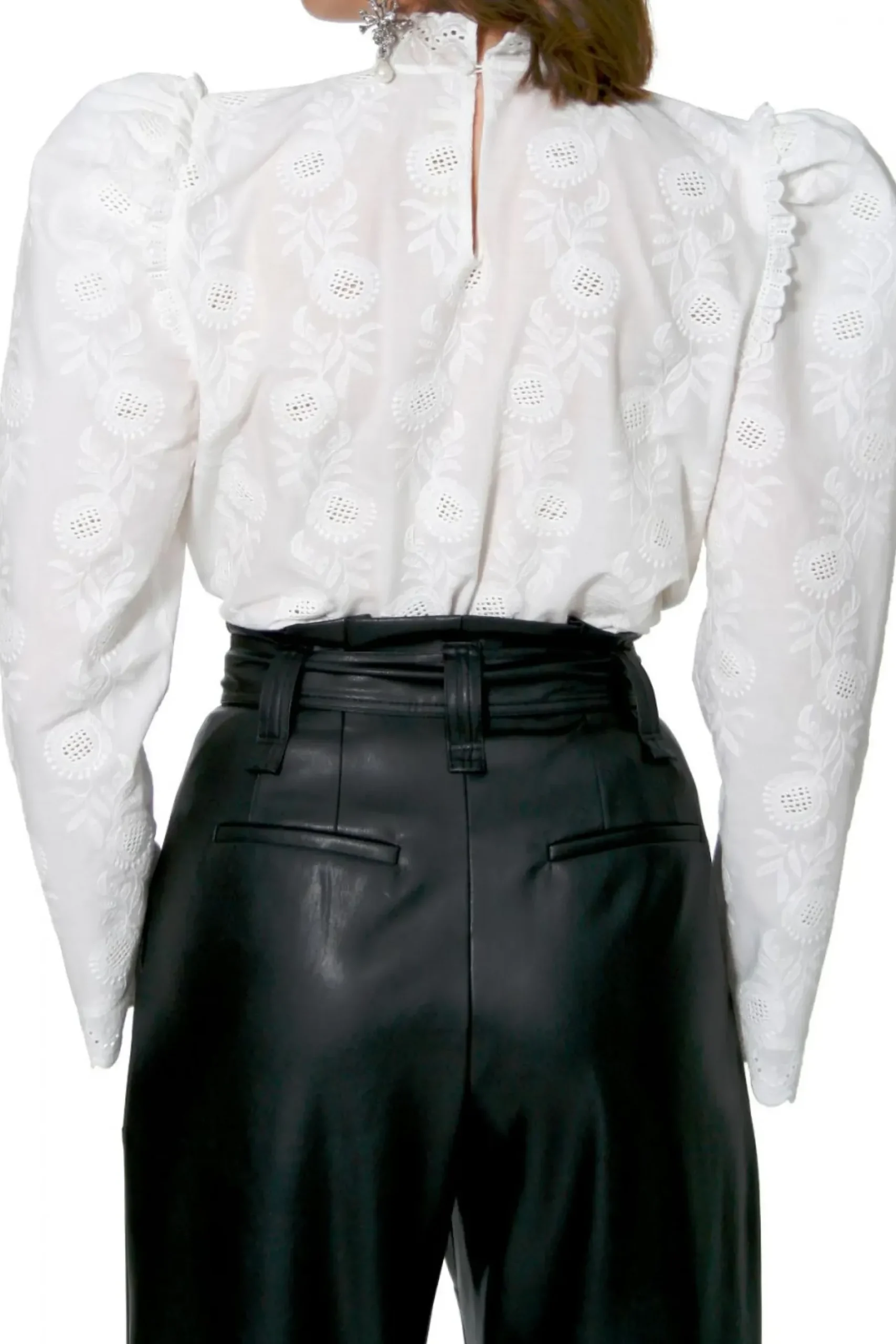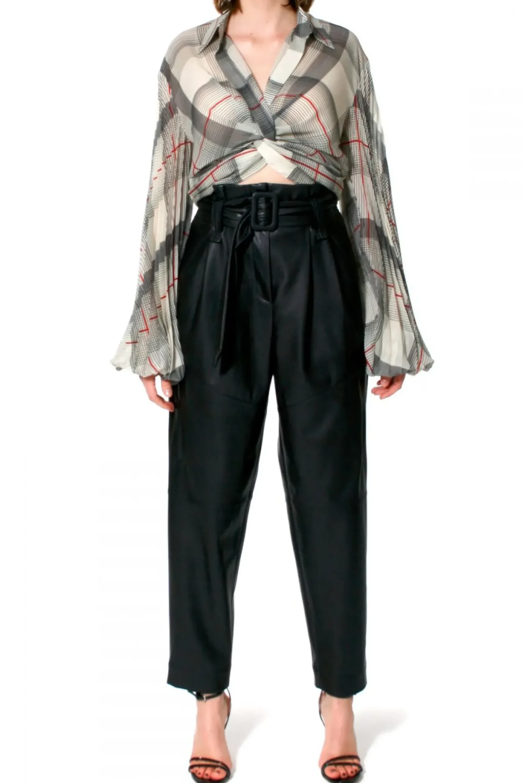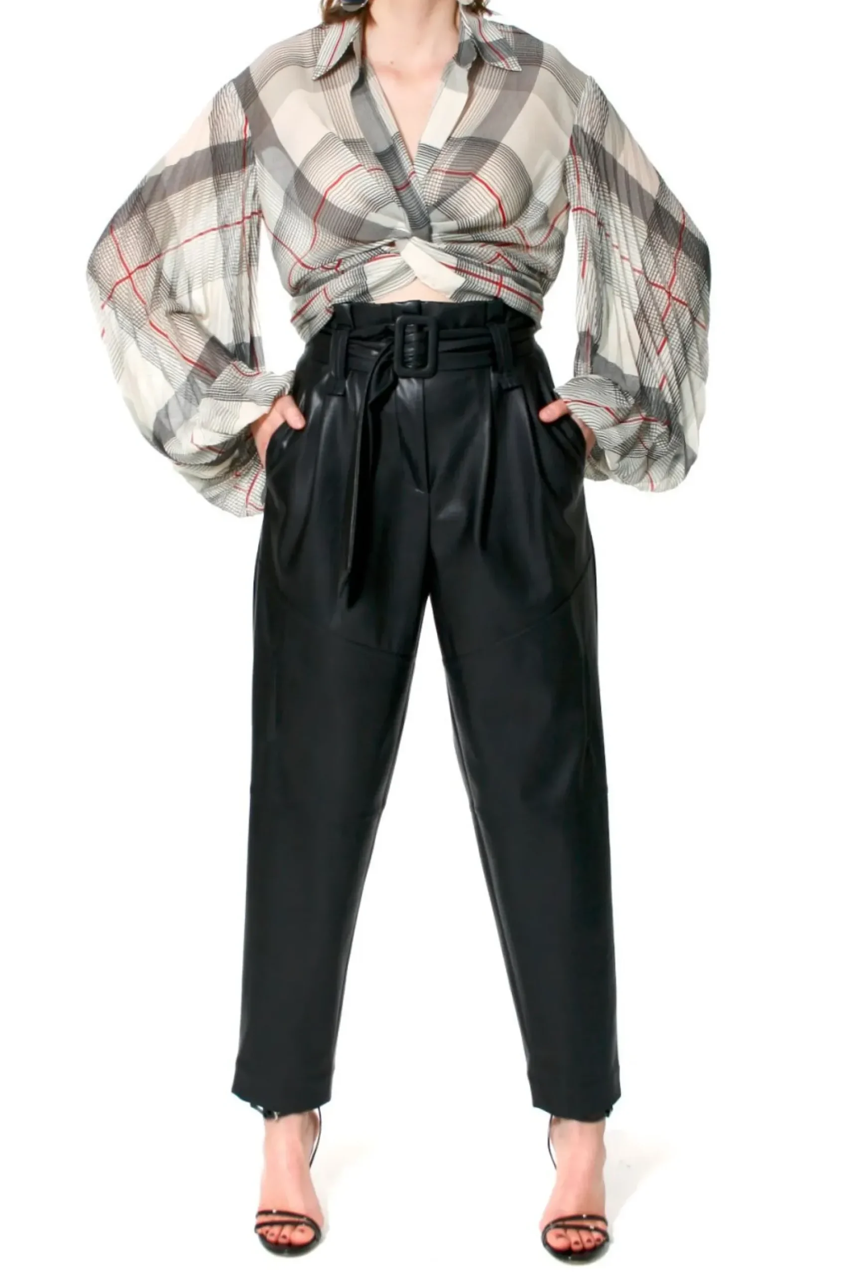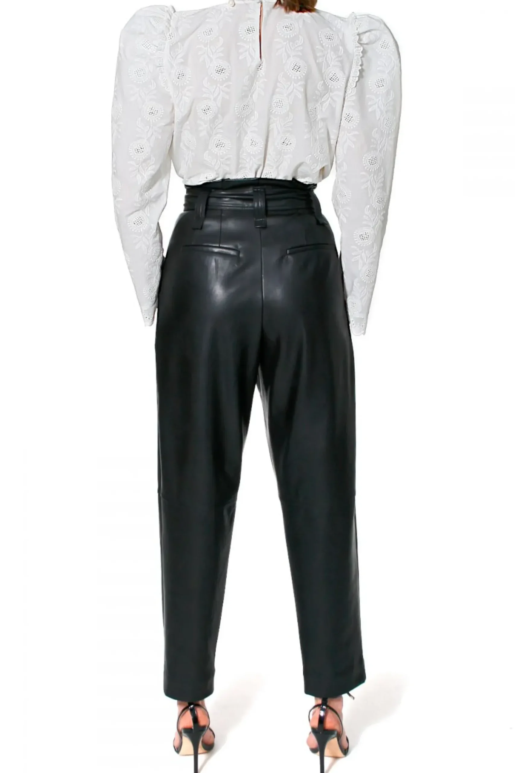 Spodnie Typu Paperbag Uszyte Z Miekkiej, Delikatnej W Dotyku, Wysokogatunkowej Skory Weganskiej. Drobiazgowo Dopracowane Detale W Postaci Ozdobnie Stebnowanych Szlufek. Dwa Wymienne Paski: Efektowny Z Oblekana Klamra Do Eleganckich Stylizacji Oraz Drugi Tradycyjnie Wiazany Na Supel/Kokarde Zmieniajacy Charakter Spodni Na Bardziej Codzienny. Wygodne Boczne Kieszenie Oraz Ciete Kieszonki Z Wypustka Na Posladkach Oraz Dodatkowo Z Przodu Na Nogawkach. Skosne Ciecia I Stebnowania W Linii Kolan. Wysoki Stan Z Zakladkami Na Przodzie I Modelujacymi Talie Zaszewkami Tylnimi. Luzna Linia Nogawek Z Mozliwoscia Wywiniecia W Celu Skrocenia Nogawek Badz Nadania Stylizacji Bardziej Nonszalanckiego Charakteru. Ten Bardzo Modowy Projekt Spodni Swietnie Komponuje Sie Ze Szpilkami, Krotkimi Botkami Lub Wpuszczony Do Wysokich Kozakow.