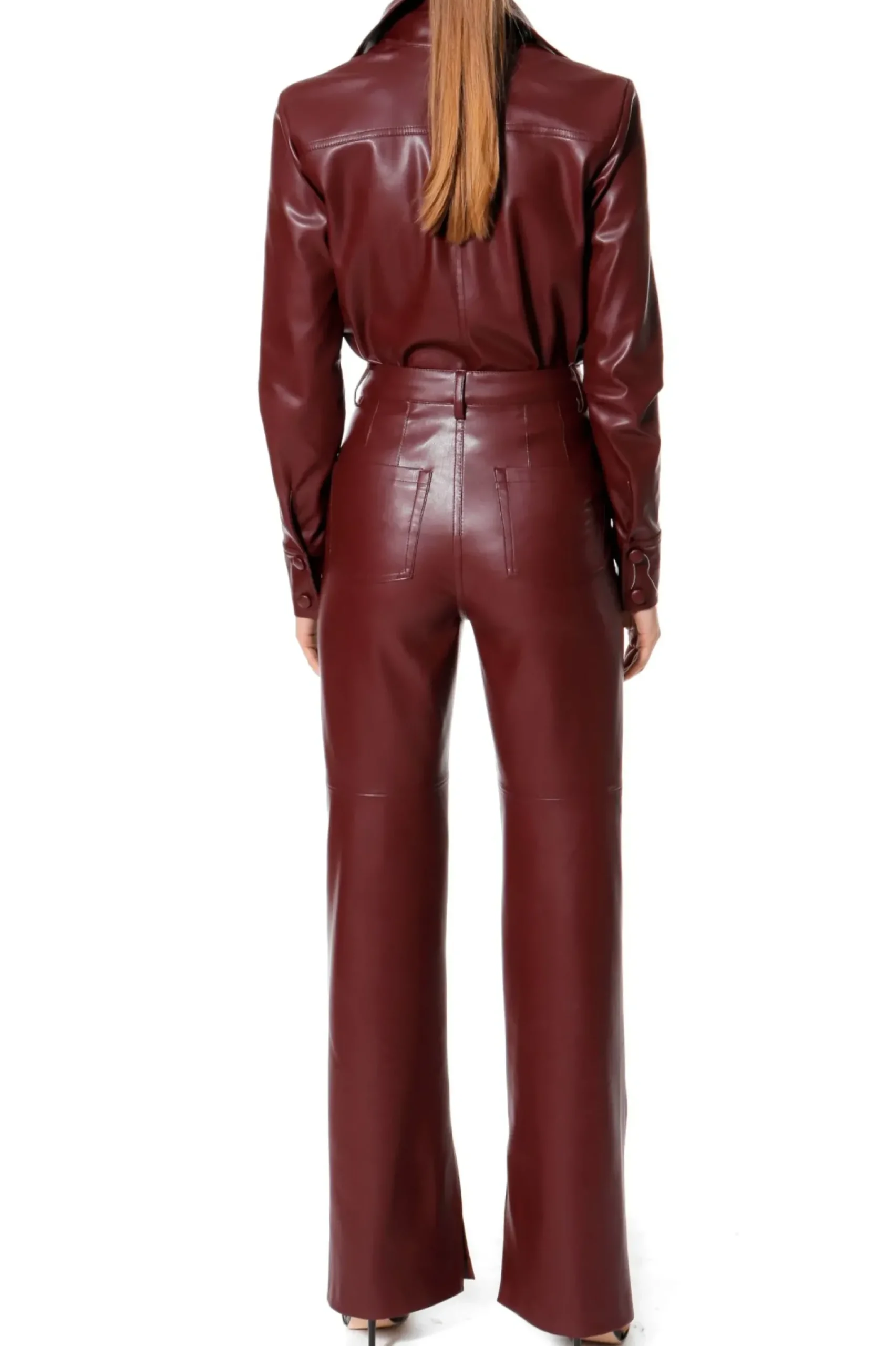 Spodnie Wykonane Z Miekkiej, Delikatnej W Dotyku, Wysokogatunkowej Skory Weganskiej. Wysoka Talia Oraz Pieczolowicie Wymodelowane Biodra W Tym Minimalistycznie Zaprojektowanym Modelu Idealnie Podkreslaja Linie Kobiecej Sylwetki. Proste, Dlugie Nogawki Z Peknieciami Od Wewnetrznej Strony Swietnie Ukladaja Sie Na Bucie Tworzac Efekt Wysmuklonych I Wydluzonych Nog. Precyzyjnie Dopieszczone Detale, Nakladane Kieszenie I Szlufki Z Ozdobnymi Stebnowaniami.