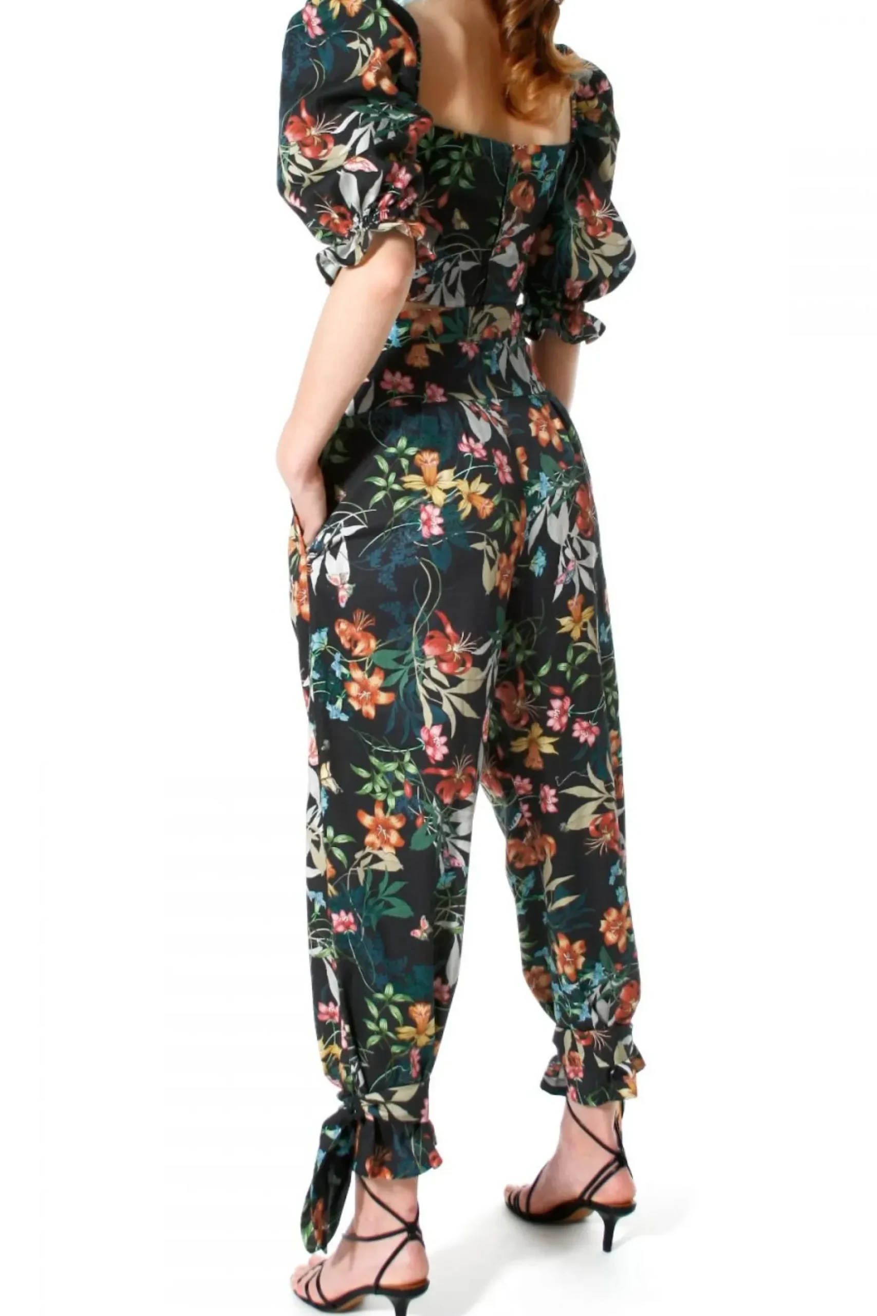 Spodnie Z Wysoka Talia I Karczkiem Uszyte Ze 100% Bawelny O Subtelnym Satynowym Wykonczeniu W Przyciagajacy Wzrok Wielobarwny Desen Kwiatowo-Florystyczny.