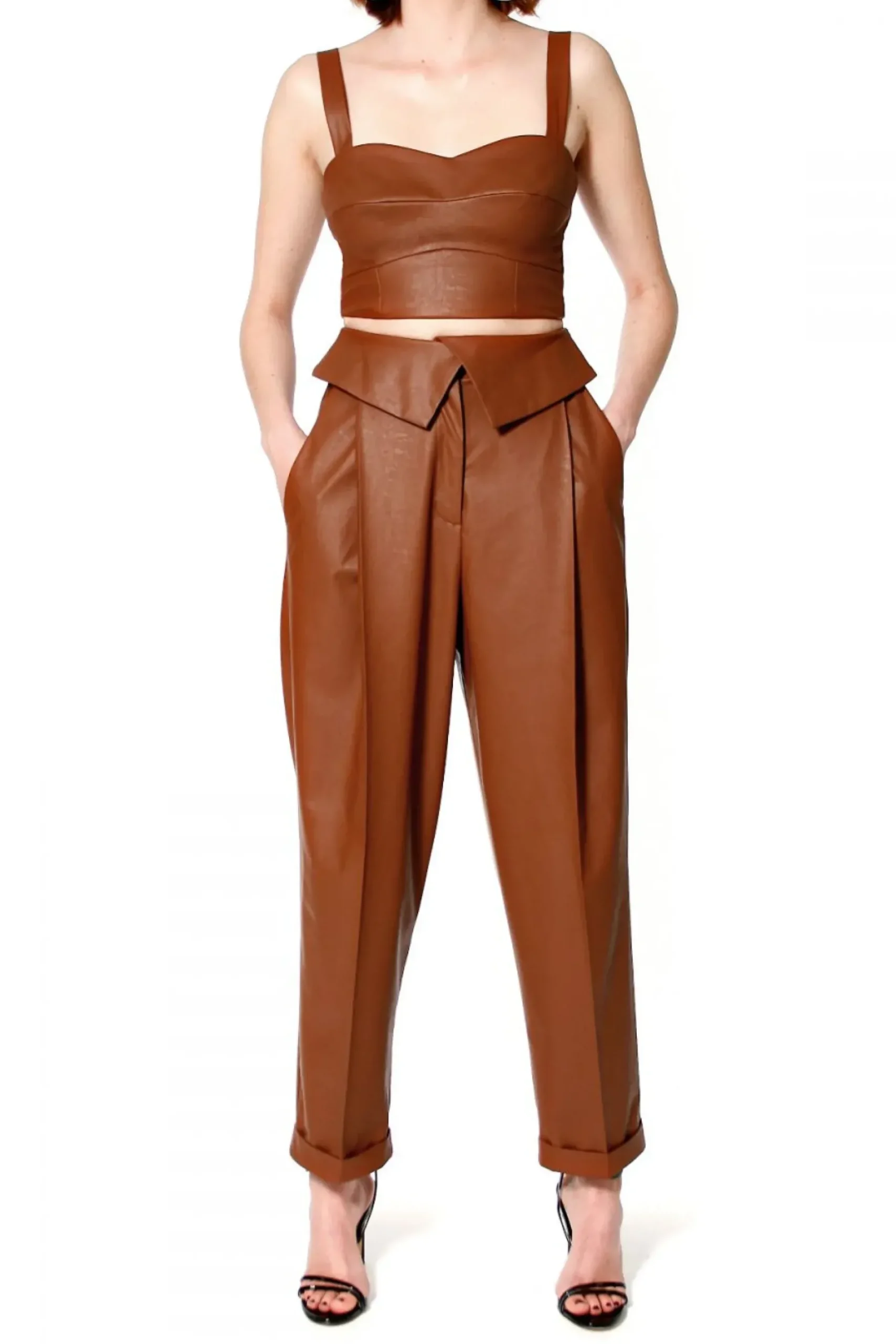 Spodnie Typu Baggy Wykonane Z Nieco Cienszej, Wysokogatunkowej Skory Weganskiej W Szlachetnym Odcieniu Umbry. Cienka, Delikatna Skora Weganska Zastosowana W Tym Projekcie Od Spodu Jest Pokryta Wykonczeniem Bawelnianym, Bardzo Przyjaznym Dla Skory I Tym Samym Jest To Idealna Propozycja Dla Milosniczek Skory Na Sezon Wiosenno-Letni. Wysoka Talia Pieknie Modelujaca Sylwetke Z Doszyta Wywijana Baskinka. Glebokie Zakladki Dodaja Objetosci W Gornej Czesci Nogawek Aby Potem Zwezic Sie Ku Dolowi I Wysmuklic Sylwetke. Spodnie Posiadaja Kieszenie Boczne Oraz Dwie Wykonczone Listewkami Z Tylu. W Pasie Zapinane Na Metalowe Zatrzaski.
