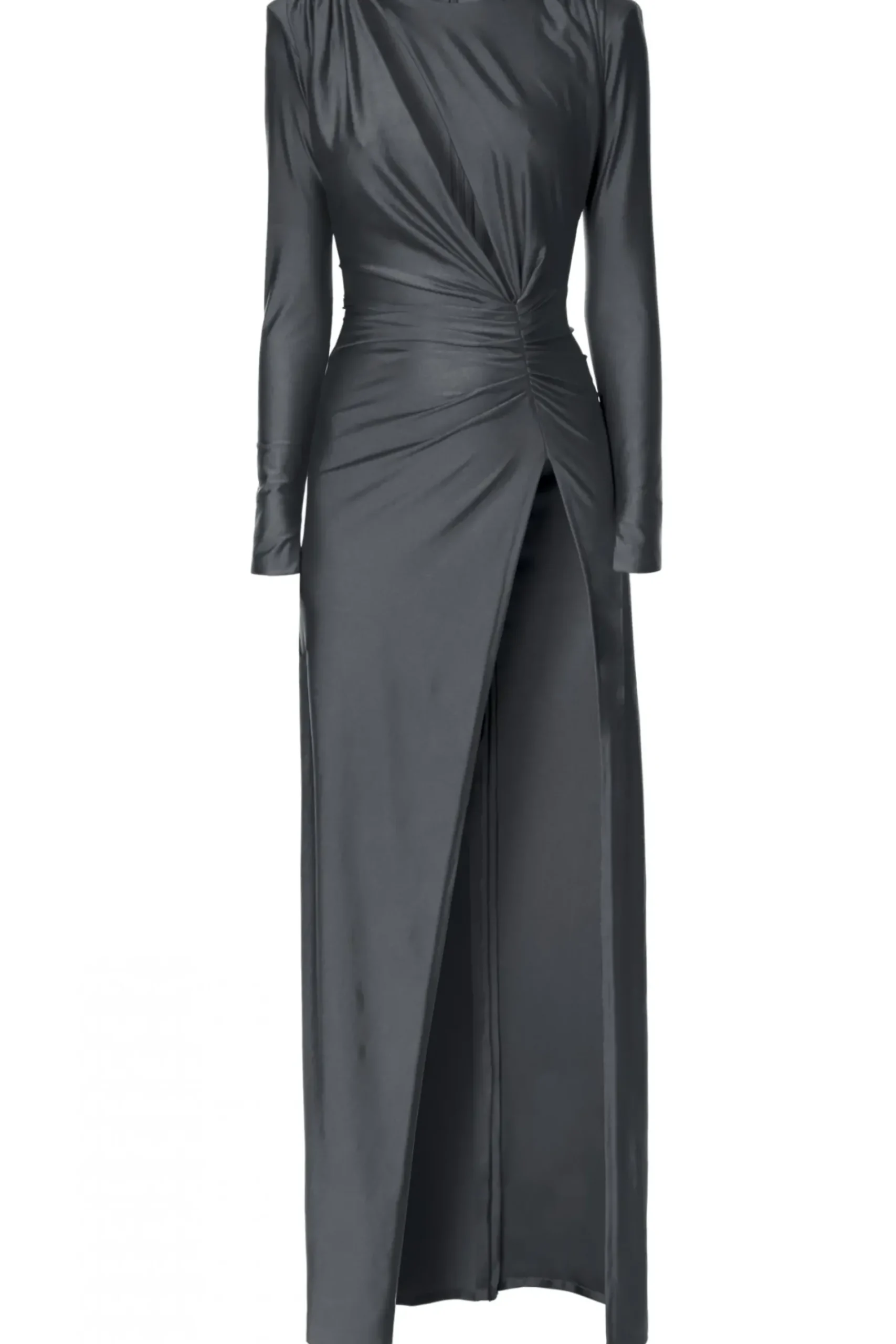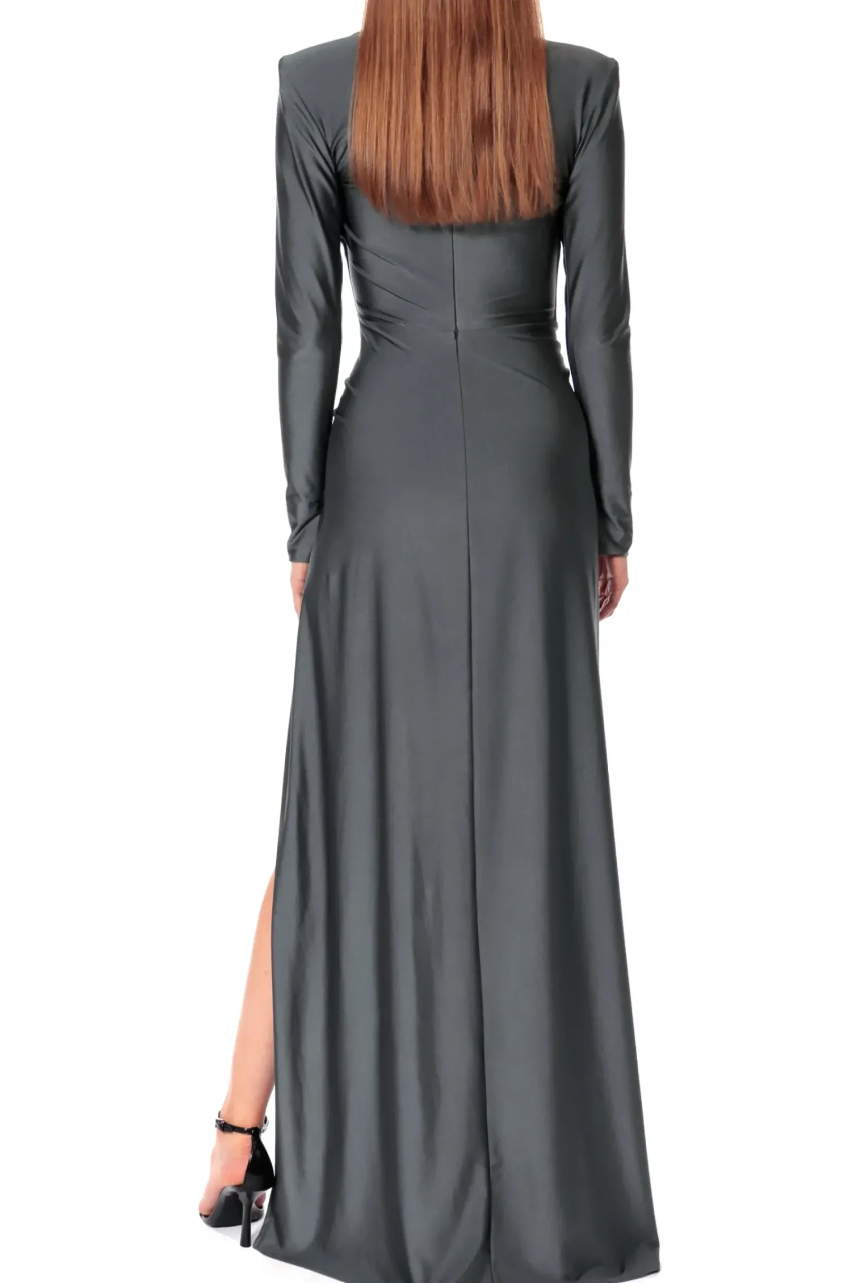 Suknia Maxi Uszyta Z Elastycznego, Miekko Podkreslajacego Sylwetke Materialu O Subtelnym Polysku. Zabudowana Linia Dekoltu, Dlugie Smukle Rekawy, Dlugosc Maxi Artystycznie Wydobywa Sensualnosc Kobiecej Sylwetki Zdecydowanym, Ukosnym Rozcieciem Miedzy Piersiami Oraz Ekscytujaco Eksponujacym Noge. Drapowania Zalamuja Swiatlo Podkreslajac Kunszt Precyzyjnej Pracy Wykonanej W Naszej Pracowni. Ramiona Zaakcentowane Poduszkami. Zapinana Na Kryty Zamek Blyskawiczny.