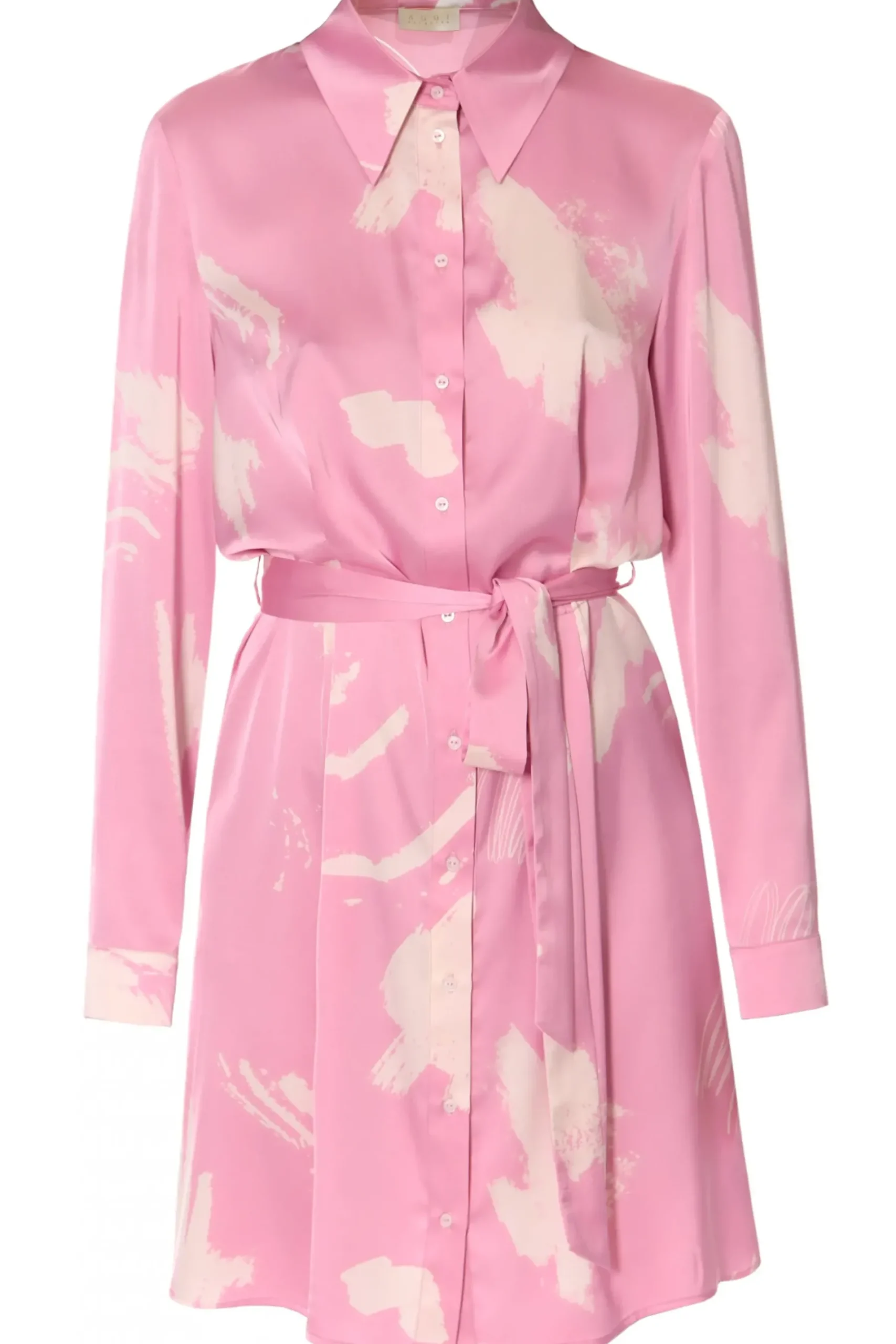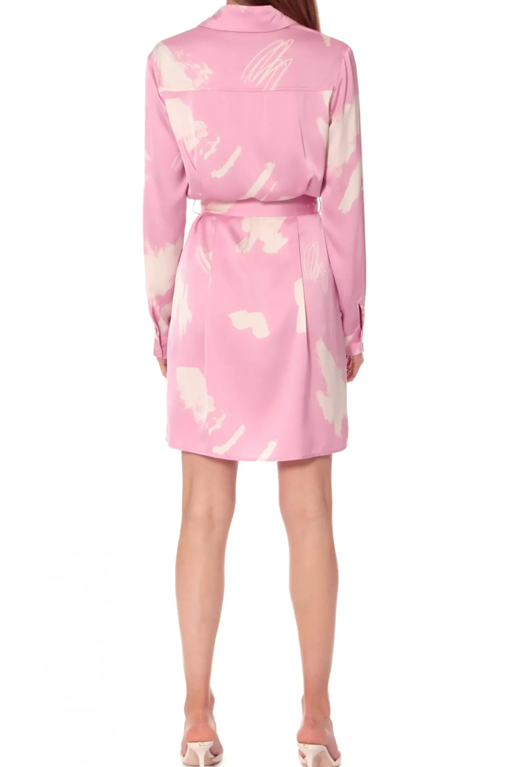 Koszulowa Sukienka Mini Z Dlugim Rekawem. Wykonana Z Delikatnego Materialu W Nieregularny Rozowo-Bialy Print. Z Klasycznym Kolnierzem Oraz Mankietami. Wiazana Paskiem. Idealna Sukienka Na Lato, Sprawdzi Sie Do Kazdej Stylizacji.