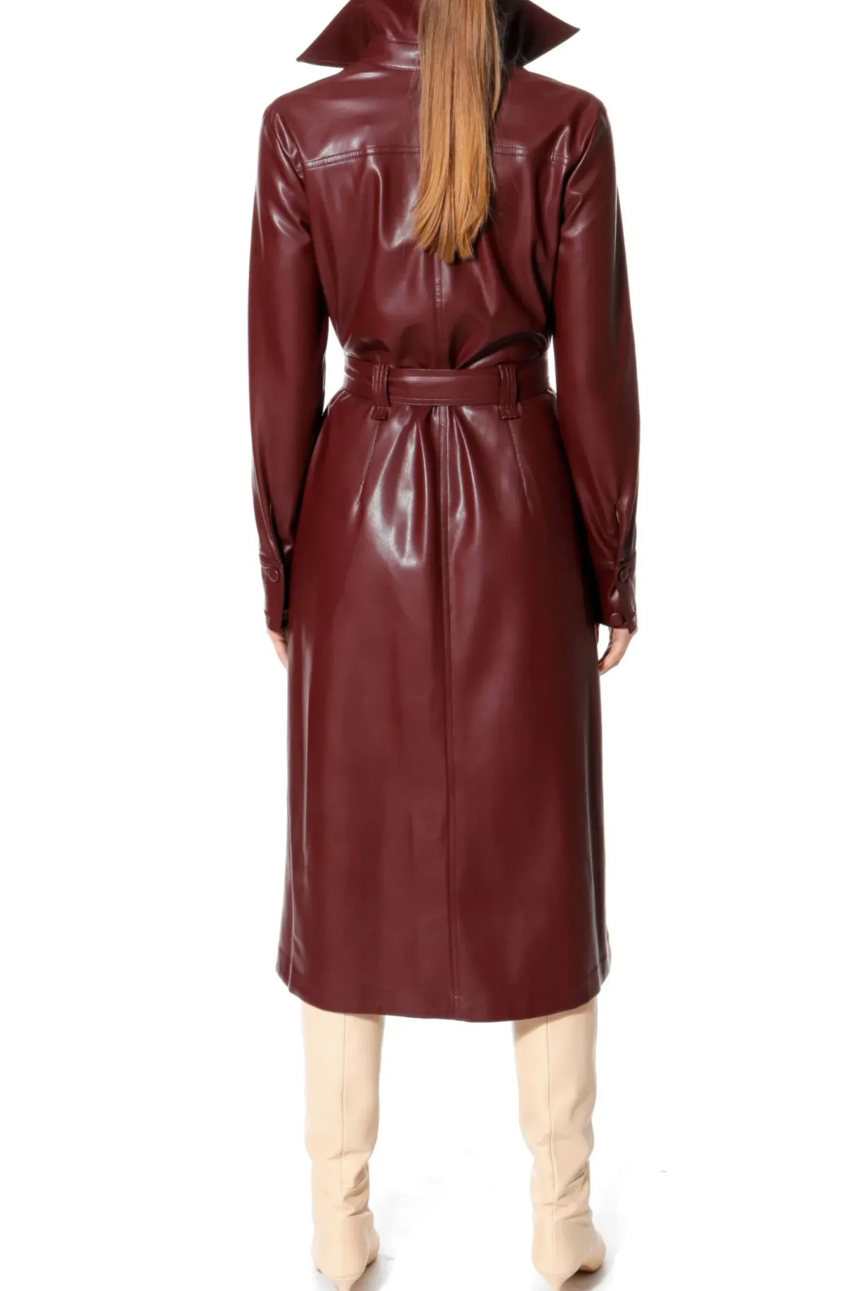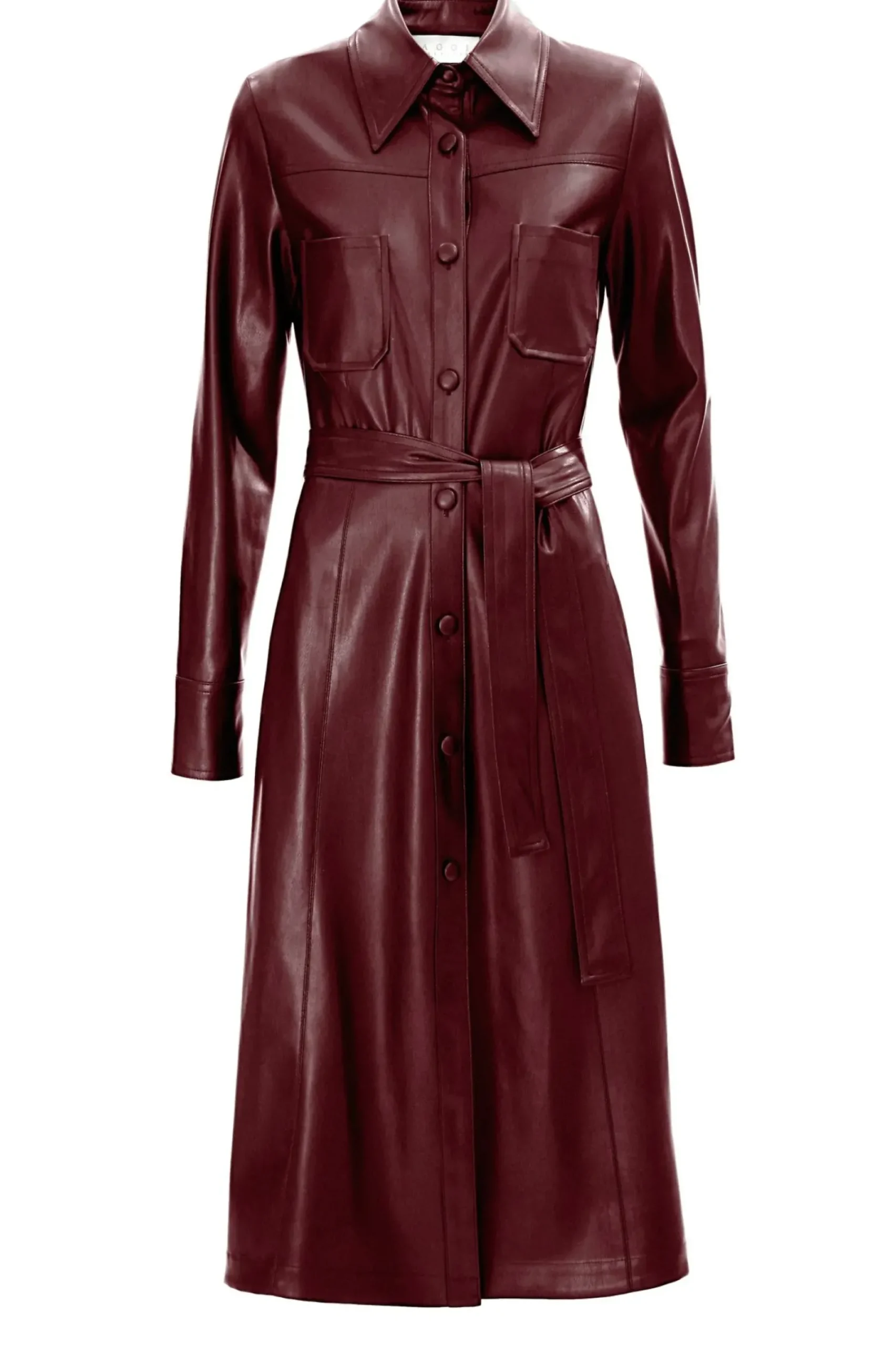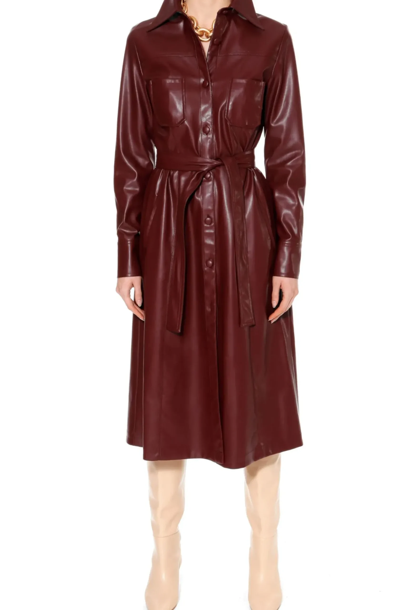 Szmizjerka O Dlugosci Midi Wykonana Z Miekkiej, Delikatnej W Dotyku, Wysokogatunkowej Skory Weganskiej. Projekt Utrzymany W Klimacie Lat 70-Tych. Szpiczasty Kolnierzyk Na Stojce, Dlugie Rekawy Zakonczone Waskimi Mankietami Zapinanymi Na Oblekane Guziki. Trapezowy Dol Sukienki Skonstruowany Z Szesciu Klinow. Drobiazgowo Dopracowane Detale, Male, Nakladane Kieszonki Na Przodzie Sukienki, Ozdobne Stebnowania, Guziki Oblekane Skora Weganska. Z Przodu Ciete Kieszenie Wykonczone Wypustka. Talia Podkreslona Wiazanym Paskiem.