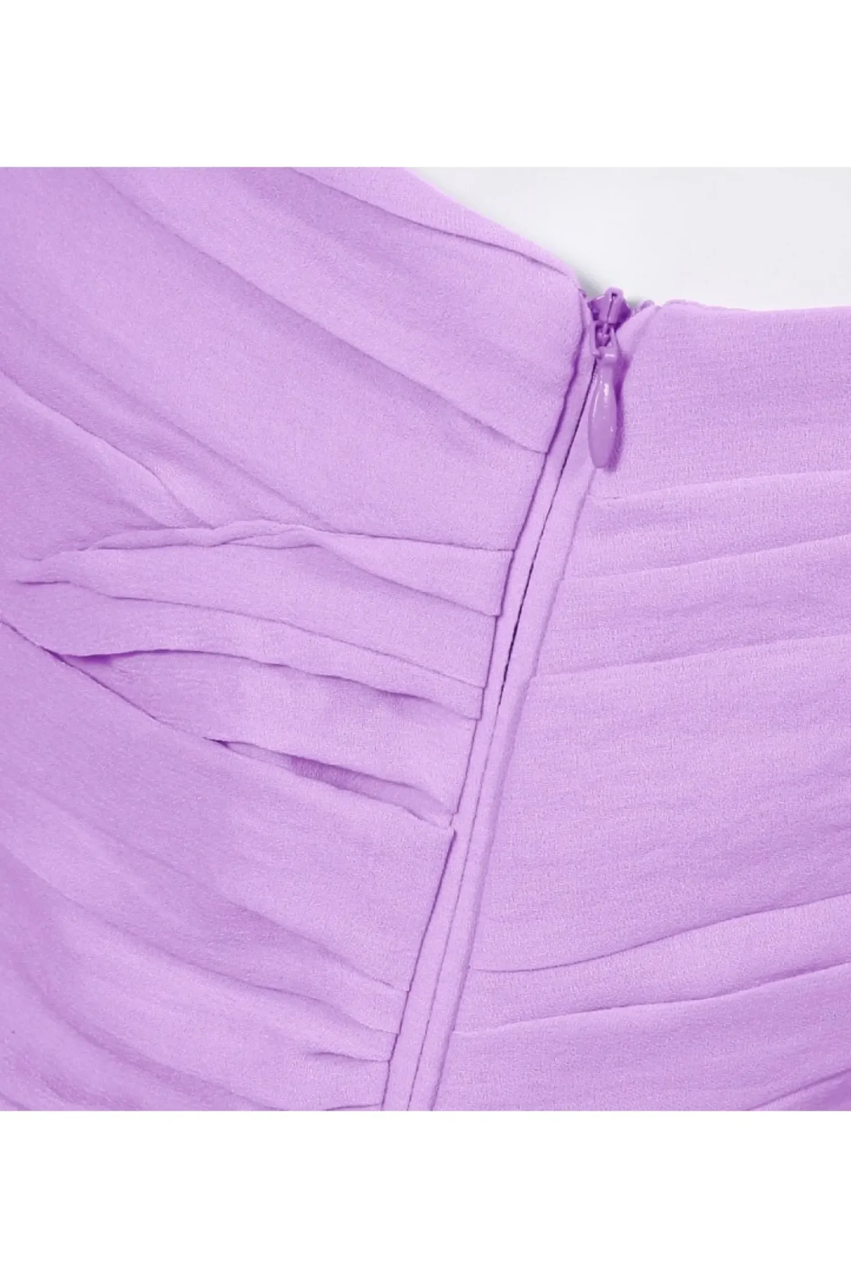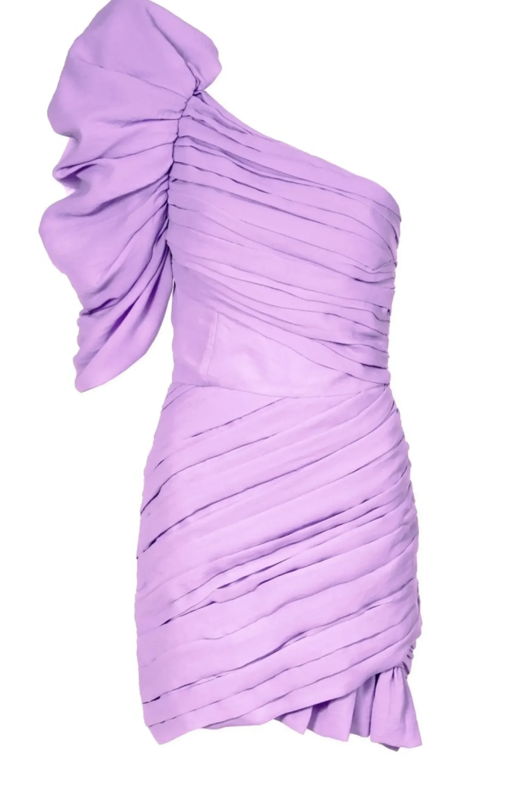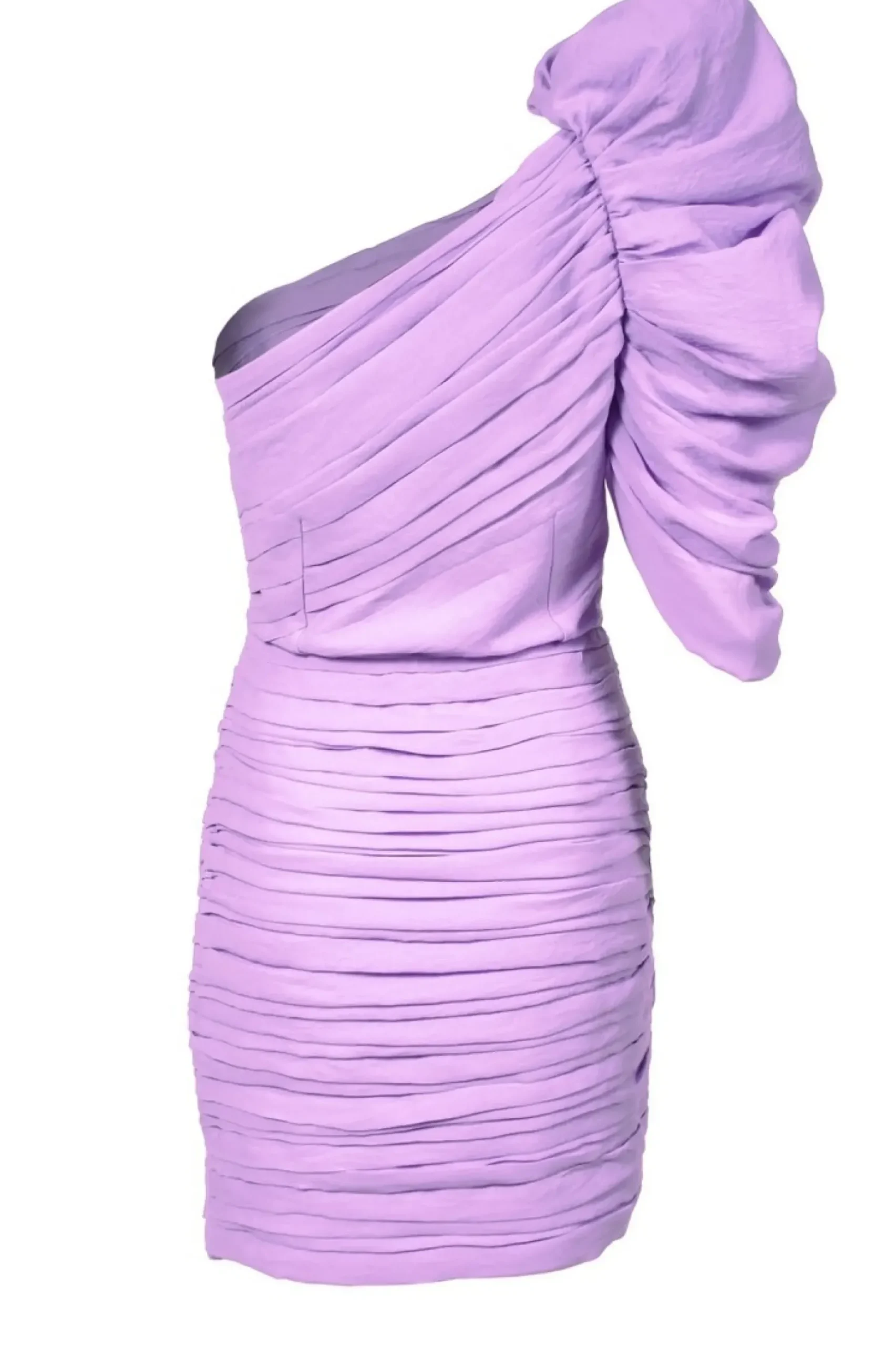 Wyjatkowa, Oszalamiajaca Kreacja. Asymetryczna Sukienka W Lawendowym Kolorze. Futurystyczny, Mocno Zaakcentowany Rekaw Z Bufka Oraz Zalotna Falbanka Na Lewym Udzie Stanowia O Odwaznej Linii Projektu. Kazdy Egzemplarz Jest Recznie, Pojedynczo Drapowany W Pracowni W Krakowie.