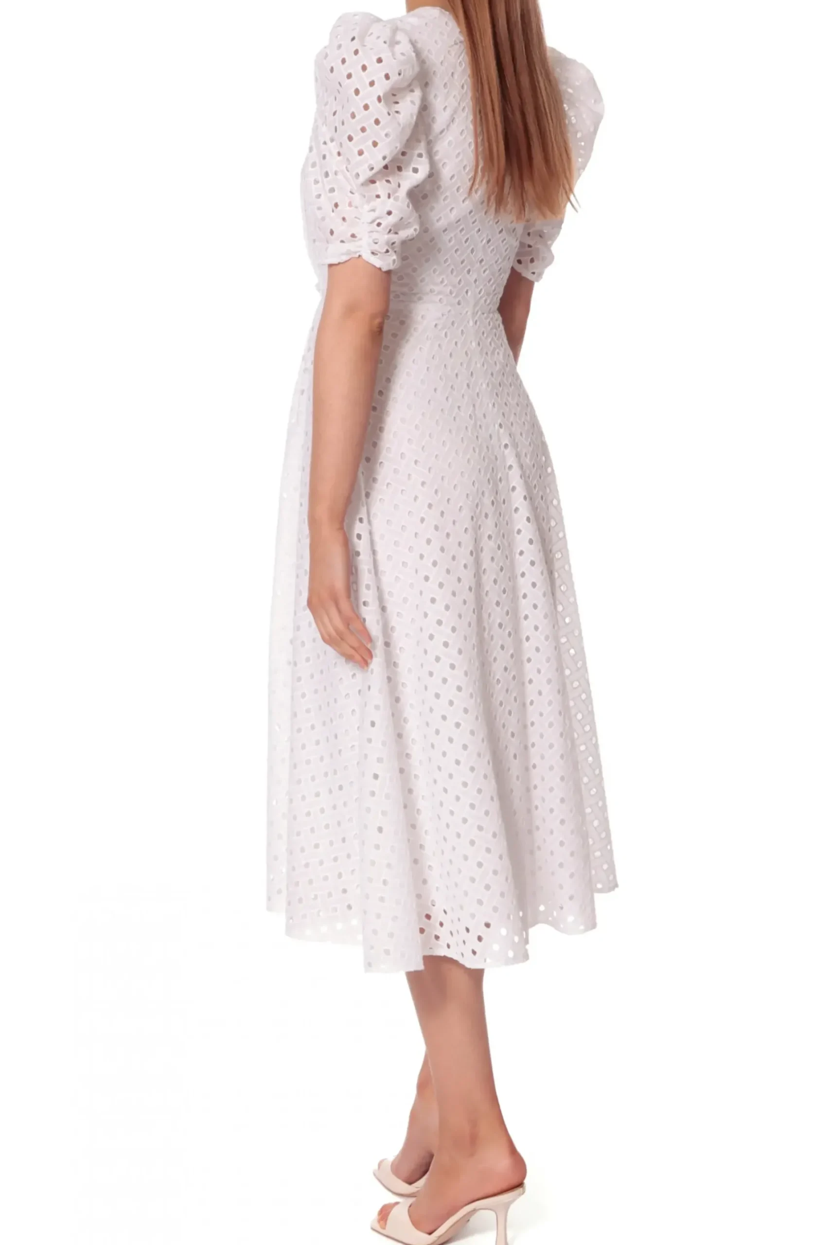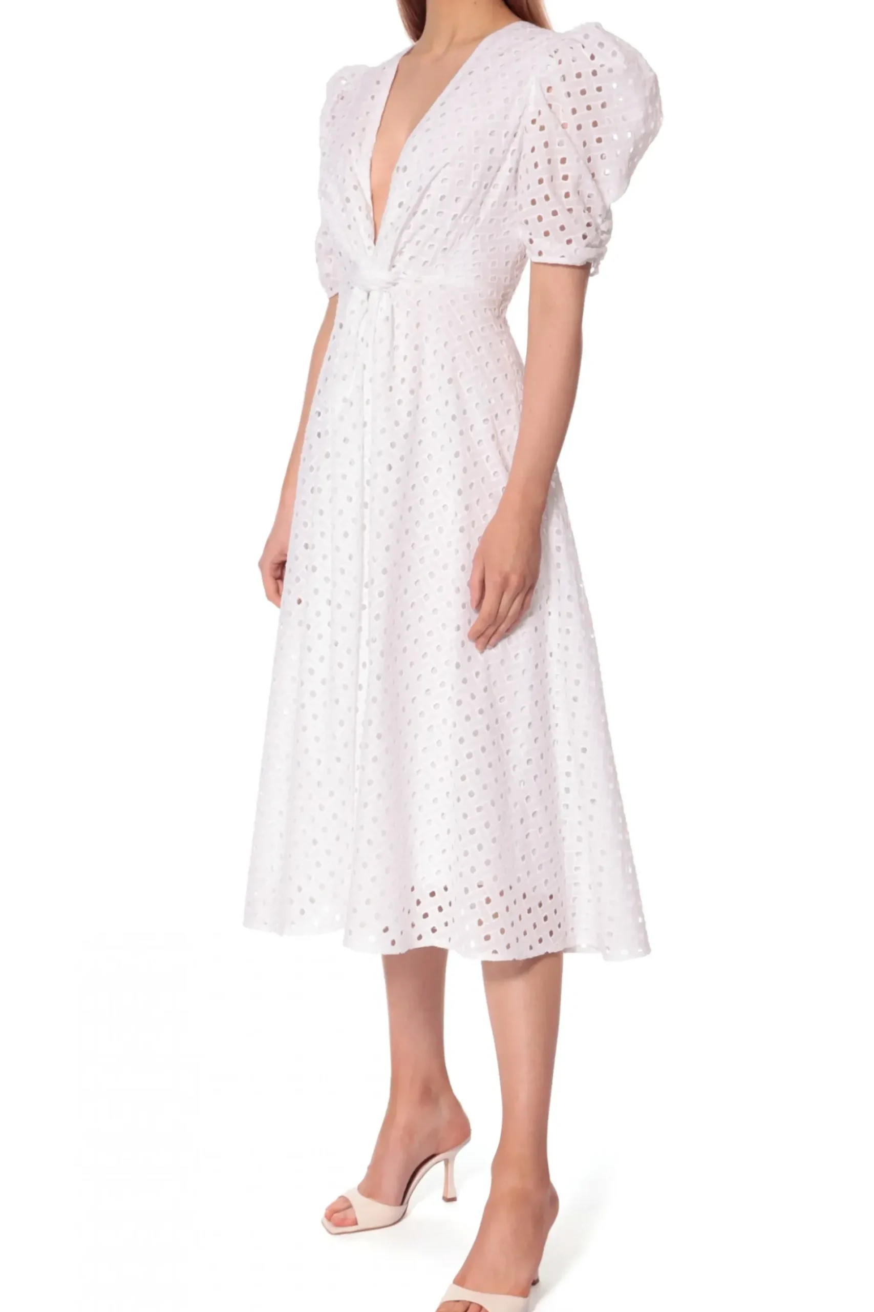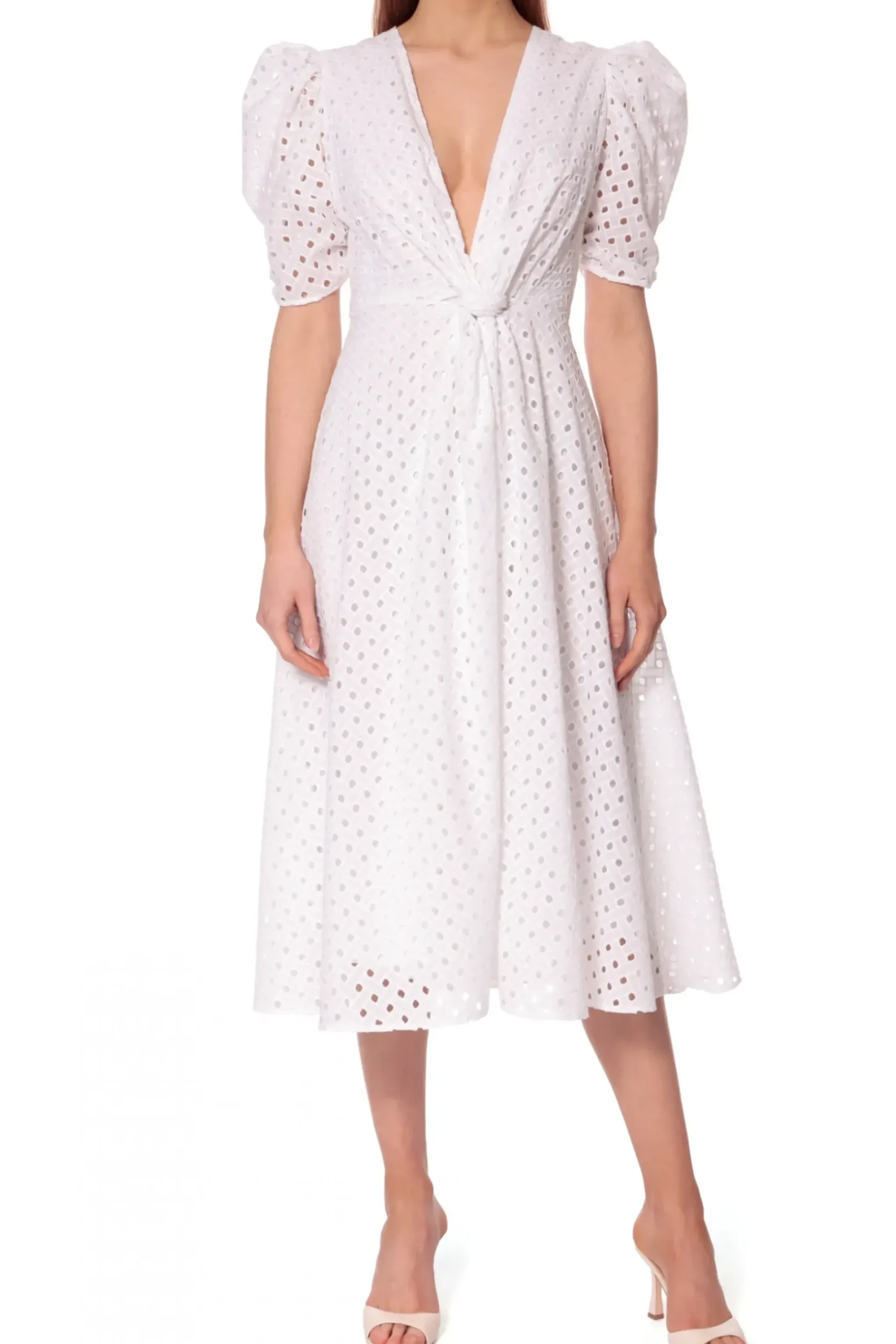 Efektowna I Elegancka – Haftowana Sukienka Midi Uszyta Z Bawelny. Zdecydowany Charakter Projektu Tworza: Gleboki Dekolt, Nastroszone Bufki I Ozdobny Supel W Talii. Wykonczona Podszewka Z Bawelnianego Woalu. W Zestawieniu Z Delikatnymi Czolenkami Nabiera Subtelnego I Wizytowego Charakteru. Noszona Z Botkami Kowbojskimi Tworzy Letnia Stylizacje W Klimacie Boho.