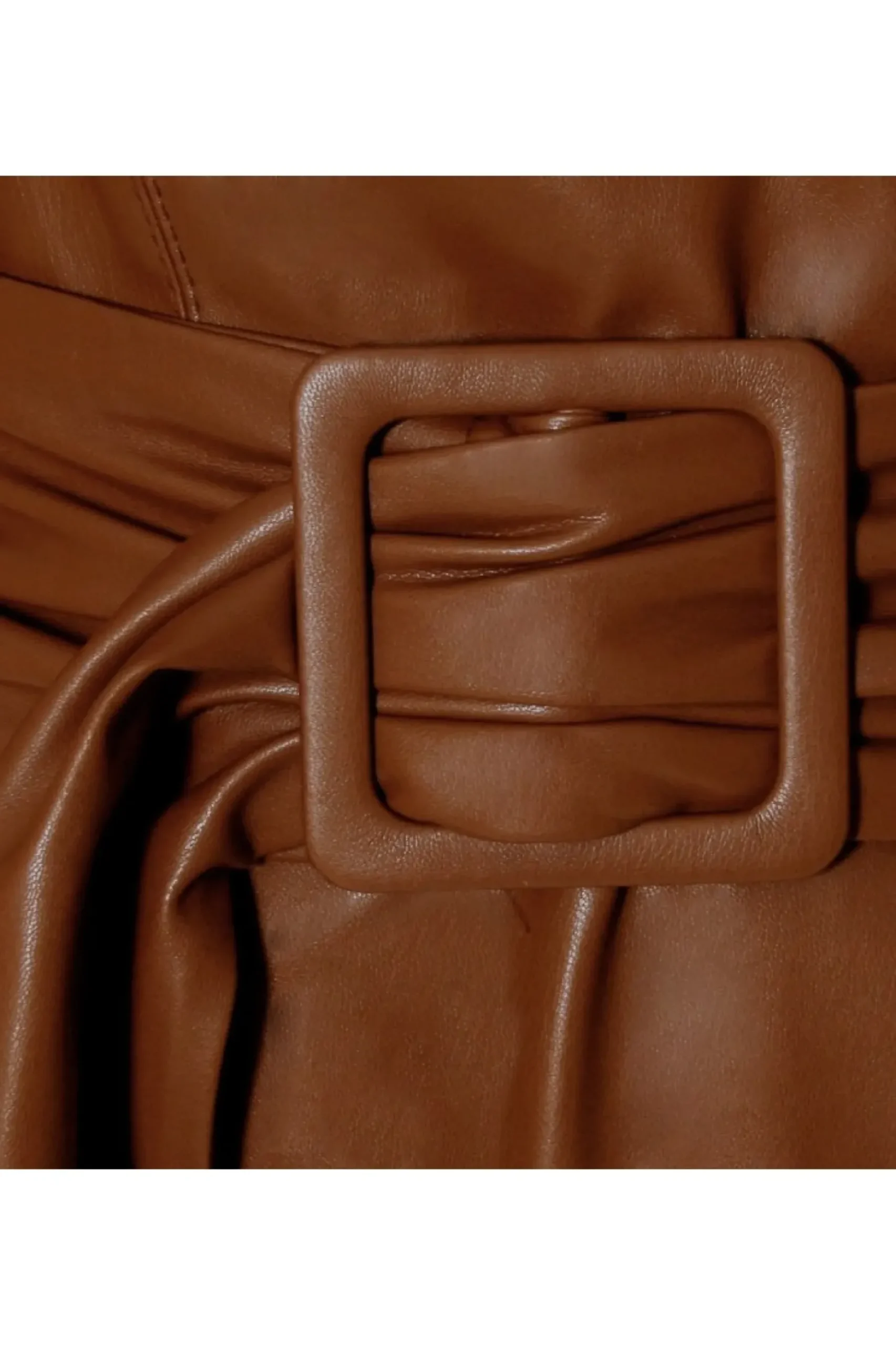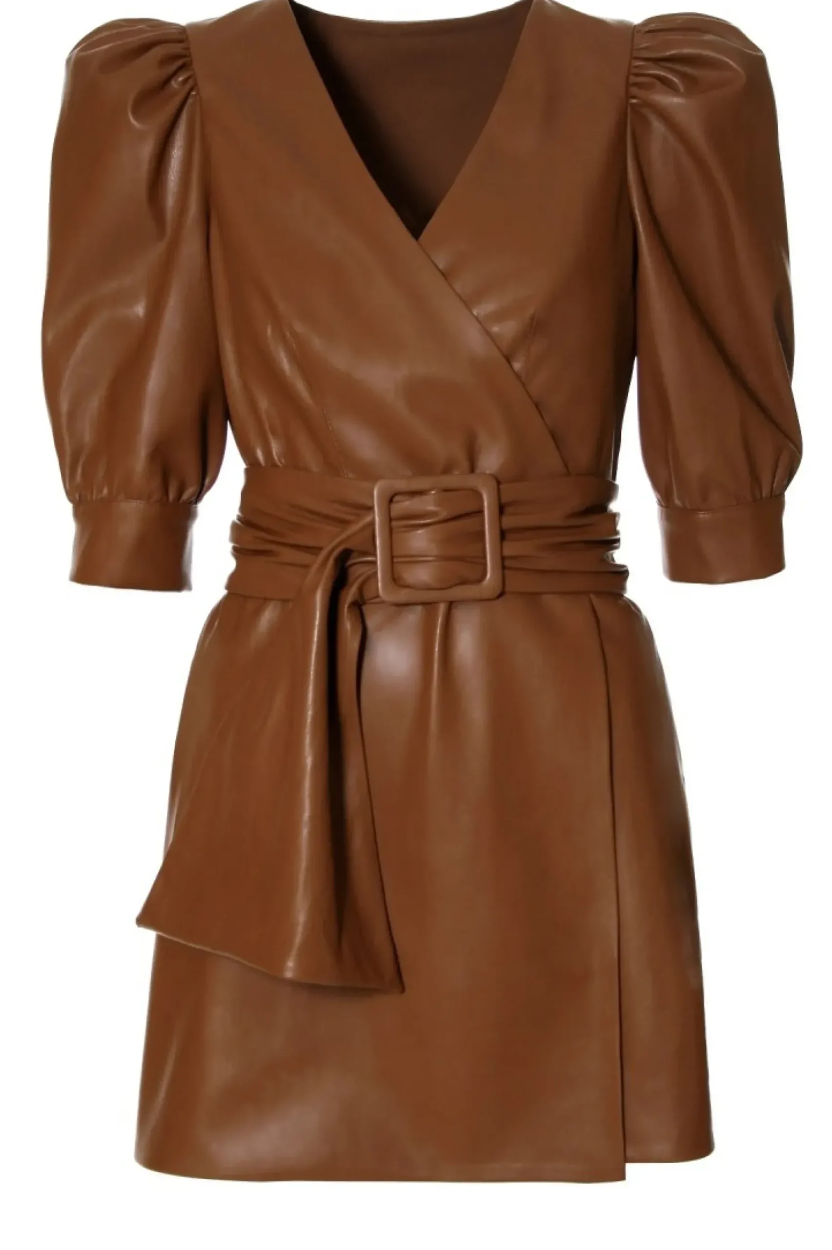 Kopertowa Sukienka Mini Wykonana Z Delikatnej W Dotyku I Miekko Ukladajacej Sie Skory Weganskiej. Rekawy Marszczone W Duze Bufy Zebrane Nad Lokciem W Mankiet Zapinany Na Oblekane Guziki. Talia Podkreslona W Spektakularny Sposob Szerokim Drapowanym Paskiem Z Oblekana Klamra. Calosc Na Zorzetowej Podszewce. Wystylizuj Ja Z Martensami Lub Wysokimi Kozakami.