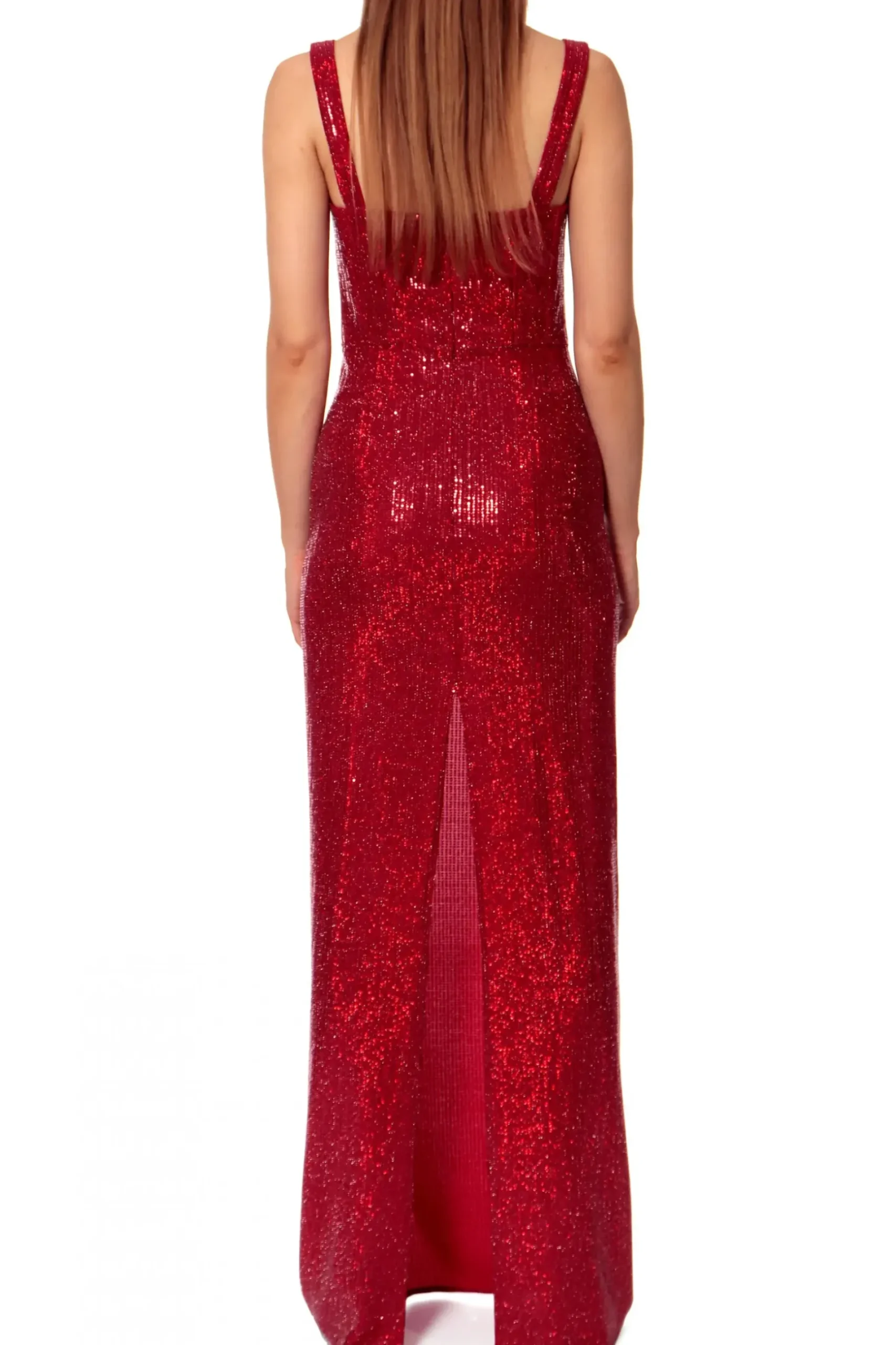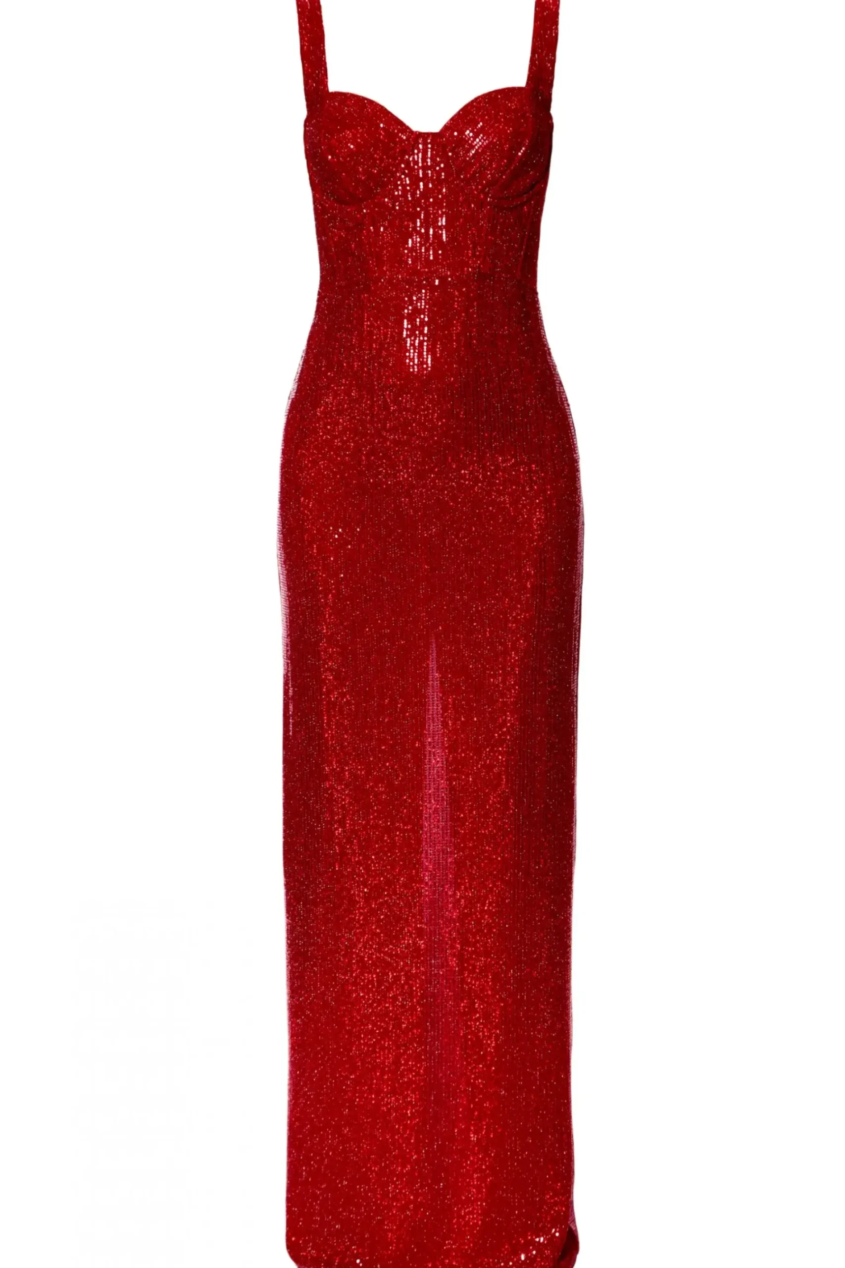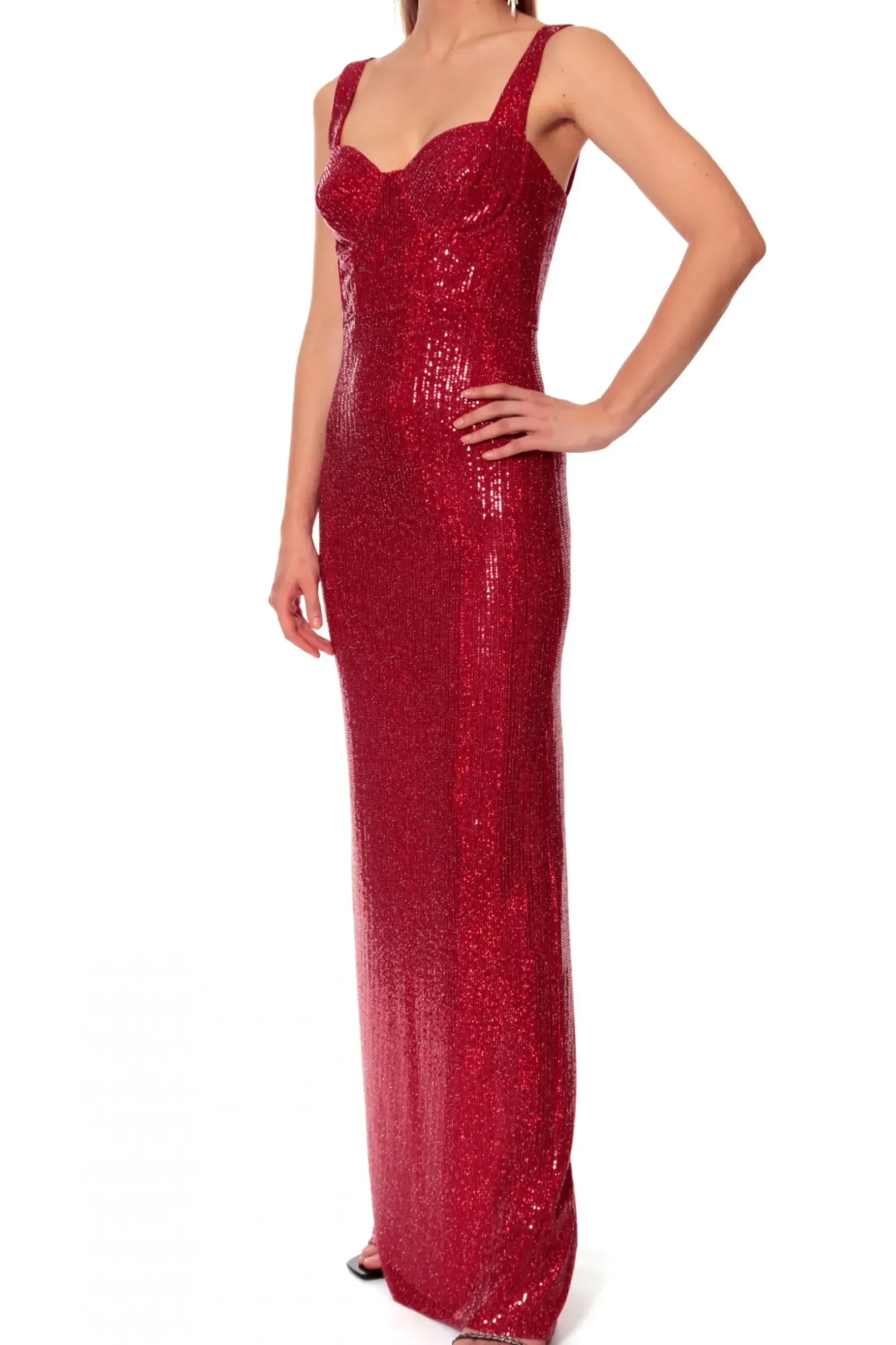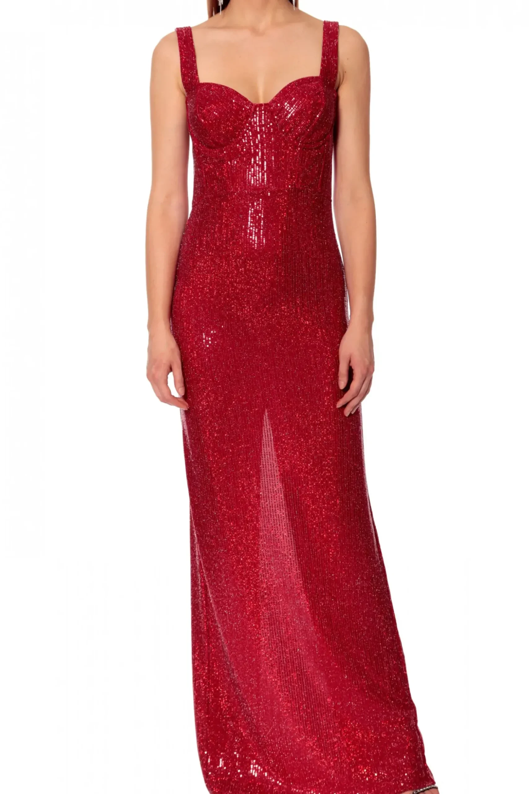 Wieczorowa Sukienka Maxi W Intensywnym Czerwonym Kolorze. Wykonana Z Elastycznego Materialu Z Metaliczna Nicia Pokrytego Polyskujacymi Pajetkami. Misternie Skrojony I Wymodelowany Gorset Na Szerokich Ramiaczkach Podkresla Kobiece Walory. Prosty Dol Sukienki Z Wysokim Sensualnym Rozcieciem Z Tylu.