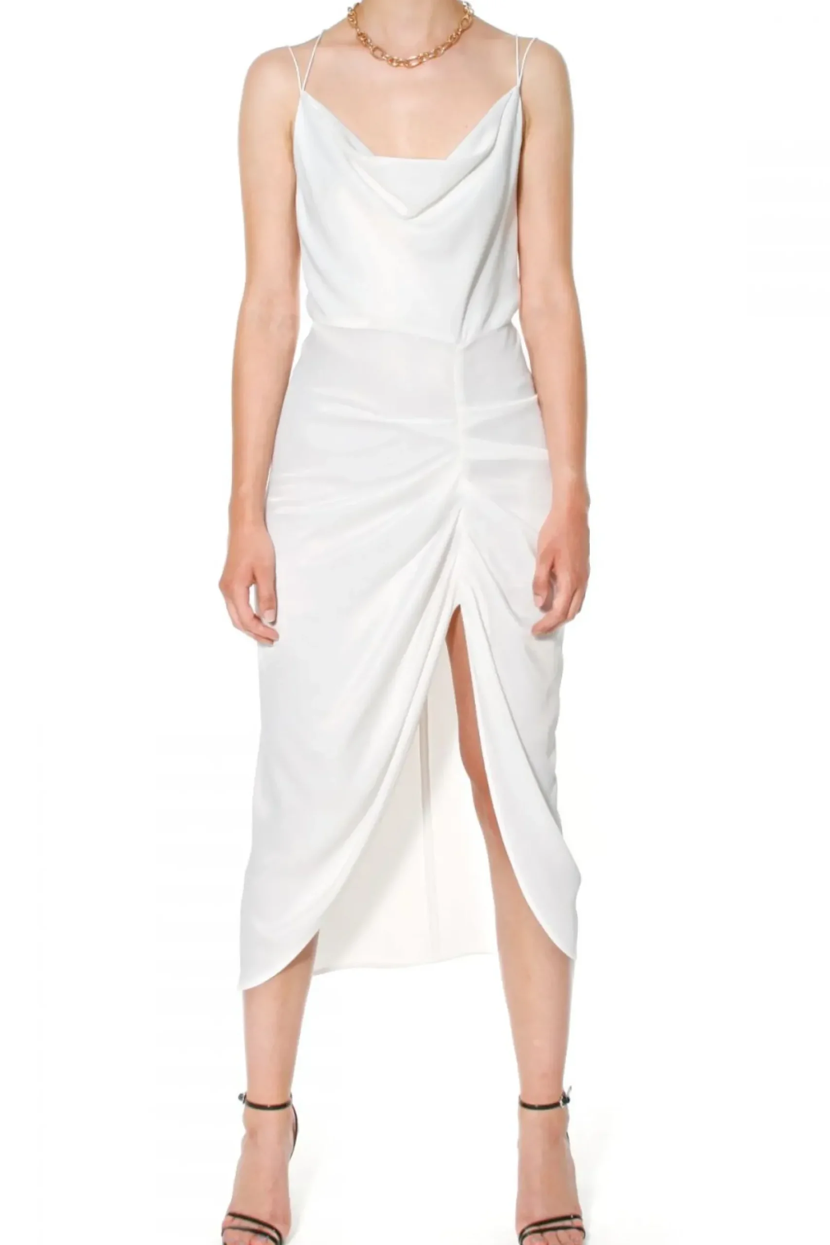 Spektakularny Projekt Wykonany Z Miesistego, Szlachetnego Atlasu. Drapowany Dekolt Utrzymany Cieniutkimi Ramiaczkami Typu Makaroniki Krzyzujacymi Sie Na Zmyslowo Odkrytych Plecach. Dlugosc Midi Przelamana Wysokim, Mocno Udrapowanym Peknieciem Na Lewym Udzie. Zestaw Sukienke Z Sandalami Na Wysokiej Szpilce I Mocna Bizuteria I Stworz Koktajlowy, Seksowny Look, Badz Przekornie Zaloz Do Niej Biale Sneakersy I Poczuj Sie Wyjatkowo Podczas Letniego Popoludnia.