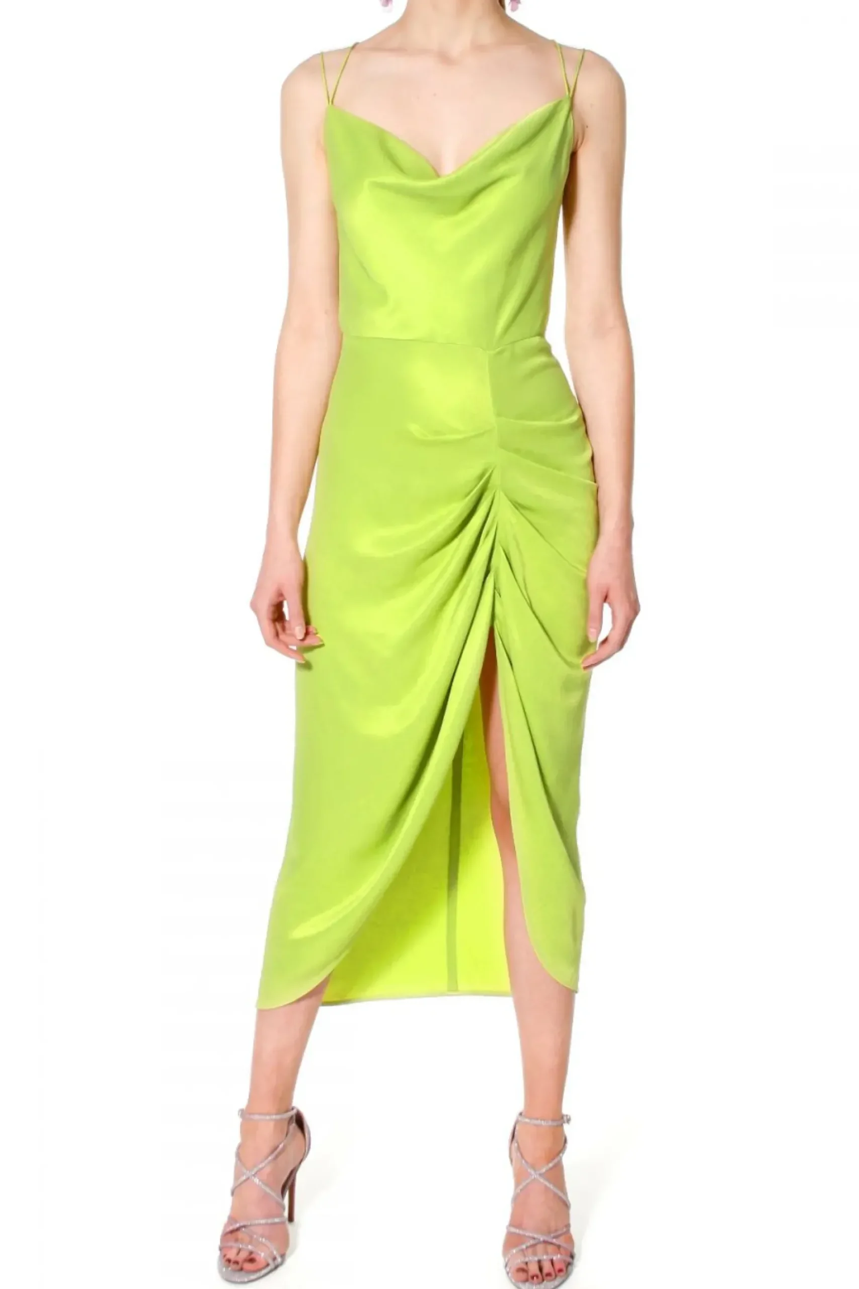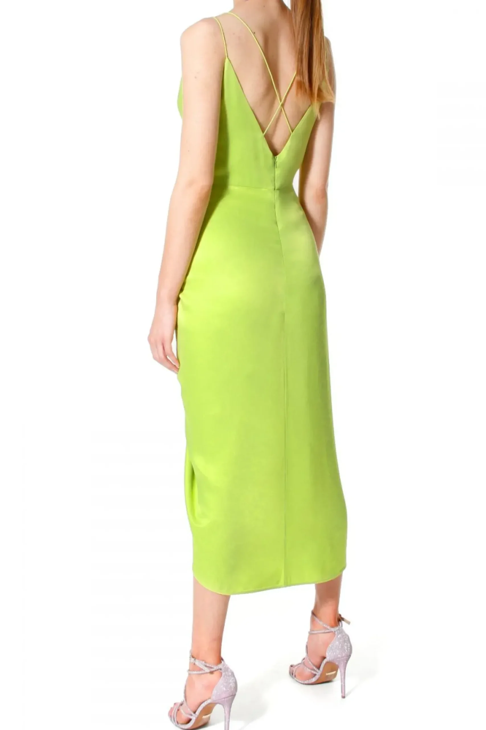 Spektakularny Projekt Wykonany Z Miesistego, Szlachetnego Atlasu. Drapowany Dekolt Utrzymany Cieniutkimi Ramiaczkami Typu Makaroniki Krzyzujacymi Sie Na Zmyslowo Odkrytych Plecach. Dlugosc Midi Przelamana Wysokim, Mocno Udrapowanym Peknieciem Na Lewym Udzie. Zestaw Sukienke Z Sandalami Na Wysokiej Szpilce I Mocna Bizuteria I Stworz Koktajlowy, Seksowny Look, Badz Przekornie Zaloz Do Niej Biale Sneakersy I Poczuj Sie Wyjatkowo Podczas Letniego Popoludnia.